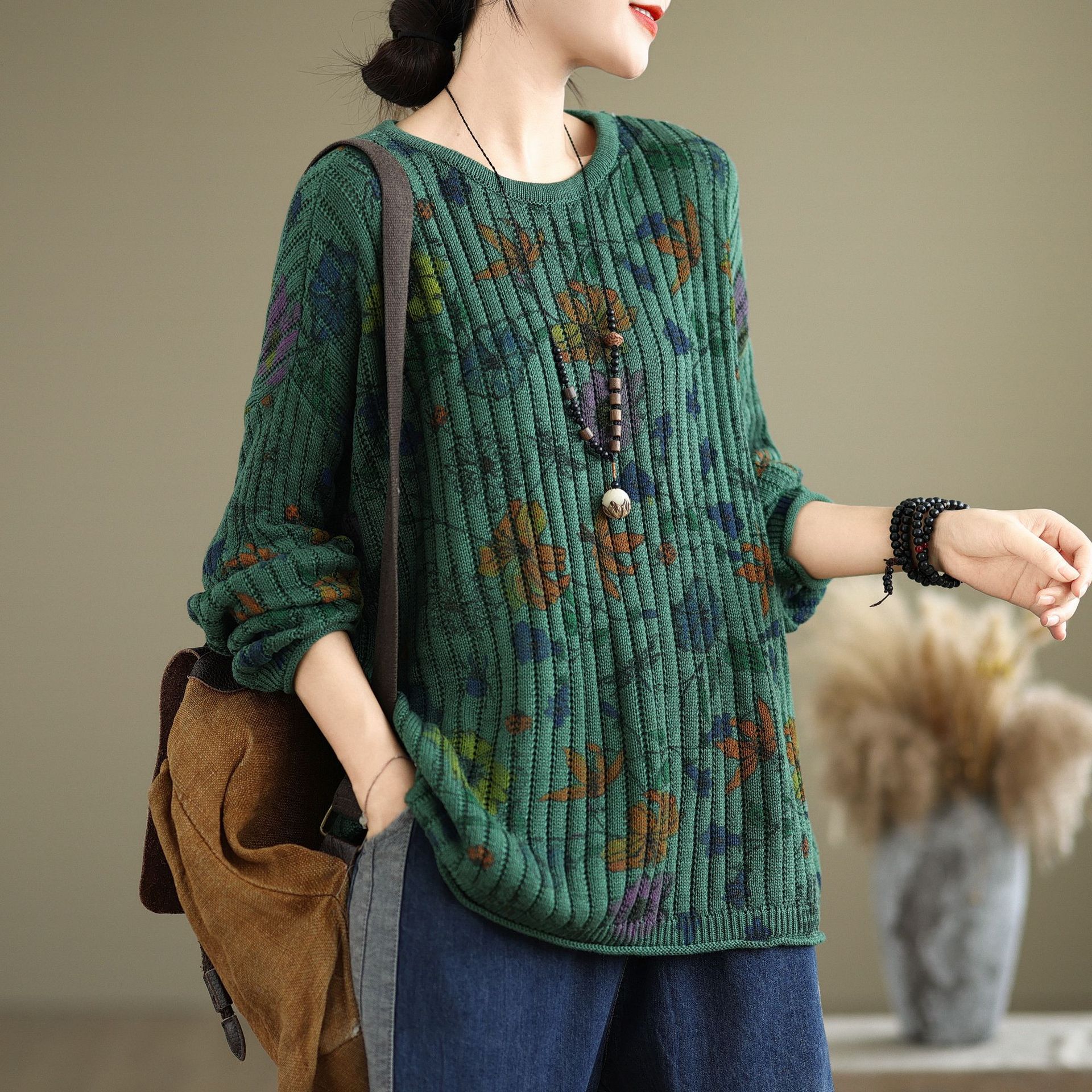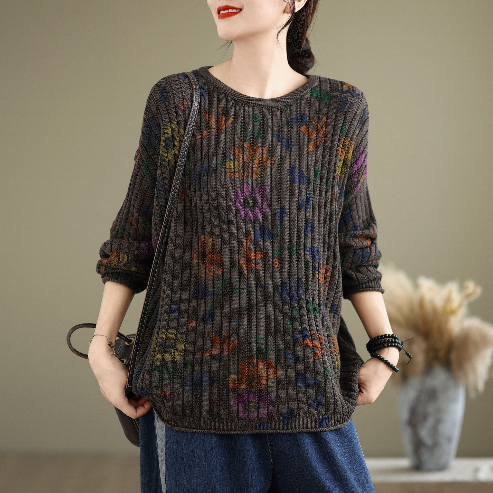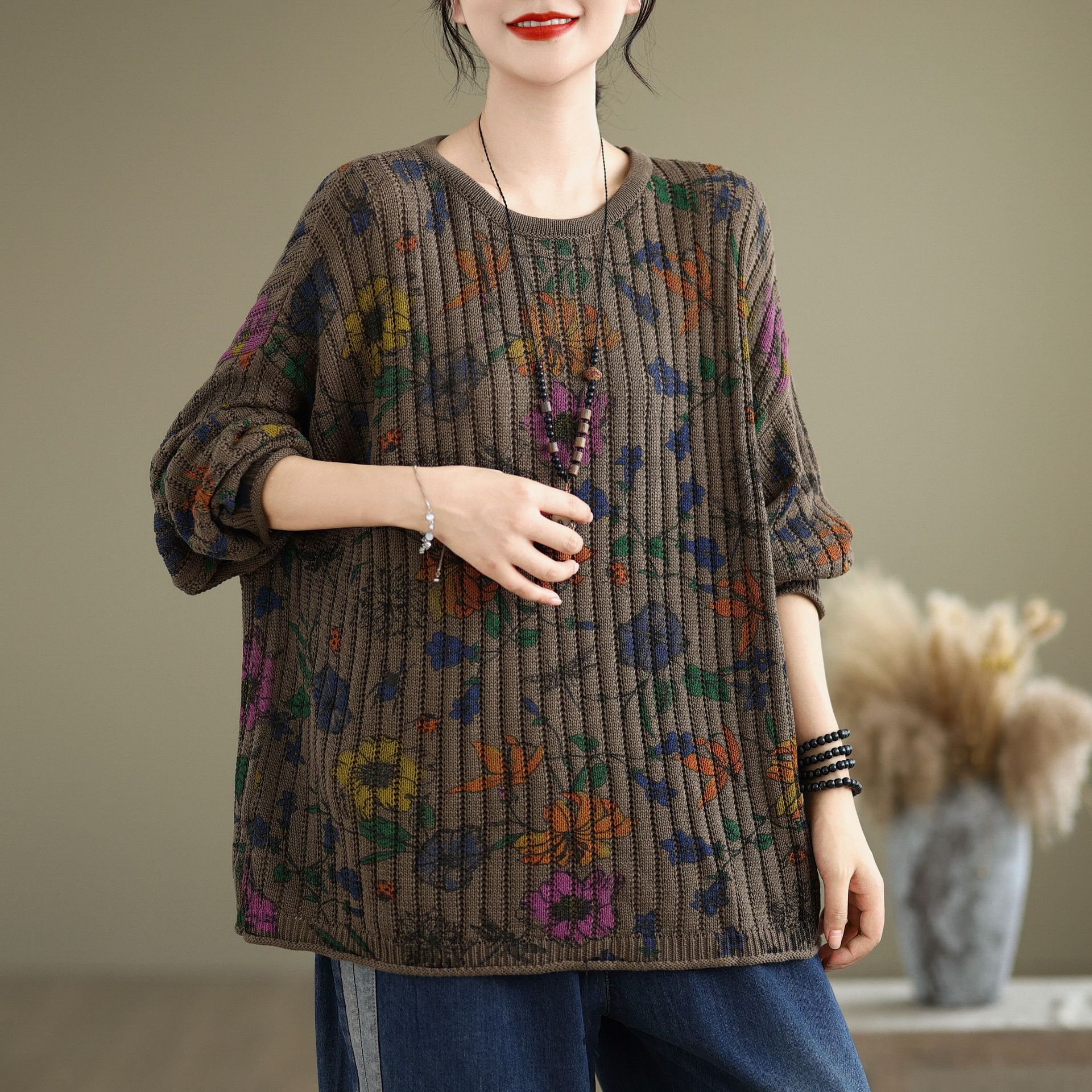 빈티지 꽃 인쇄 코튼 니트 스웨터 여성의 느슨한 플러스 사이즈 게으른 스타일 봄과 가을 세련된 풀오버 탑