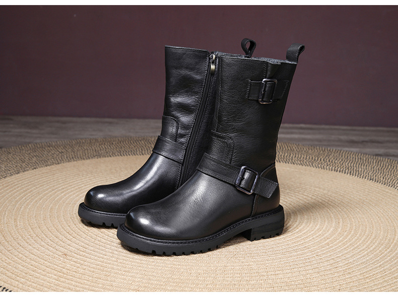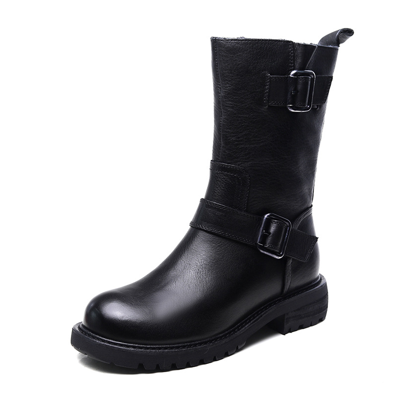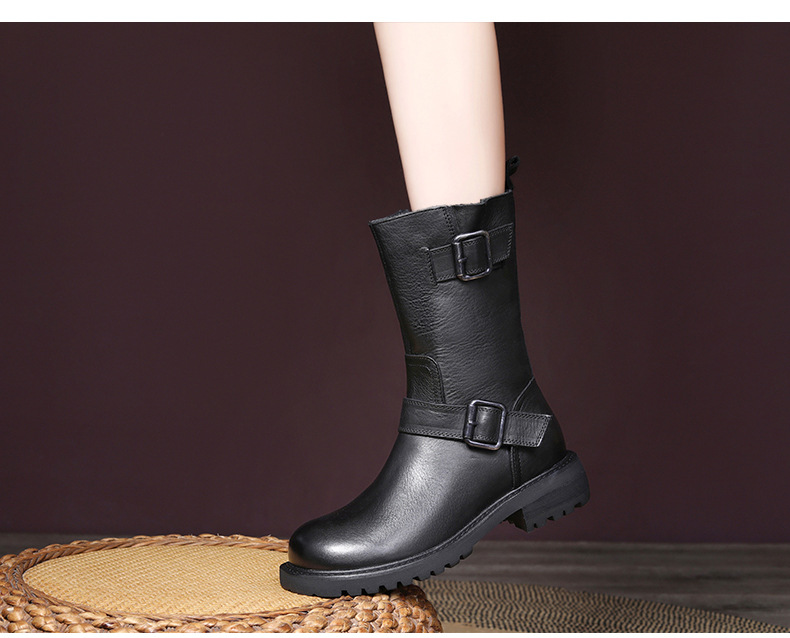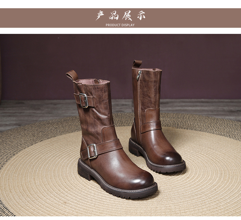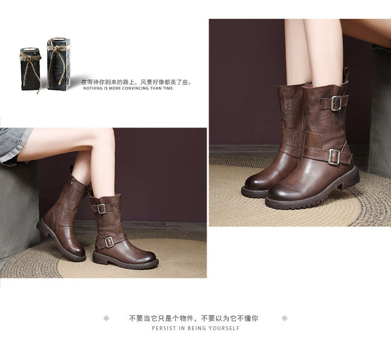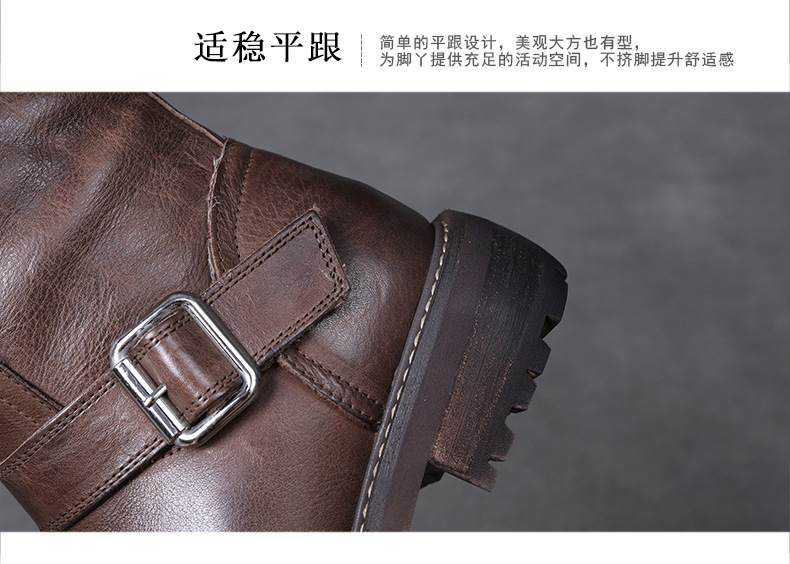 Delphiniums 24 가을과 겨울 새로운 스타일 높은 수준의 Cowhide 빈티지 캐주얼 미드 배럴 마틴 부츠 금속 버클 장식 스퀘어 힐 여성 신발