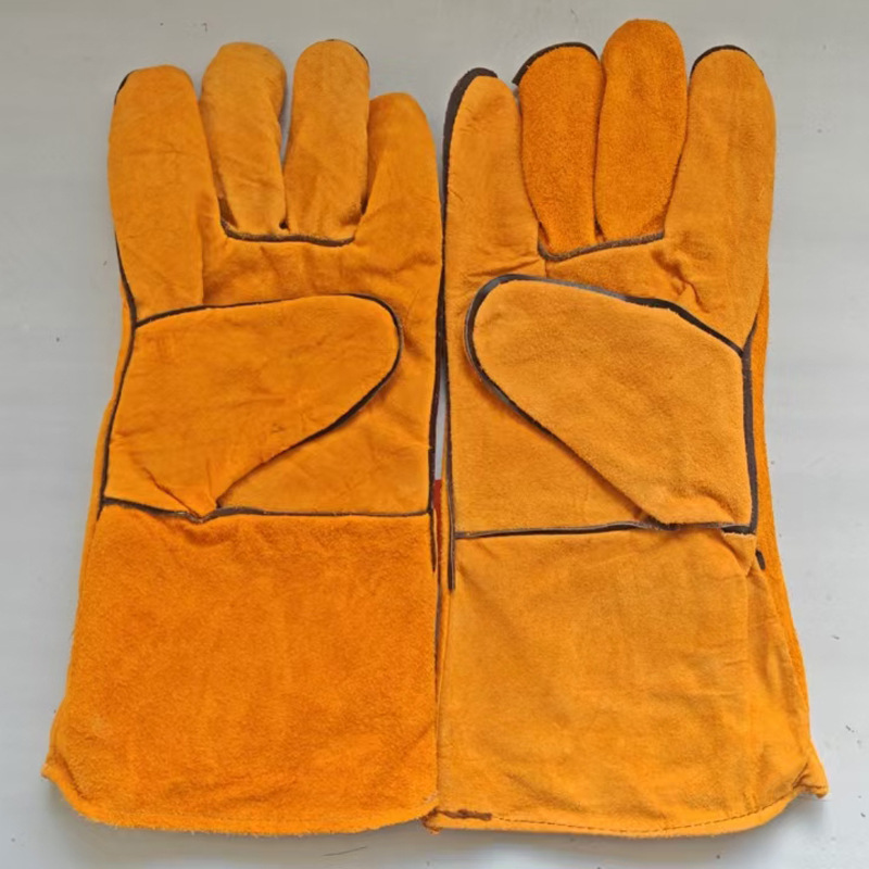 공장 재고 두꺼운 이중 층 고온 저항하는 cowhide 장갑 긴 튜브 전기 용접 내마모성 장갑 cowhide 노동 보호 장갑스토어 가기