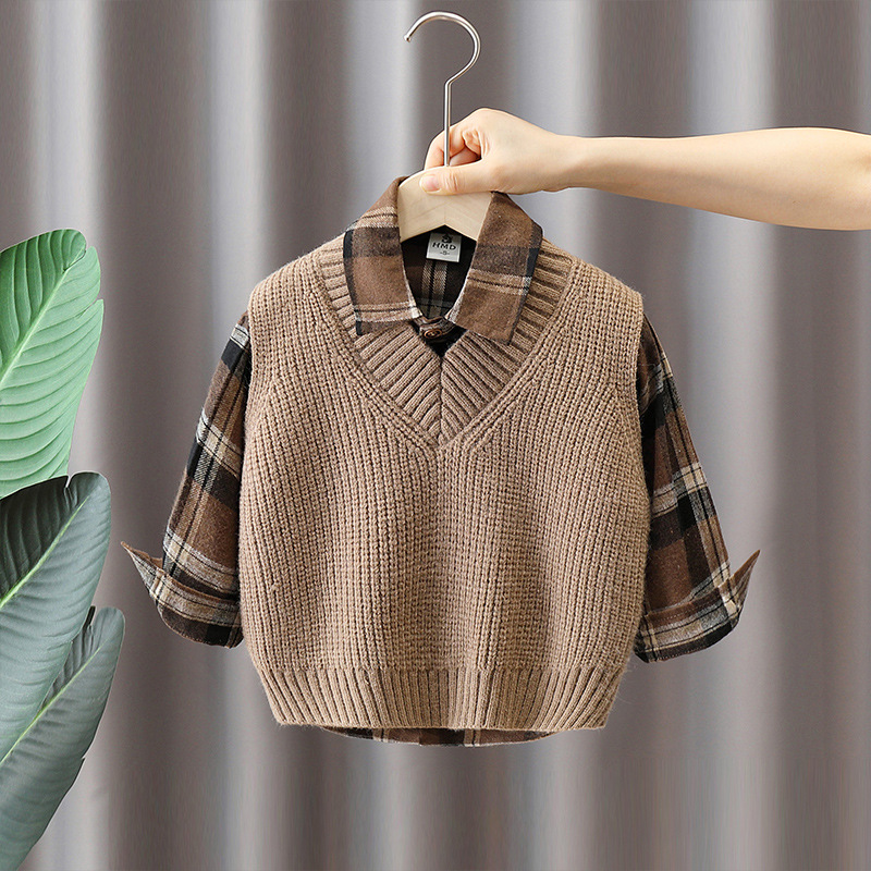 6102 소년 니트 조끼 세트 2024 년 새 어린이 한국 격자 무늬 셔츠 아기 봄과 가을 투피스 세트