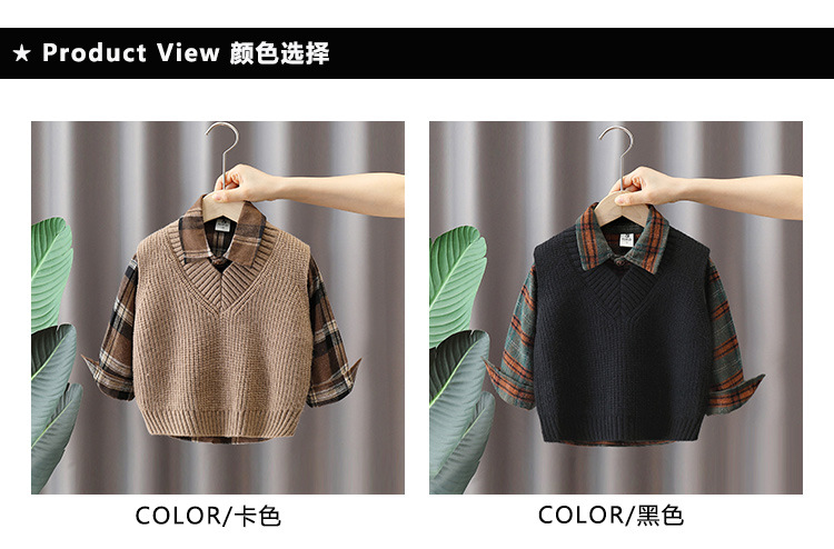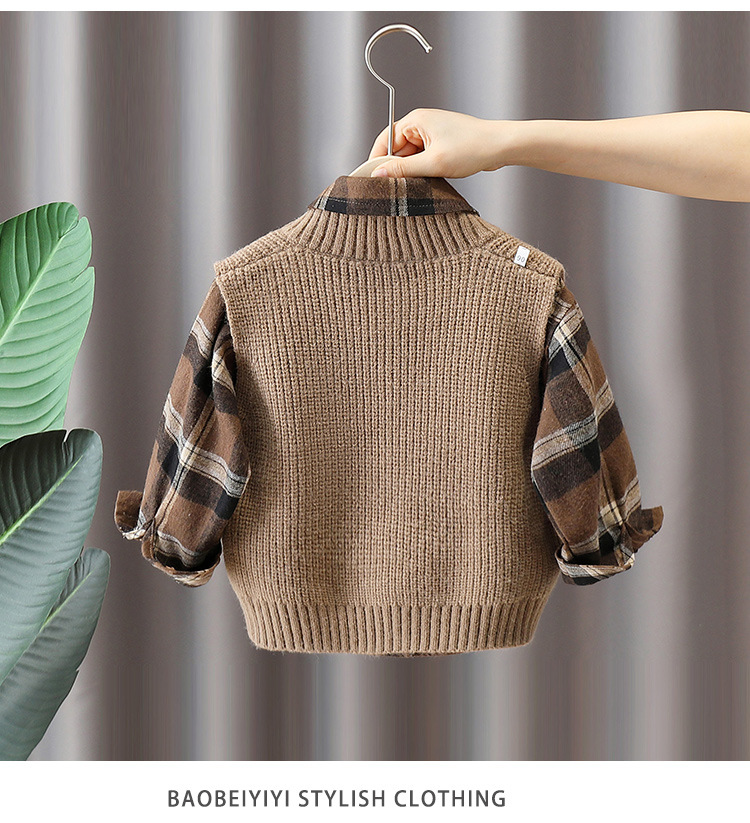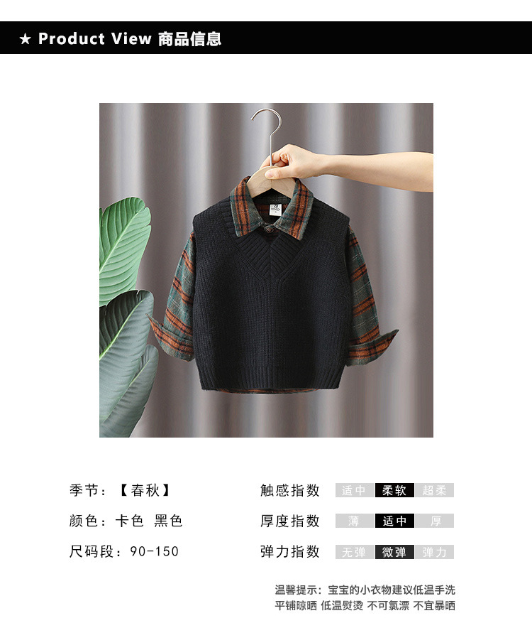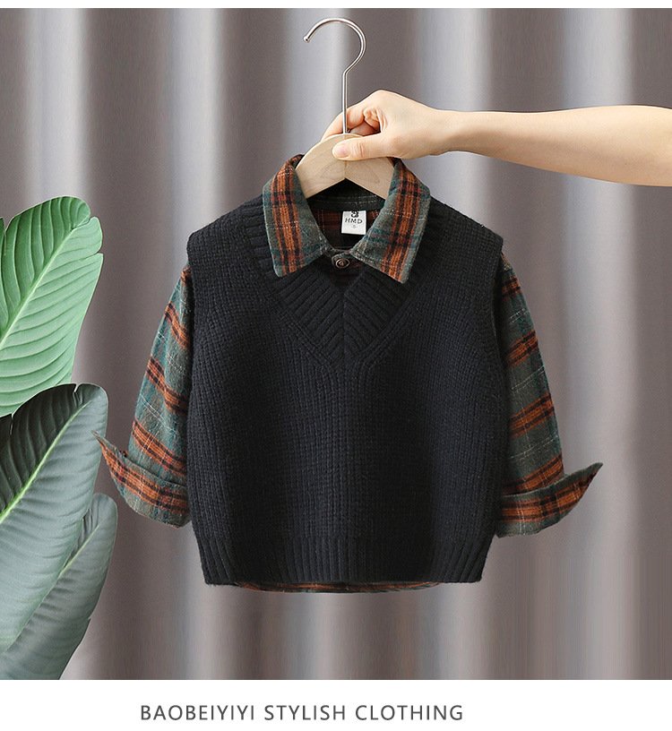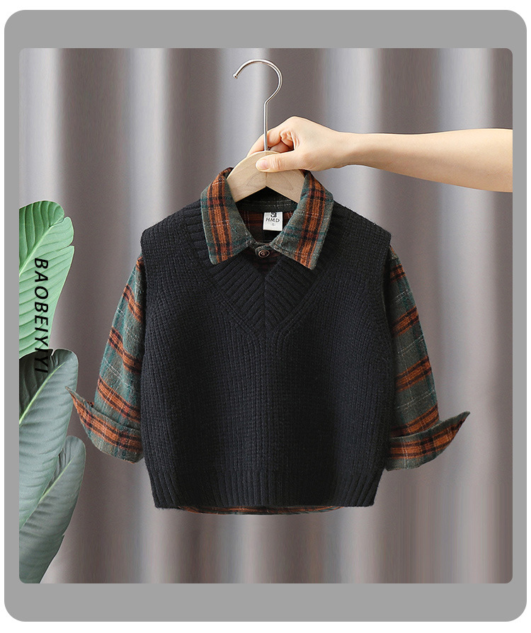 6102 소년 니트 조끼 세트 2024 년 새 어린이 한국 격자 무늬 셔츠 아기 봄과 가을 투피스 세트스토어 가기