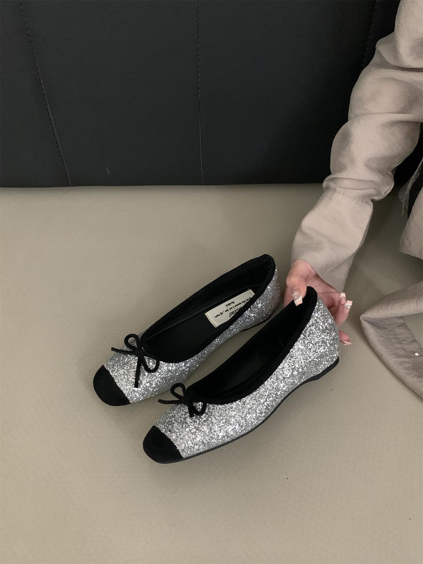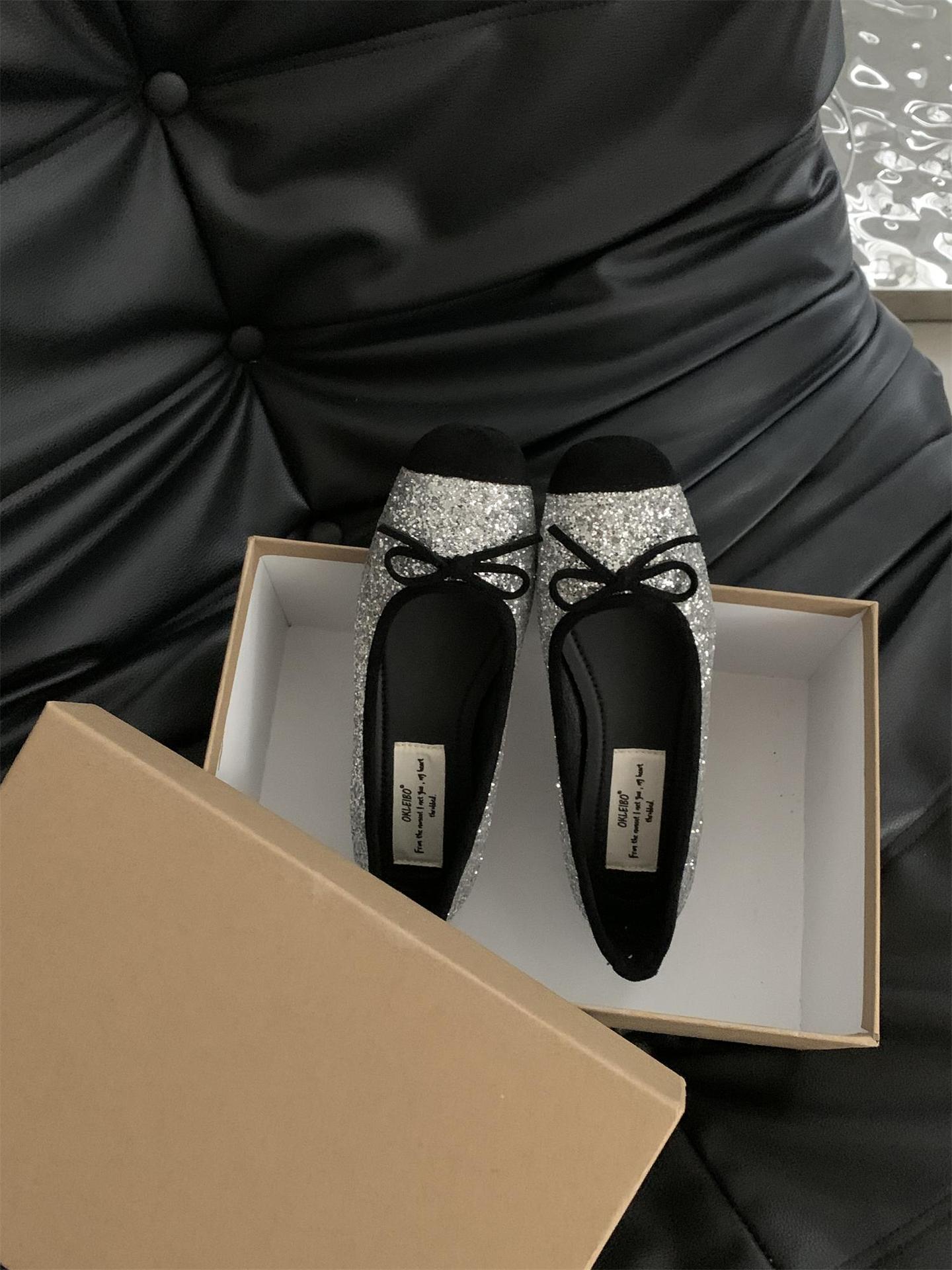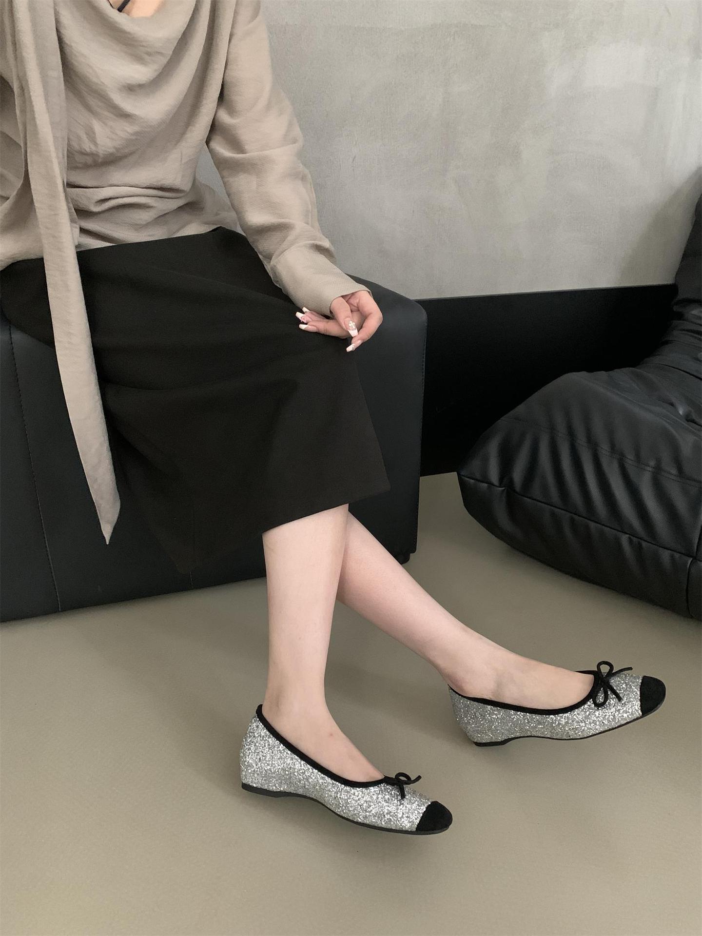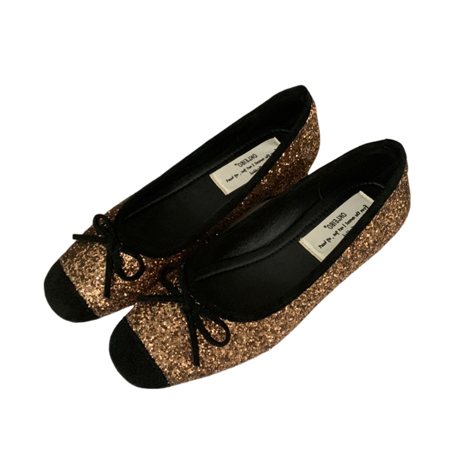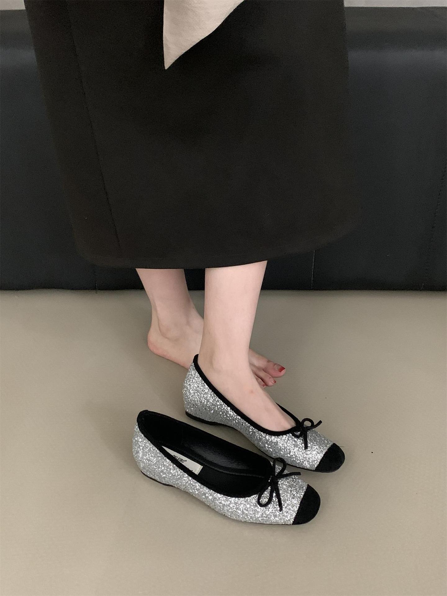 프렌치 스타일 반짝이 색상 배색 여성용 신발 2025 신상 리본 키높이 발레 슈즈 이브닝 웨딩 슈즈스토어 가기