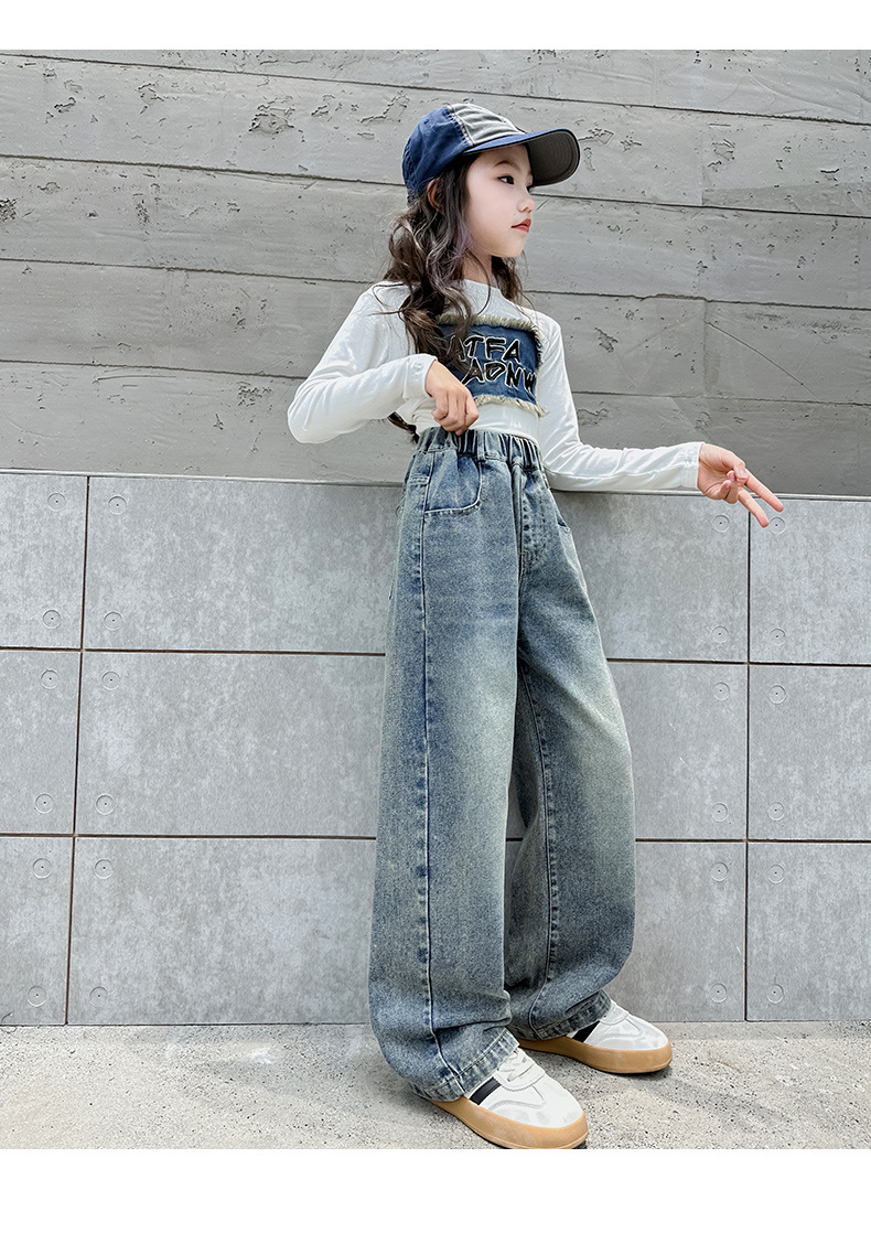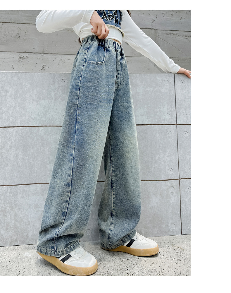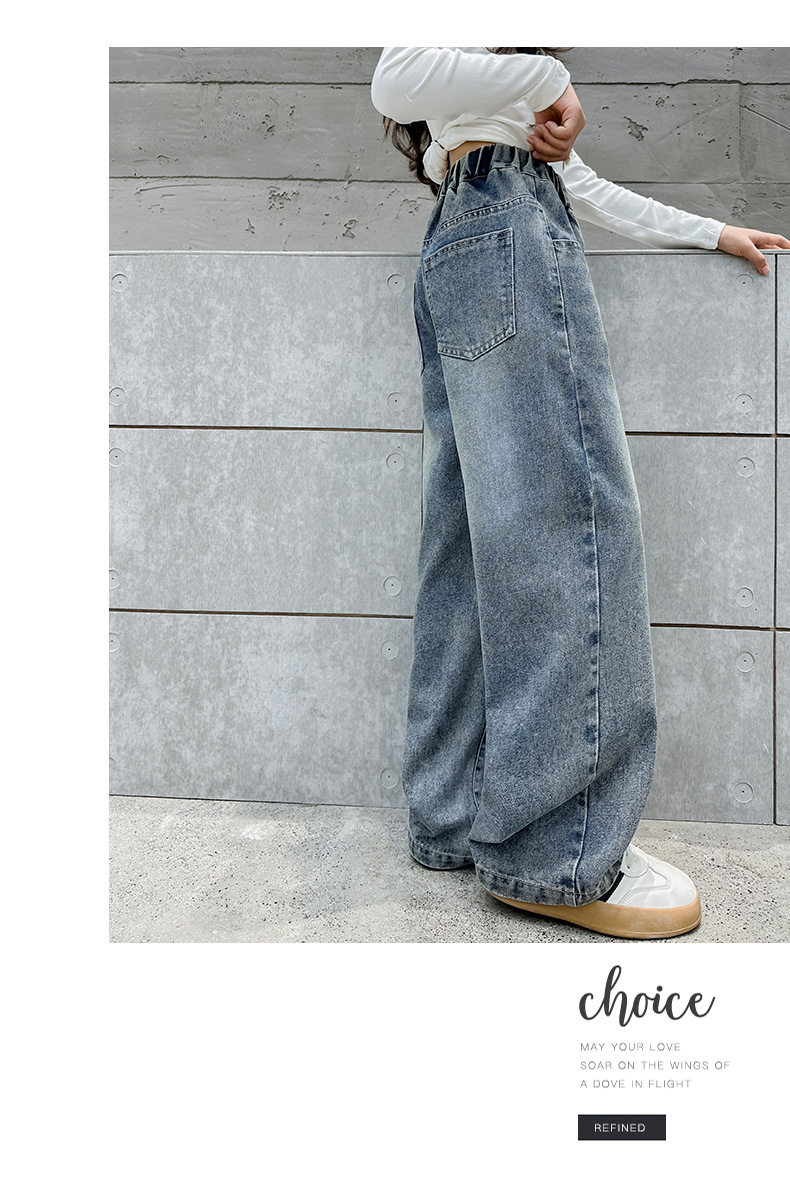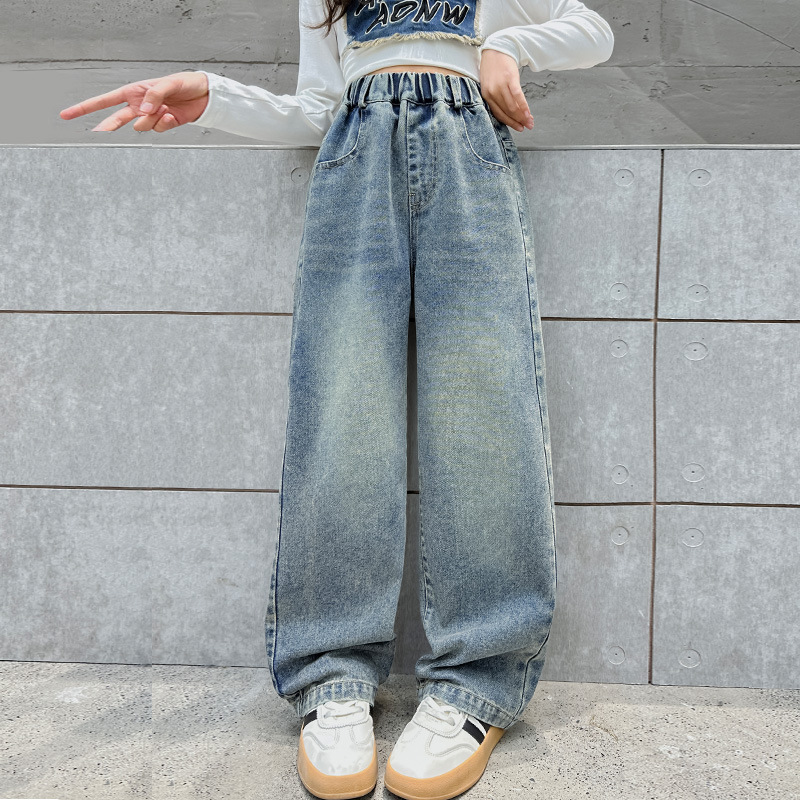 소녀 데님 넓은 다리 바지 간단한 바지 봄과 가을 2024 새로운 큰 어린이 느슨한 높은 허리 캐주얼 올 매치 바지스토어 가기