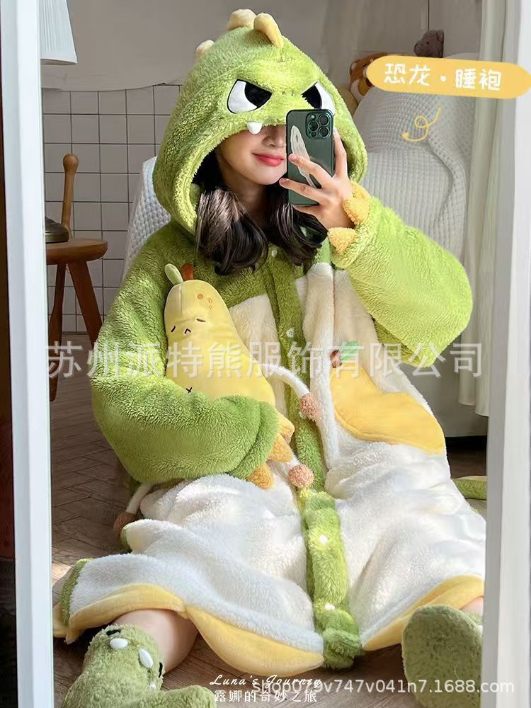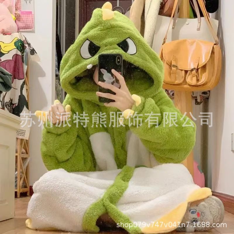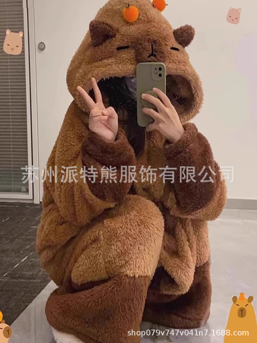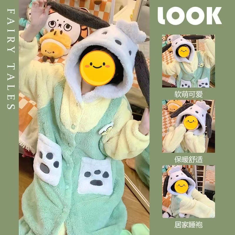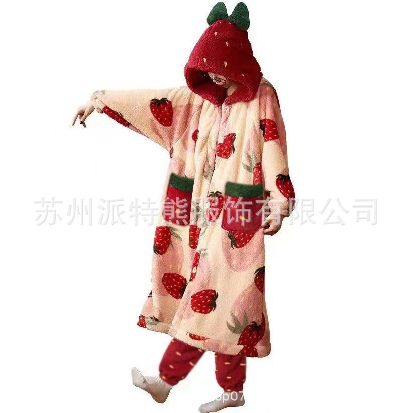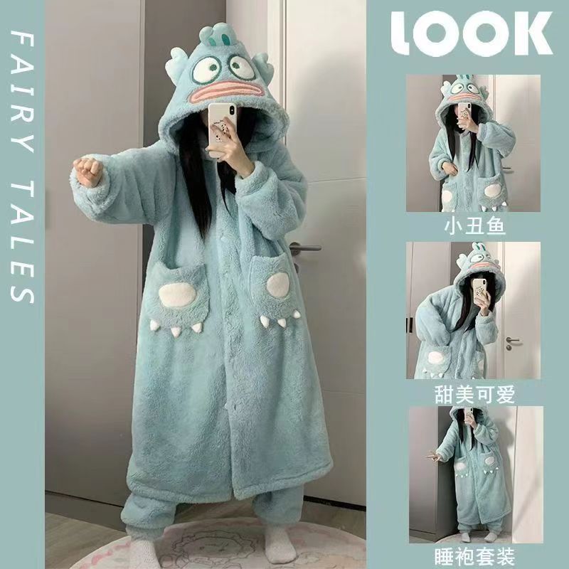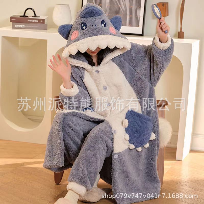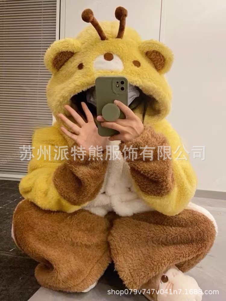 산호 양털 파자마 여성의 기모 가을 겨울 귀여운 만화 후드 커플 잠옷 스위트 홈 의류 대외 무역