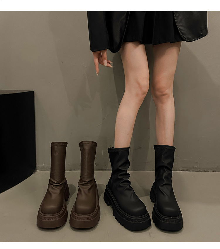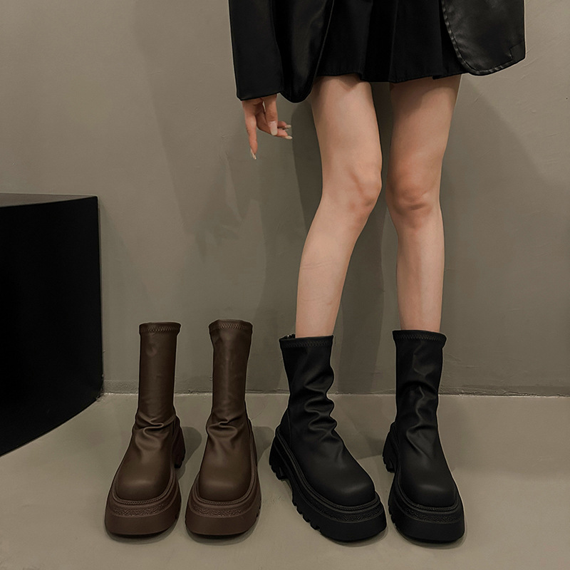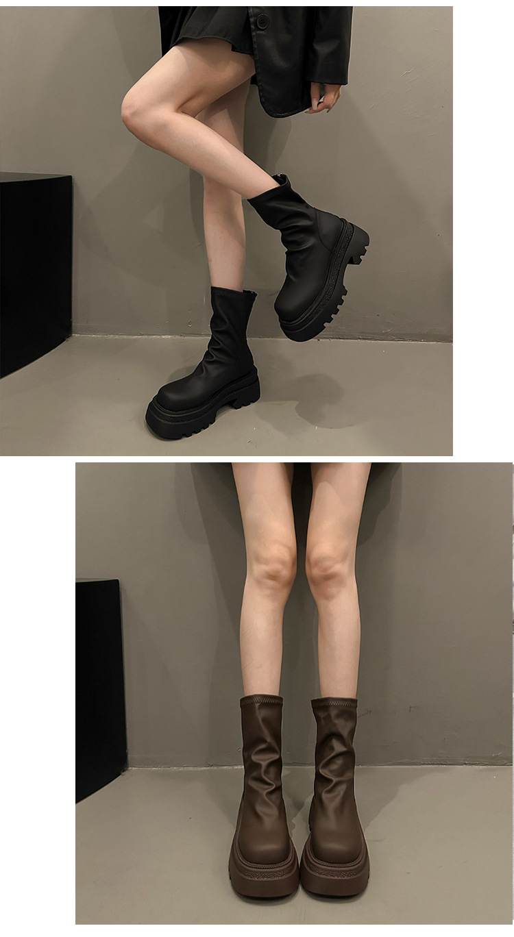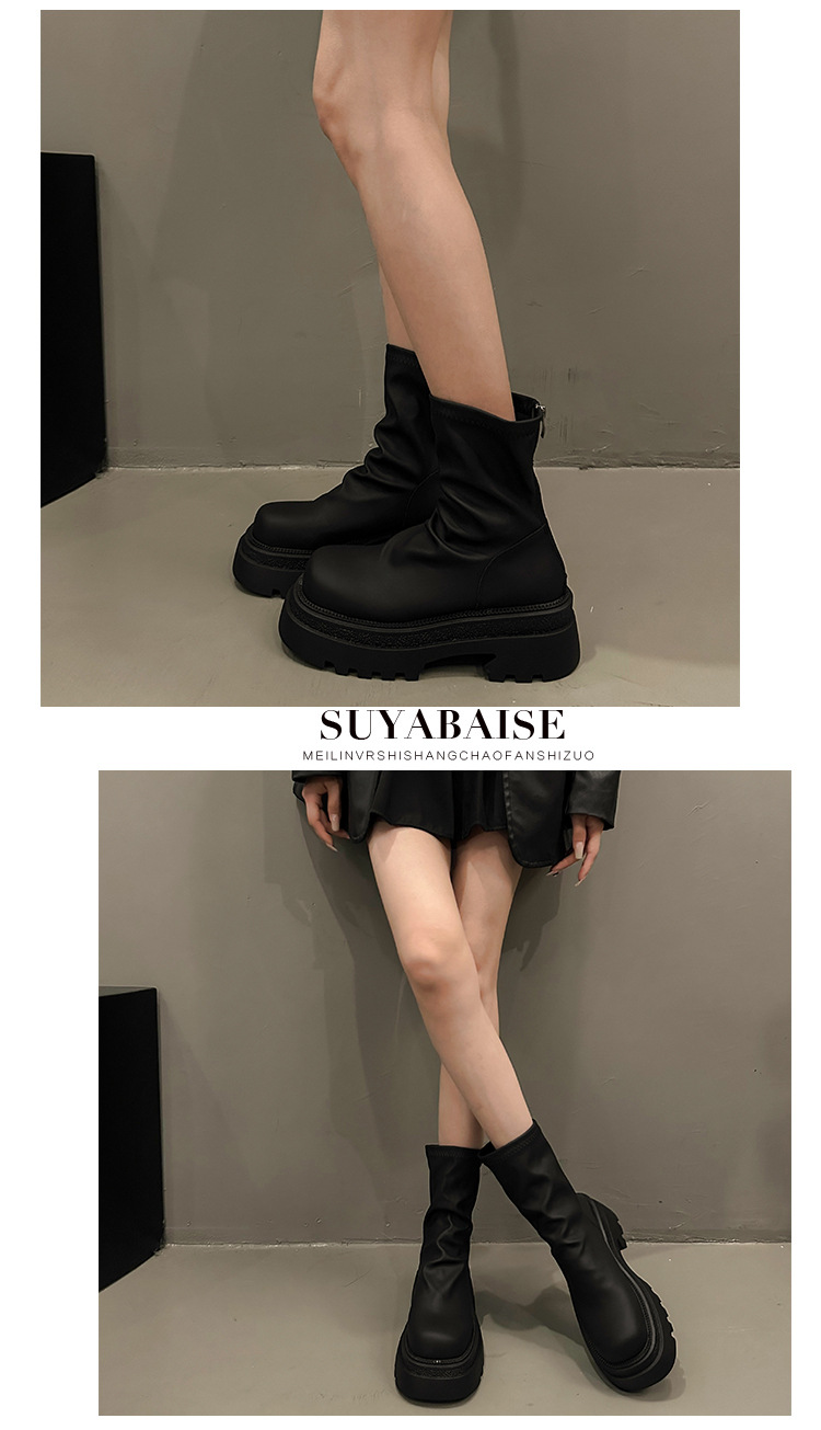 두꺼운 힐 발목 부츠 여성의 2024 가을 및 겨울 새로운 두꺼운 바닥 주름 더미 부츠 작은 남성 유행 슬리밍 스트레치 얇은 부츠스토어 가기