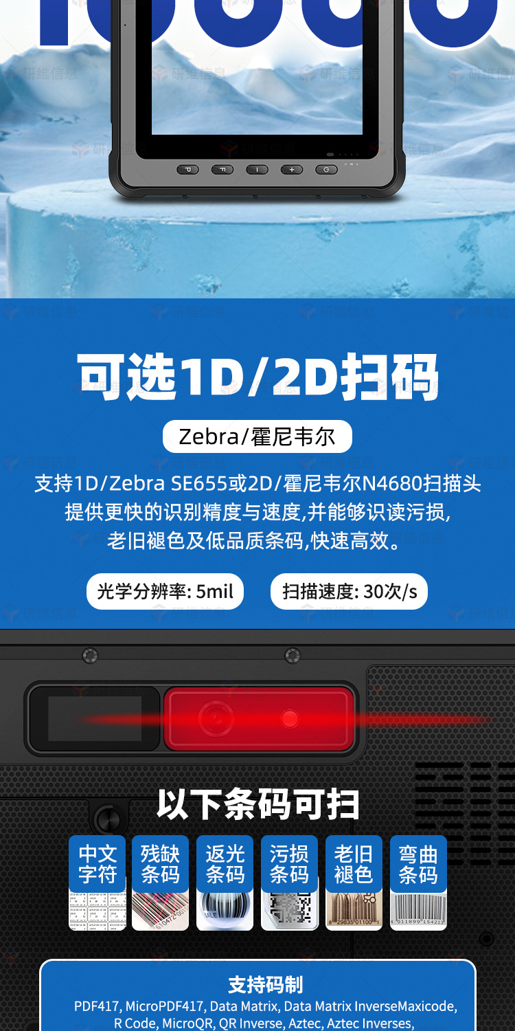 4:额外付费定制硬件项目包含:扫描头、低频/高频/超高频RFID、航插接口、二代证识别、CAN接口、433lora模块、航插接口、zigbee、客供模块内置等;如您有定制需求,可联系研维在线客服,详细了解研维10年来为众多工业领域用户定制相关案例展示。