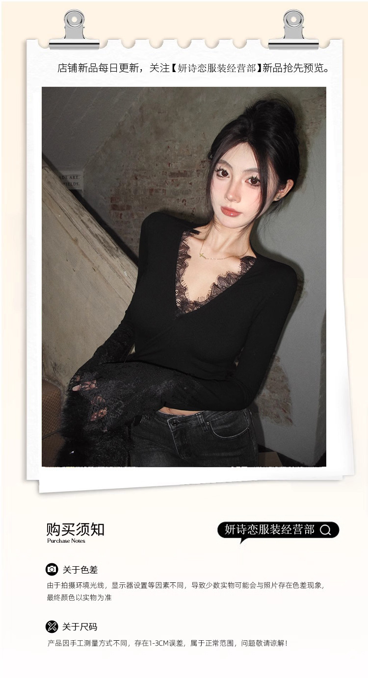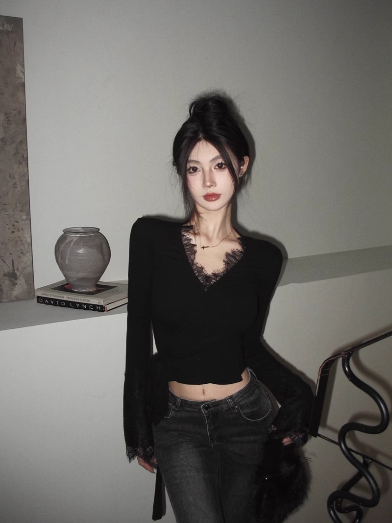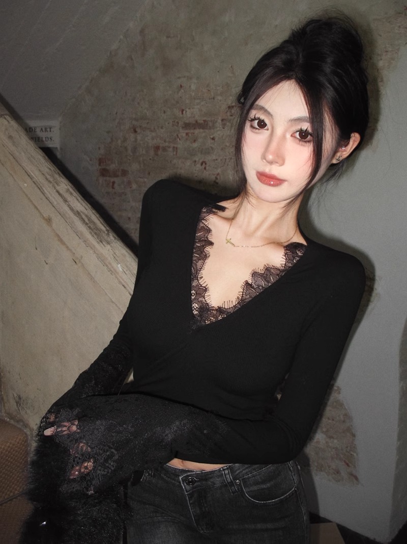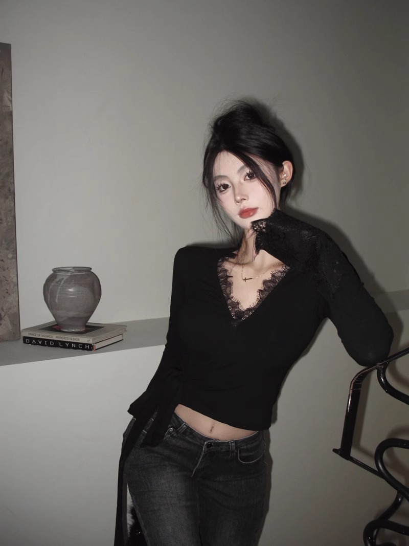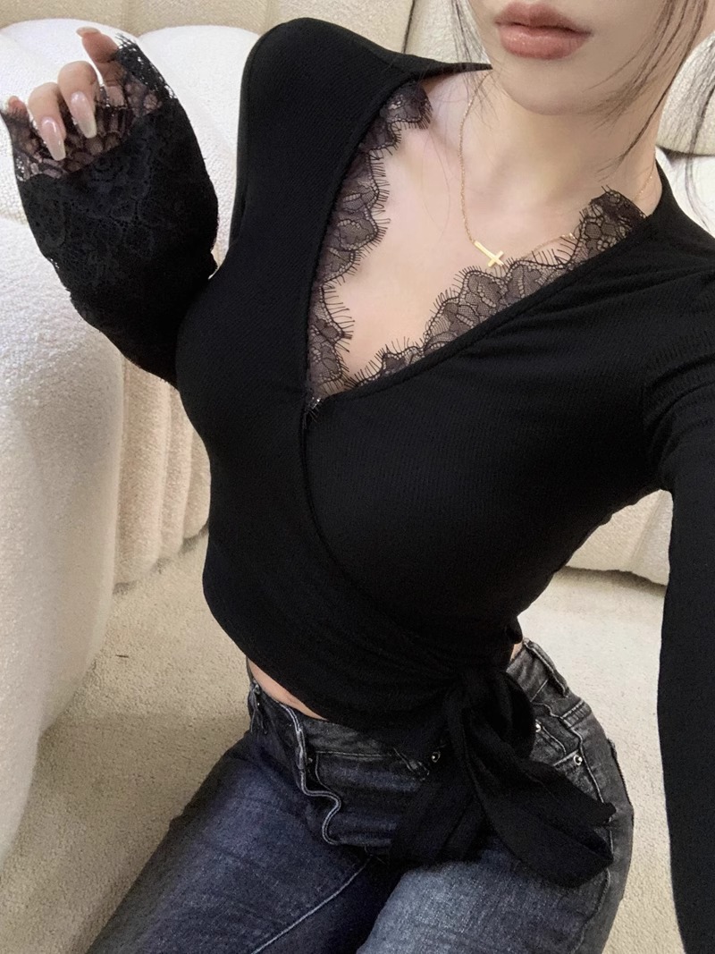 섹시한 레이스 바느질 긴팔 티셔츠 여성용 가을 핫 걸스 블랙 스트랩 내베이스 셔츠 슬림 핏 쇼트 탑