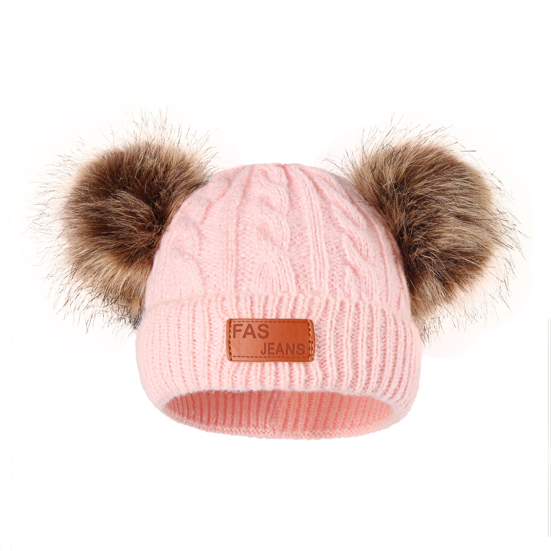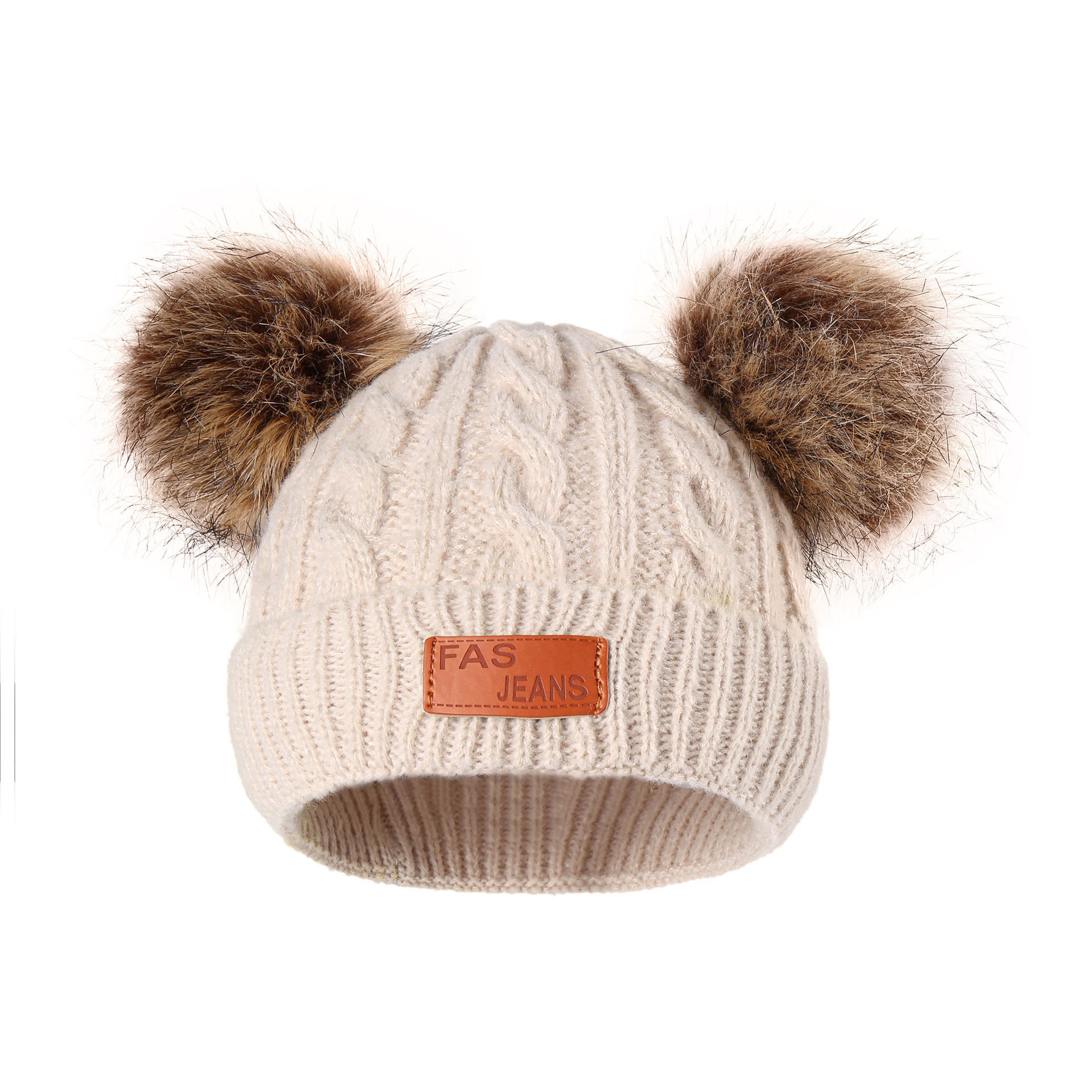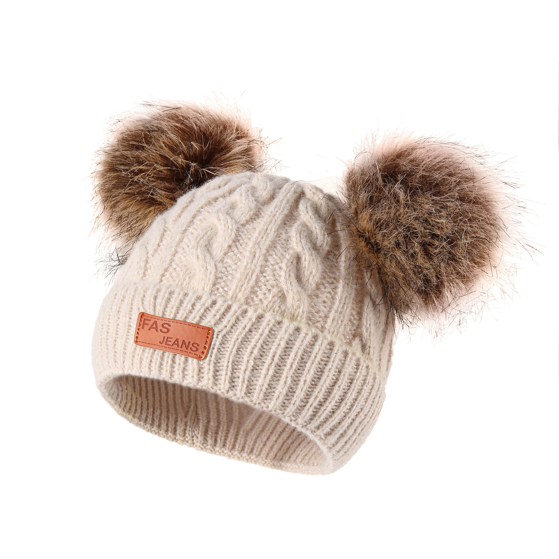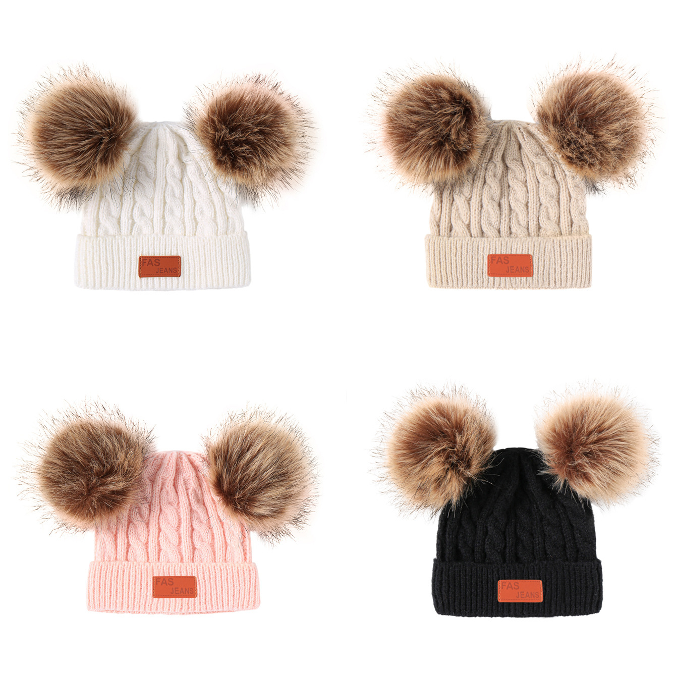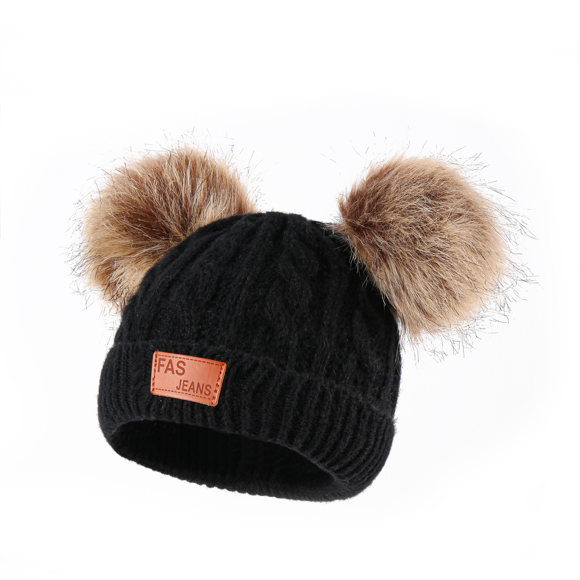 새로운 가을과 겨울 어린이 더블 볼 자카드 울 캡 제조 업체 재고 단색 가죽 라벨 트위스트 따뜻한 아기 모자