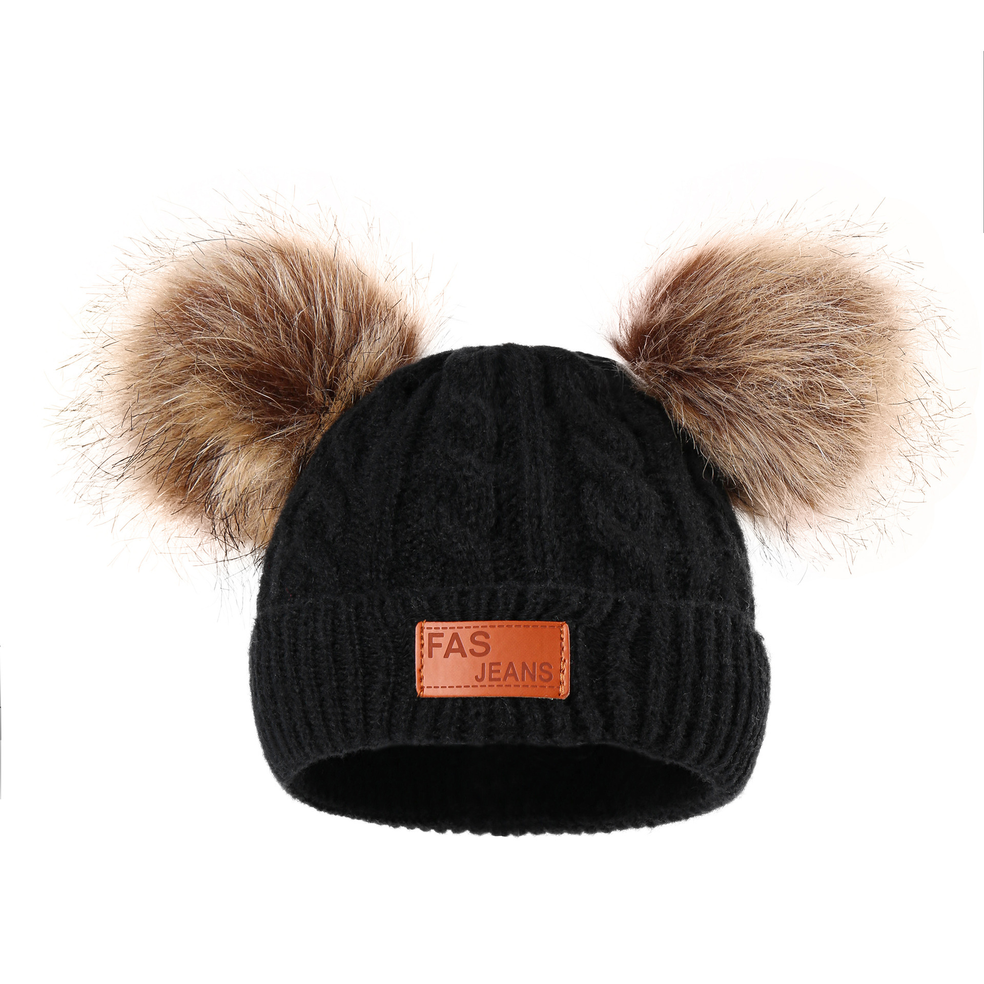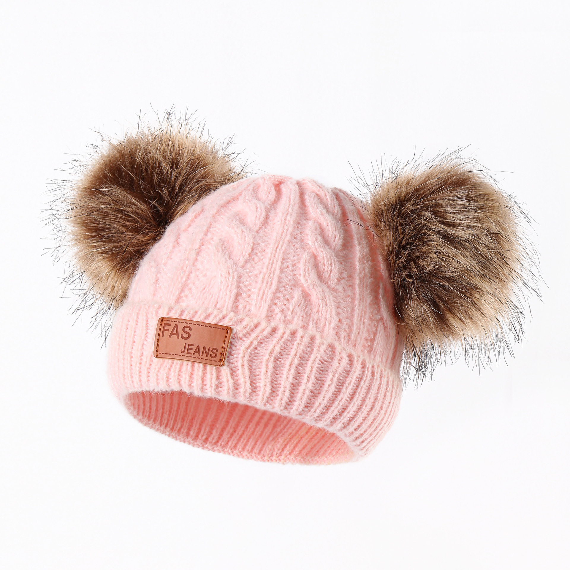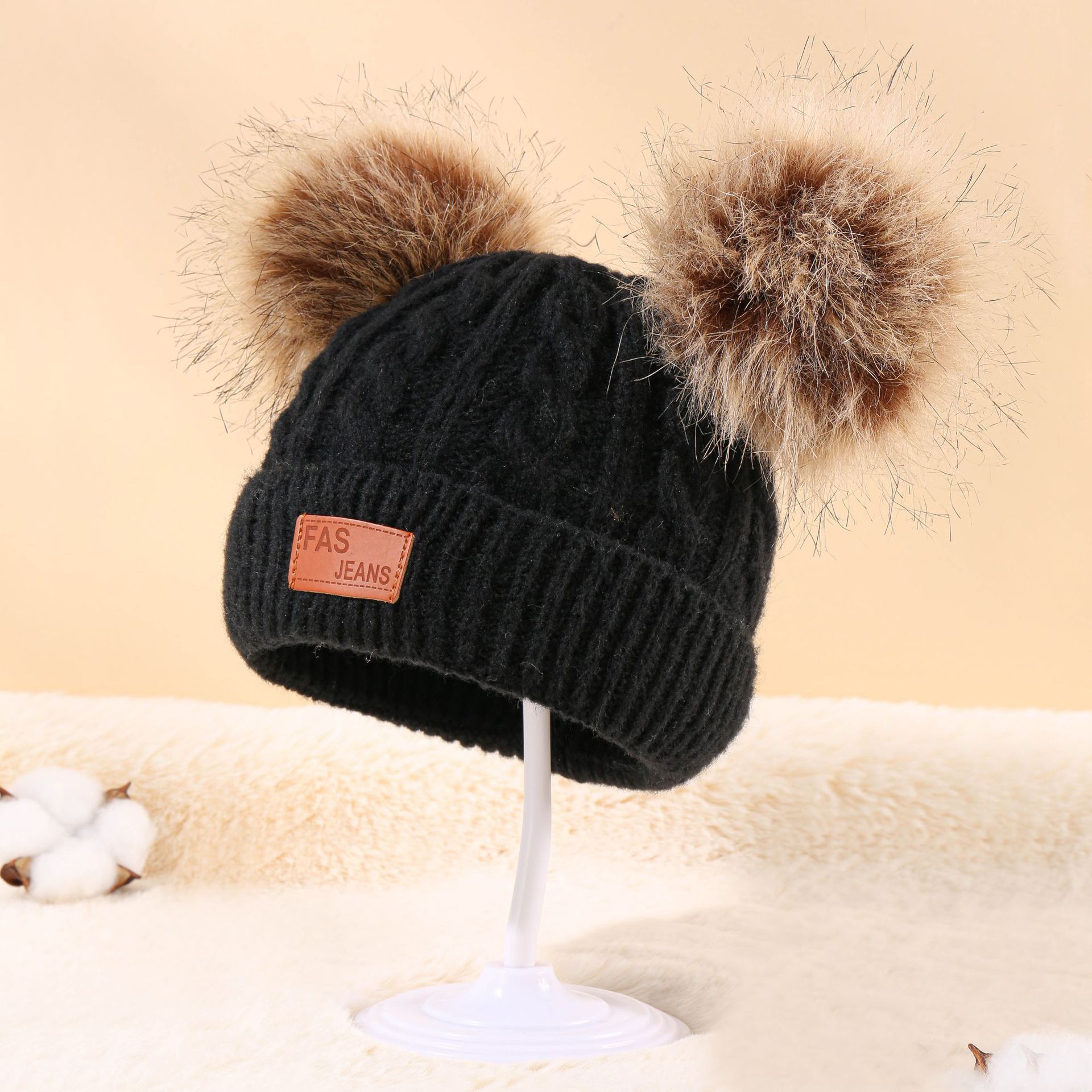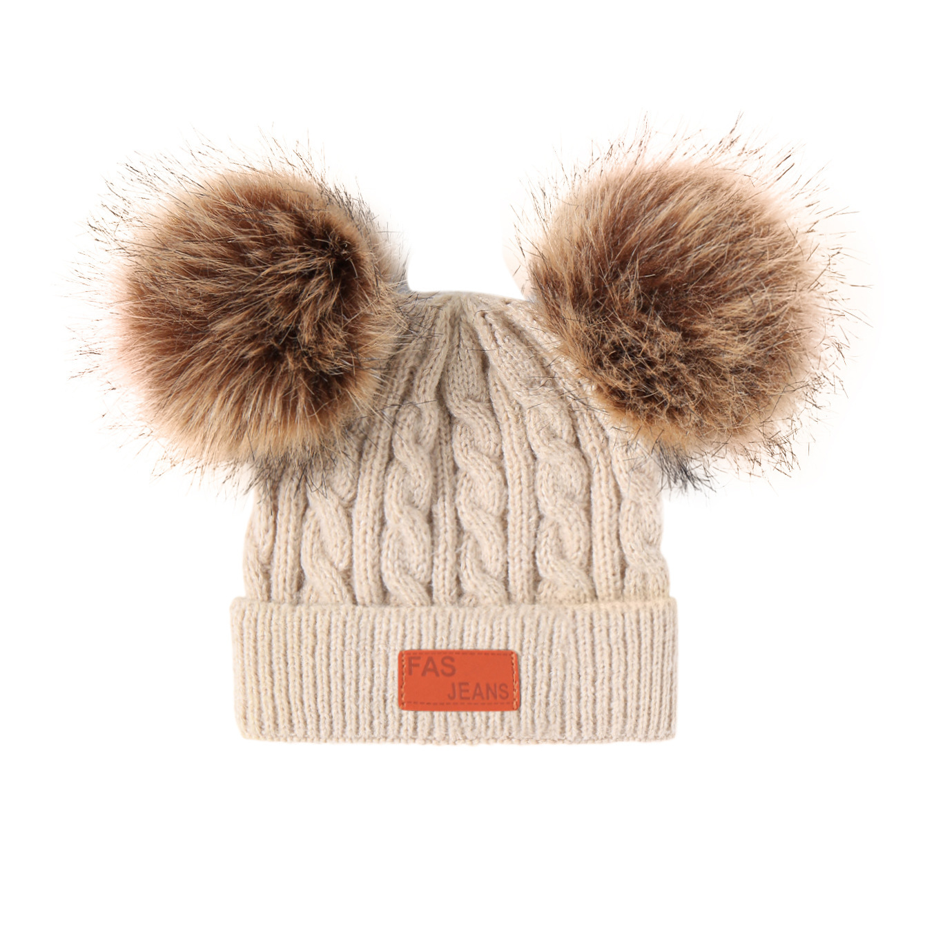 새로운 가을과 겨울 어린이 더블 볼 자카드 울 캡 제조 업체 재고 단색 가죽 라벨 트위스트 따뜻한 아기 모자