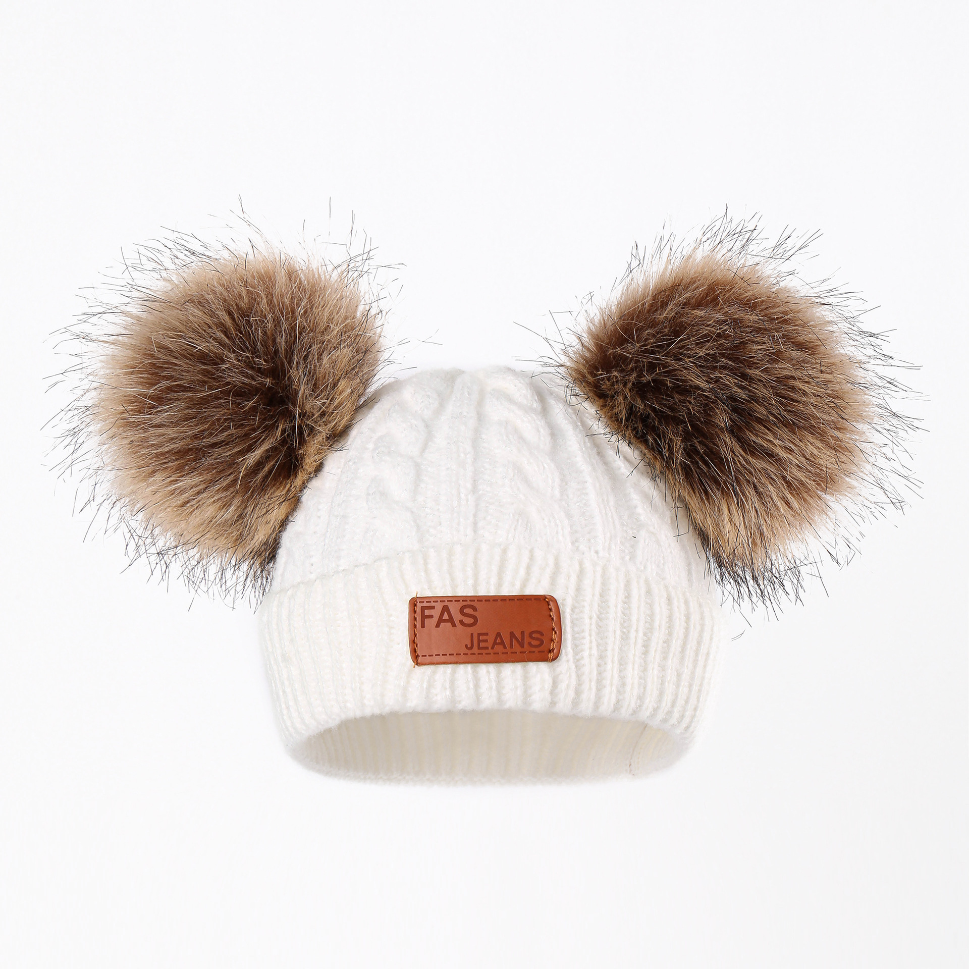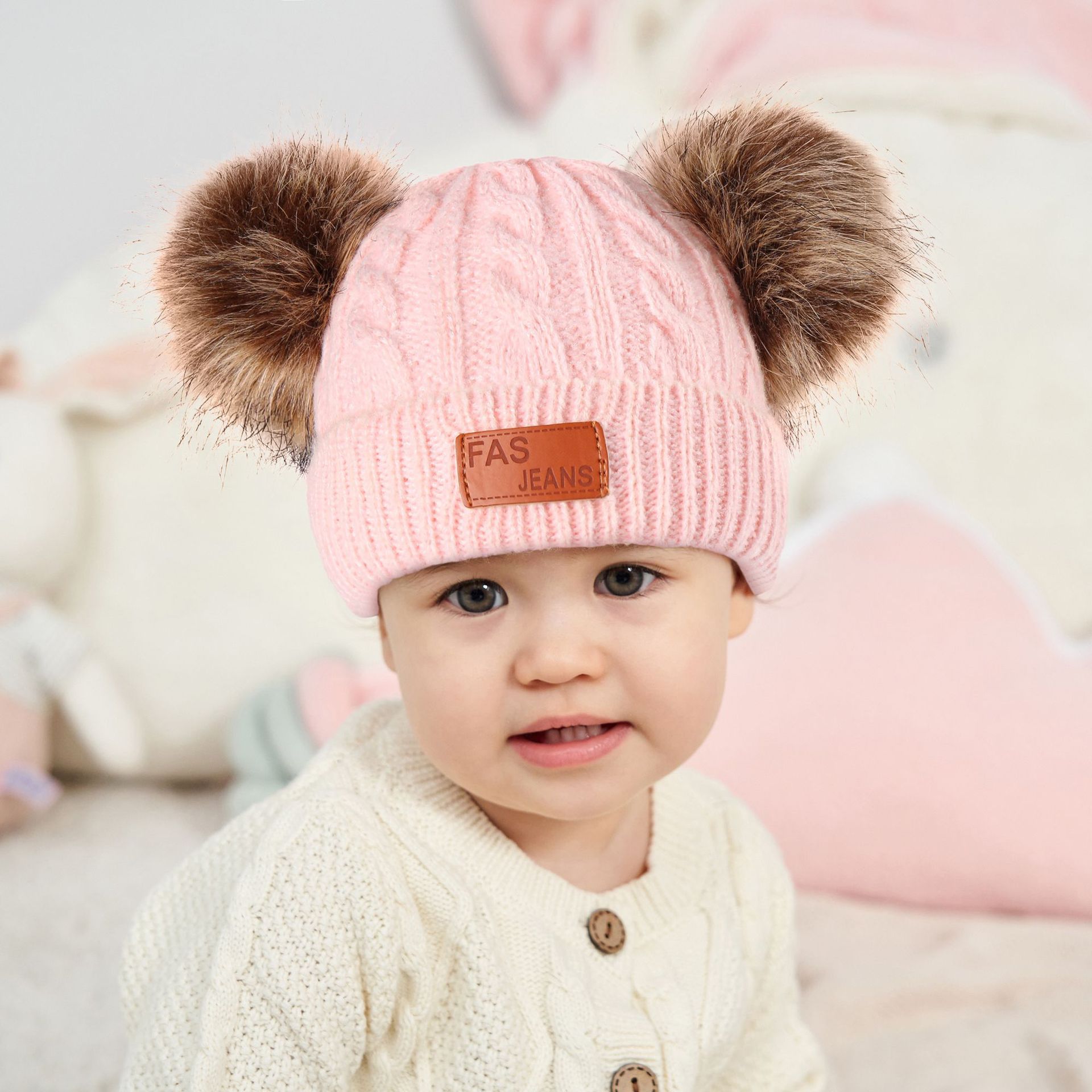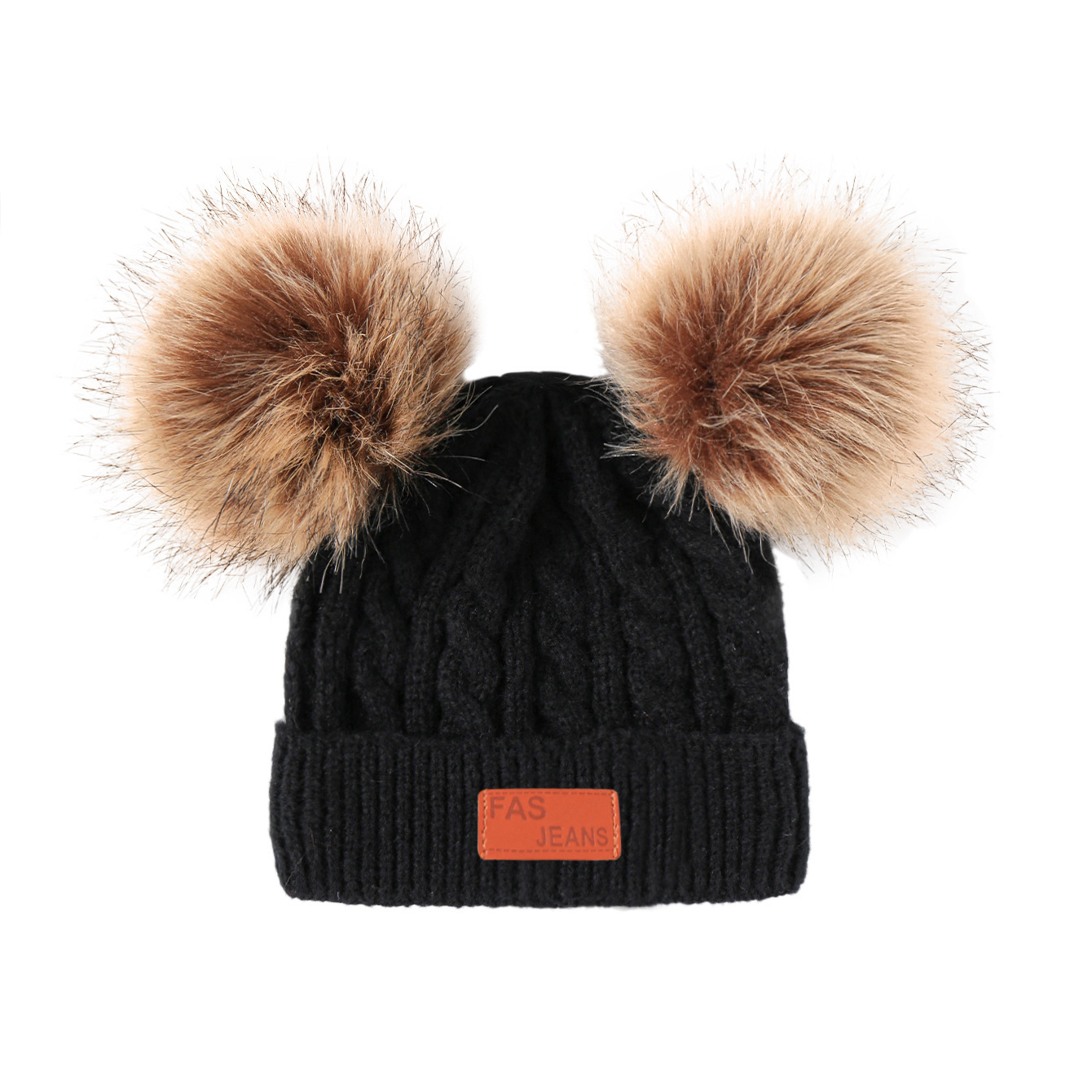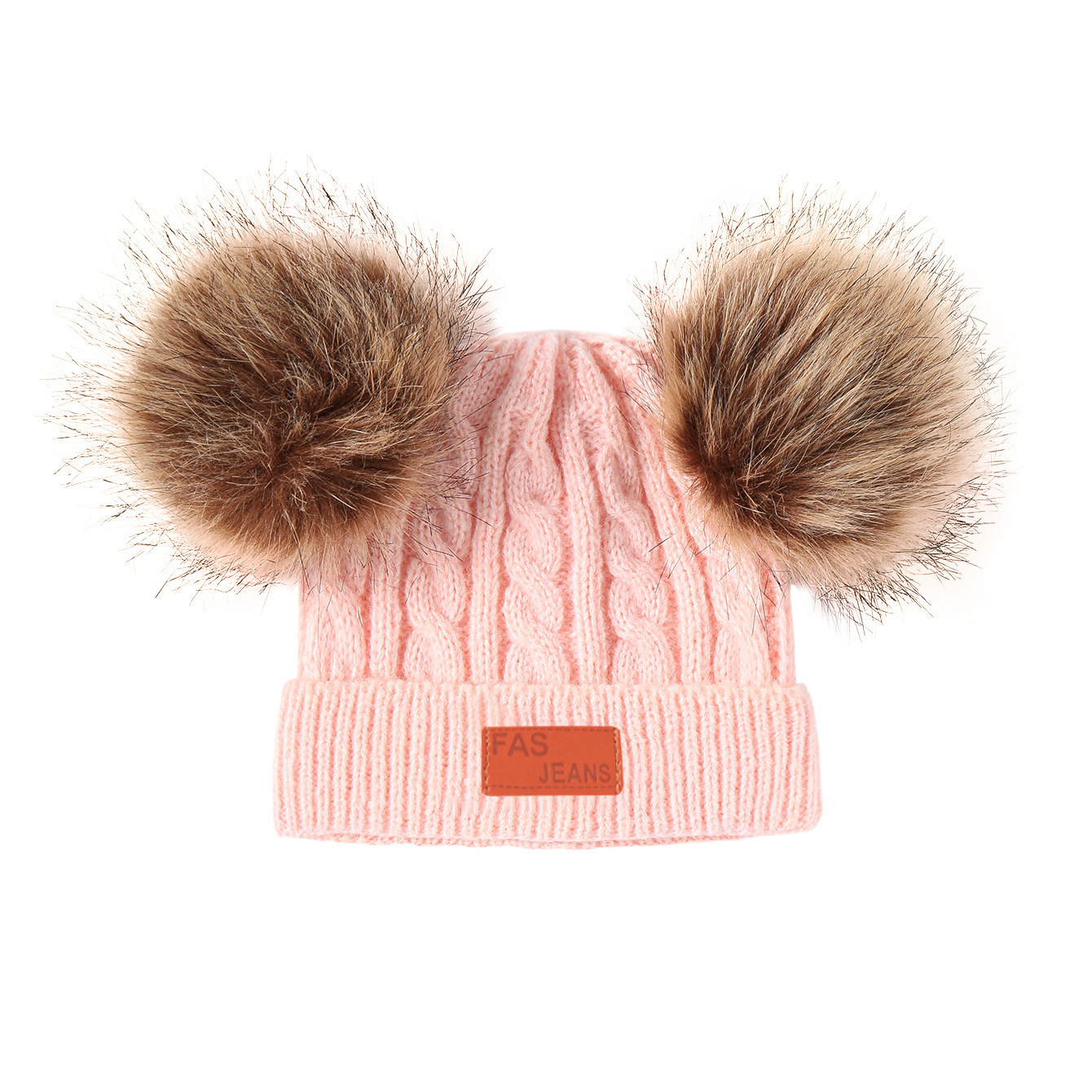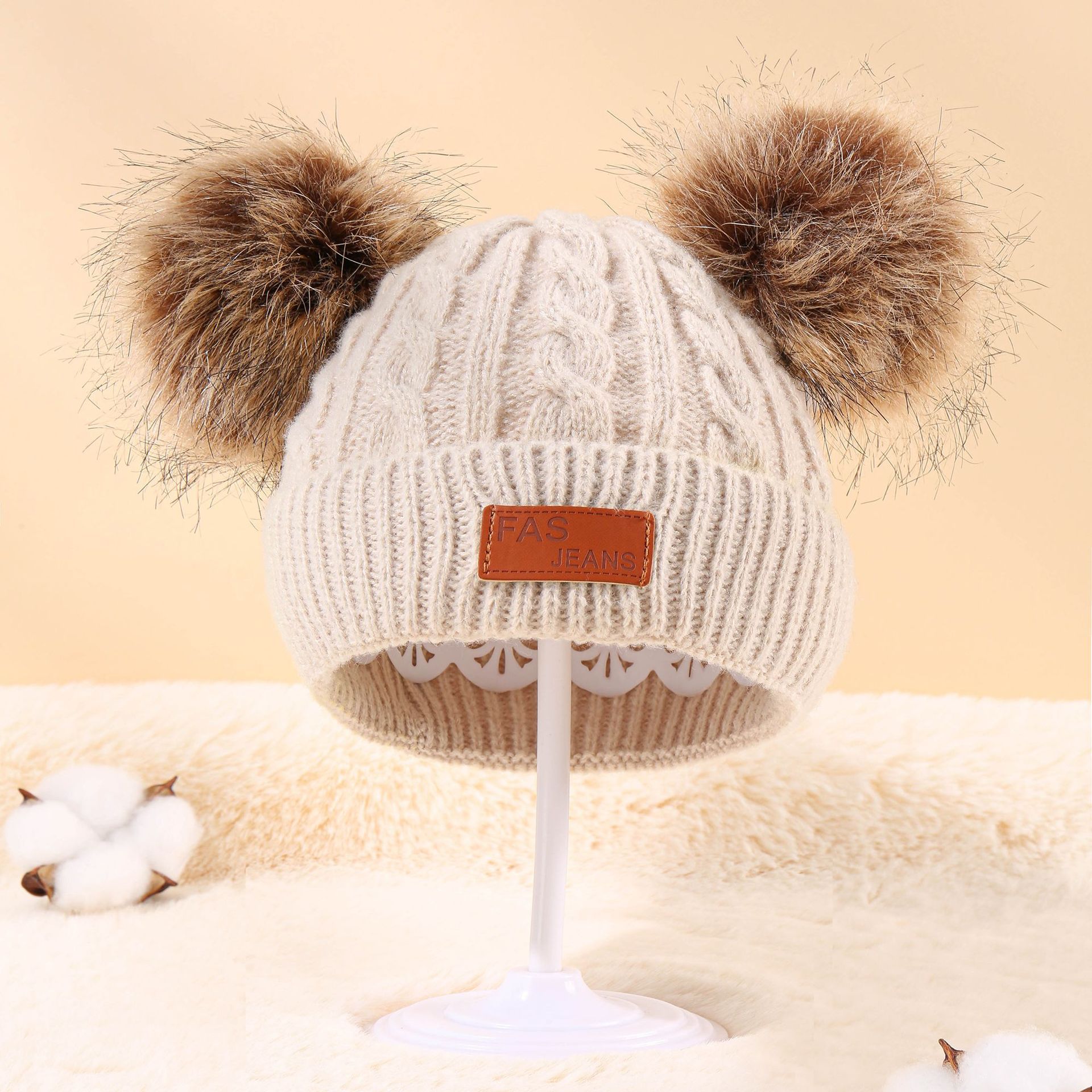 새로운 가을과 겨울 어린이 더블 볼 자카드 울 캡 제조 업체 재고 단색 가죽 라벨 트위스트 따뜻한 아기 모자