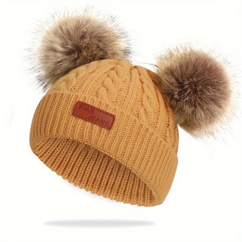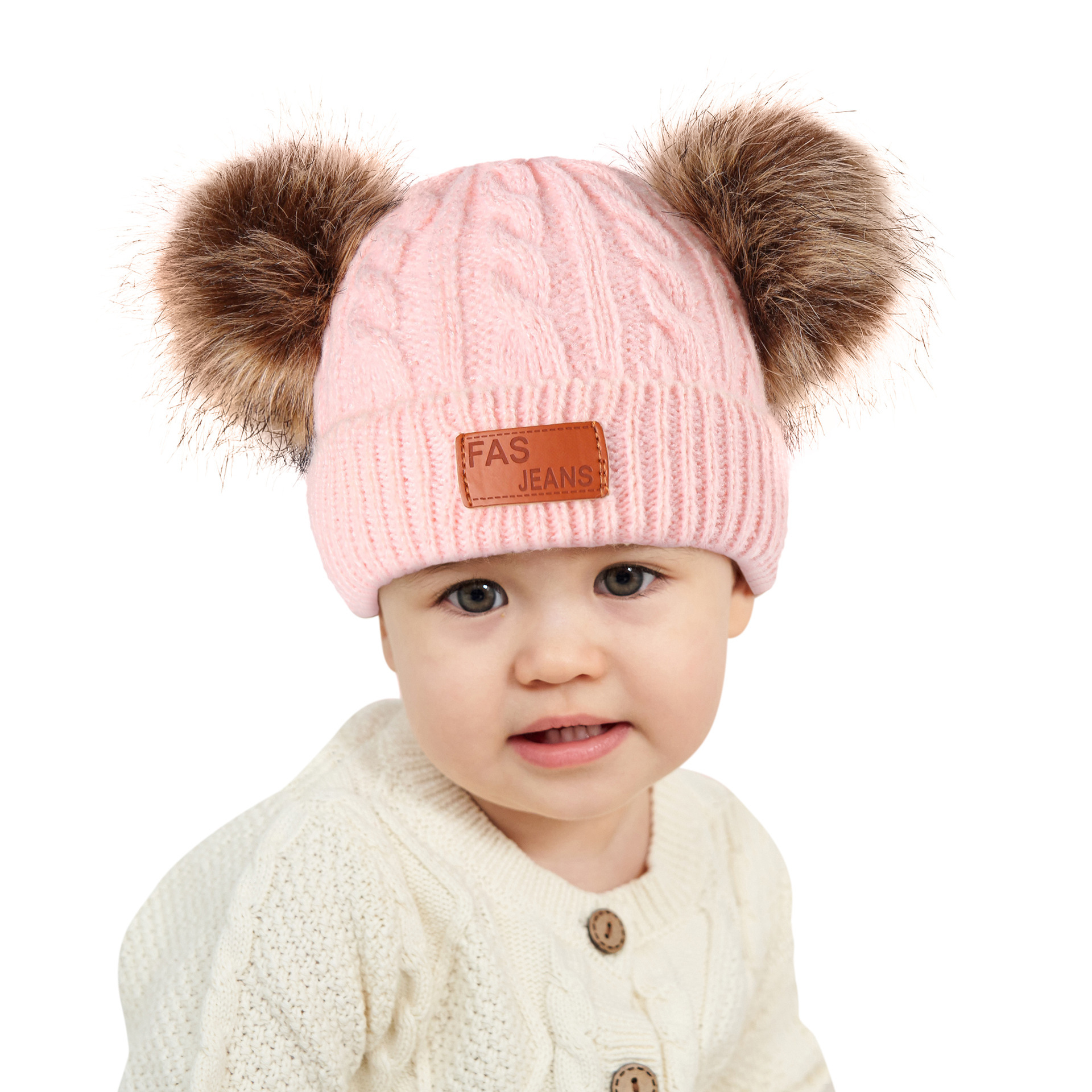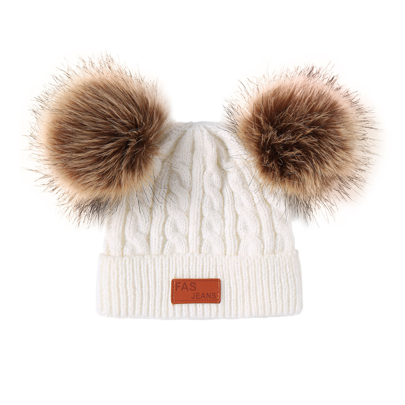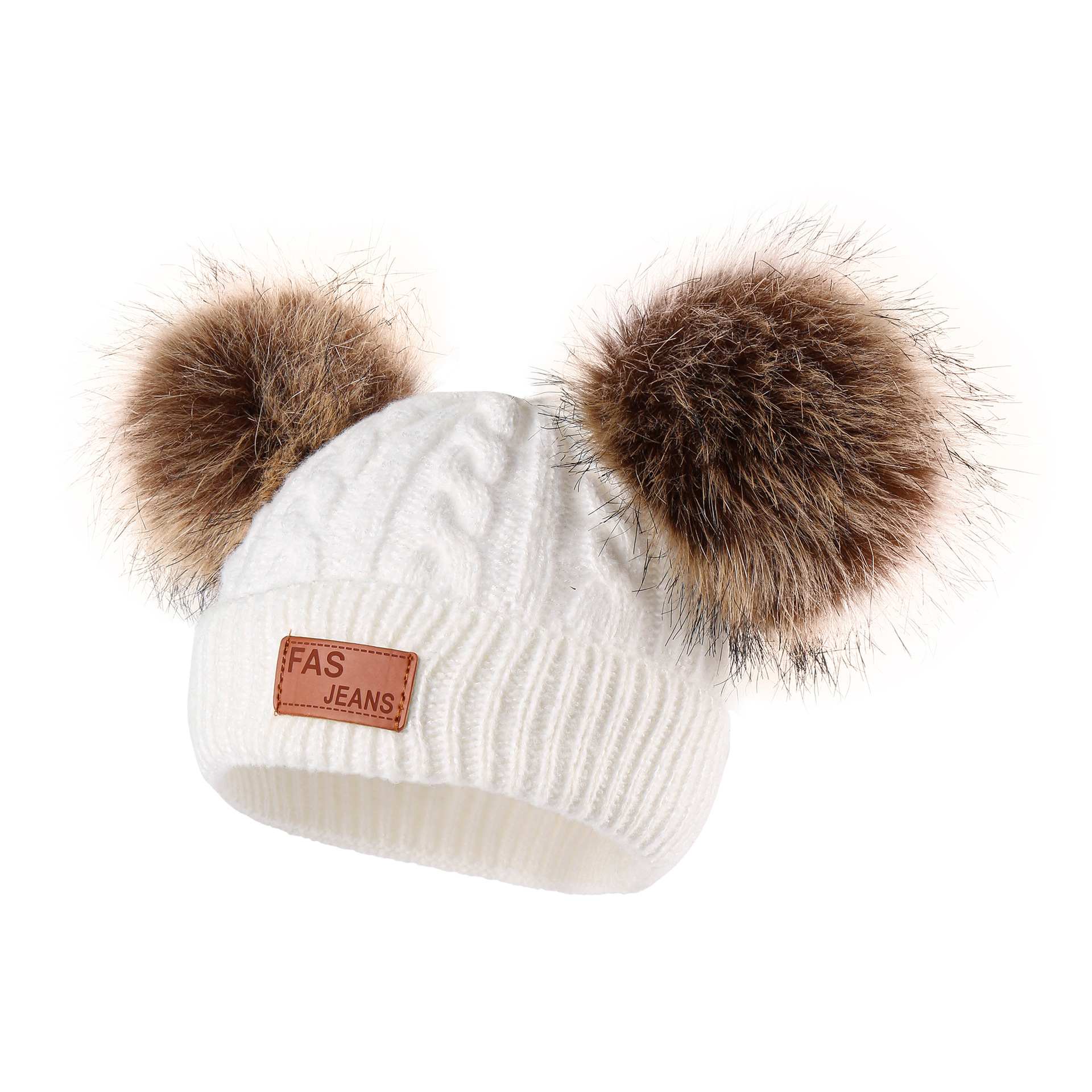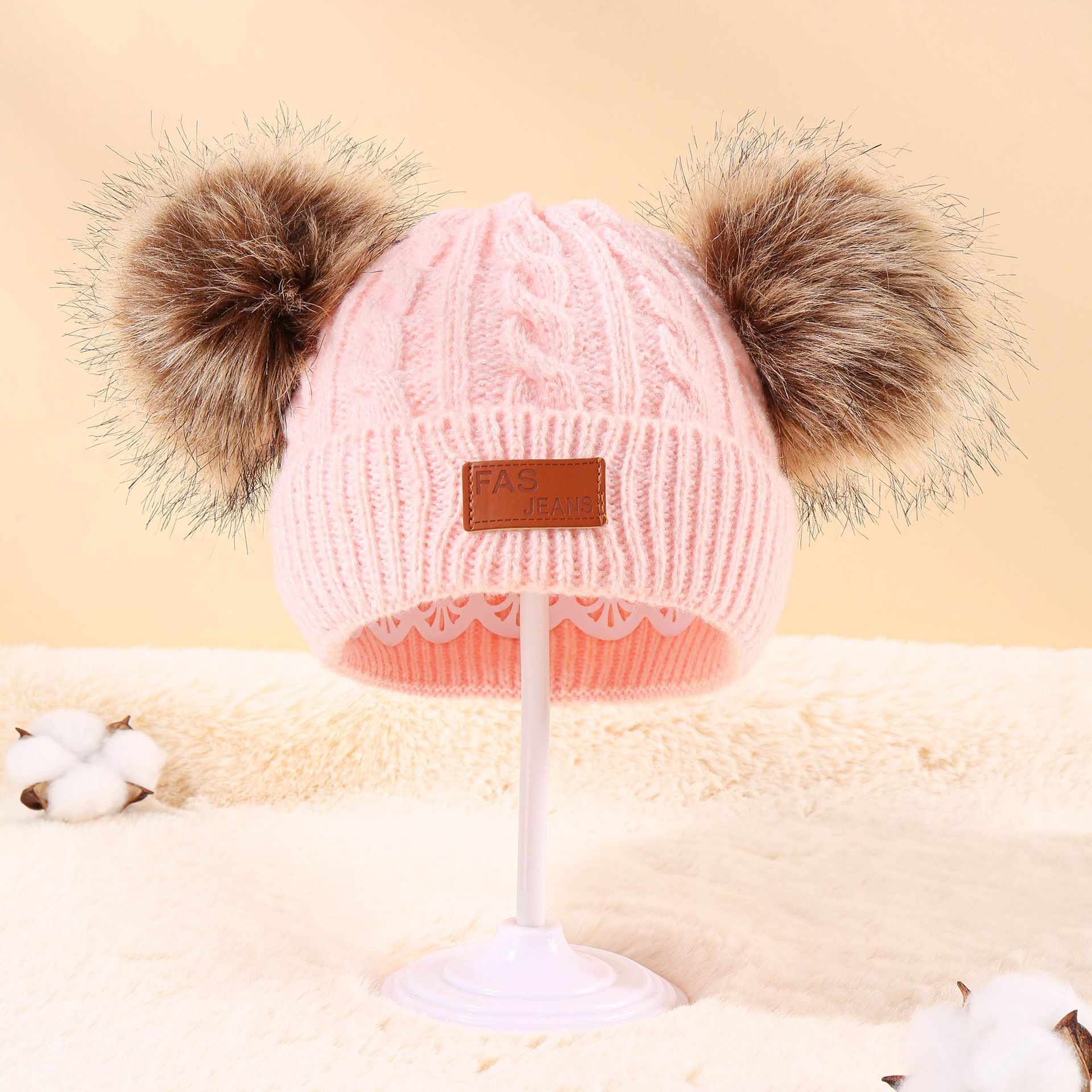 새로운 가을과 겨울 어린이 더블 볼 자카드 울 캡 제조 업체 재고 단색 가죽 라벨 트위스트 따뜻한 아기 모자