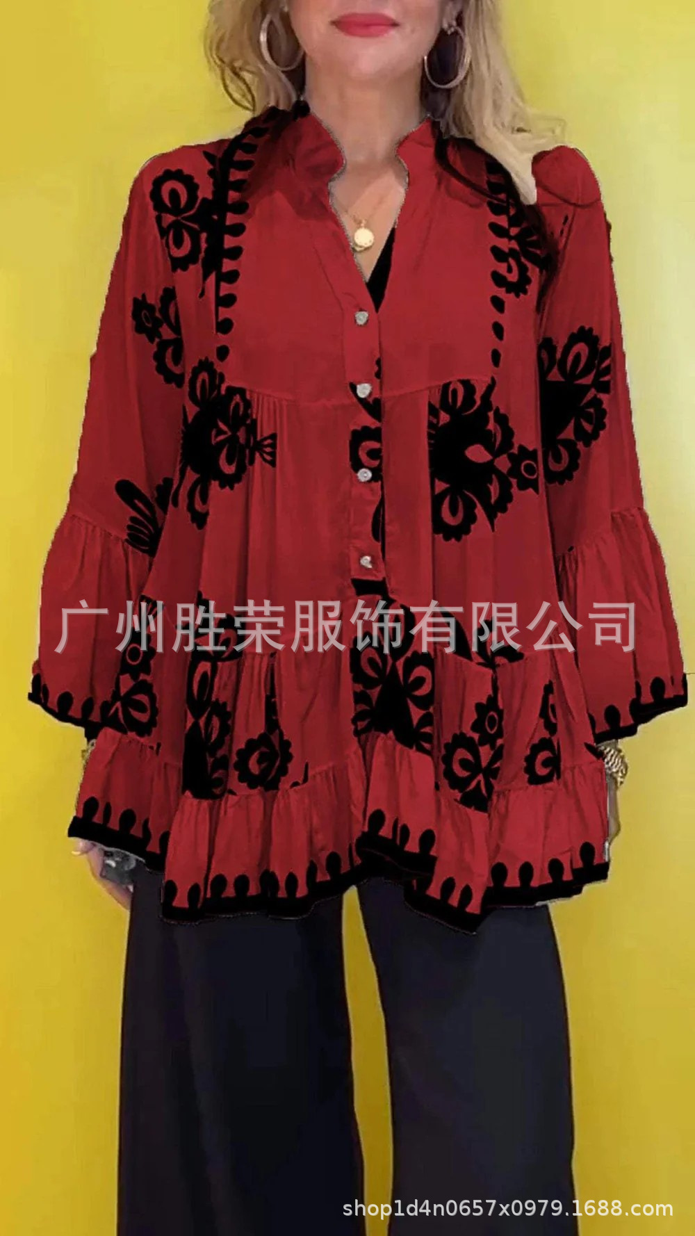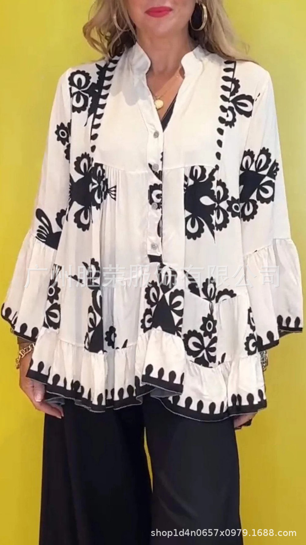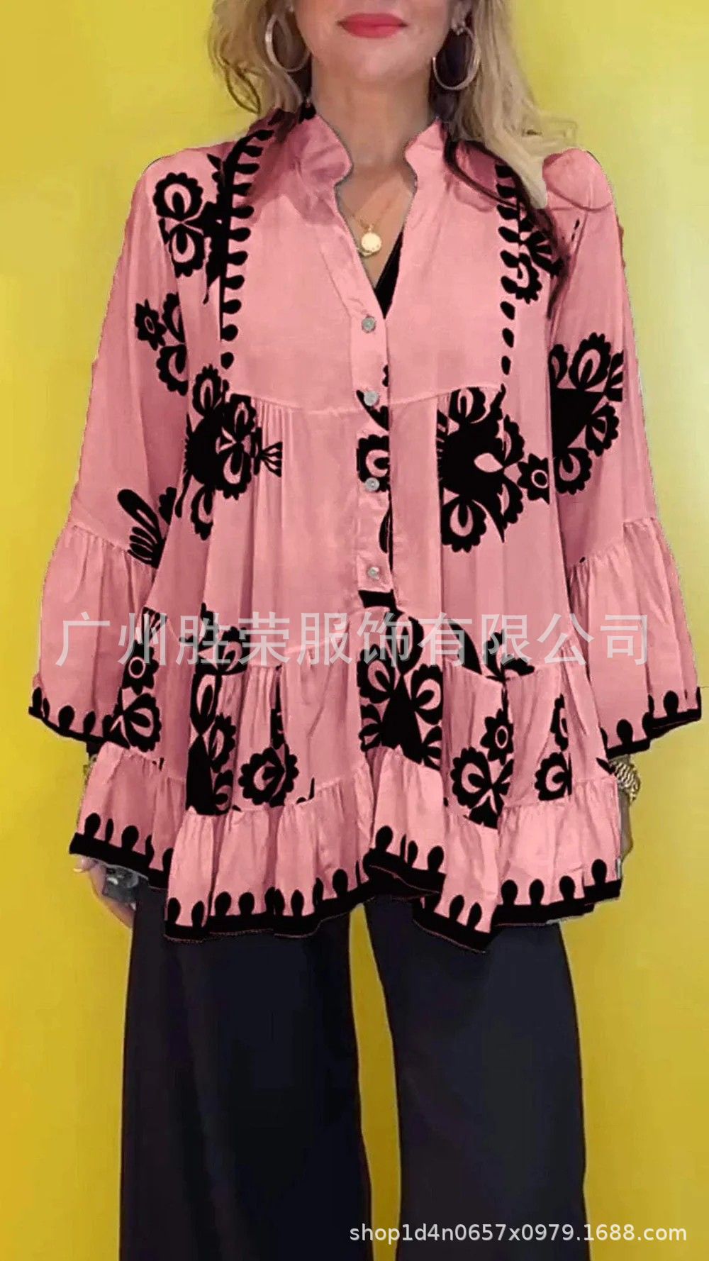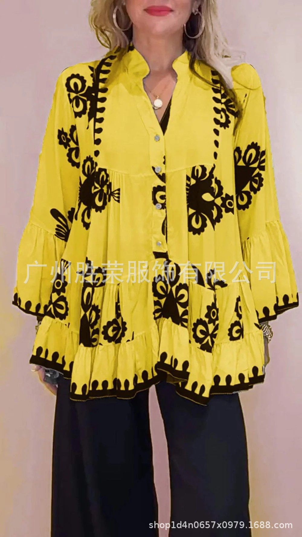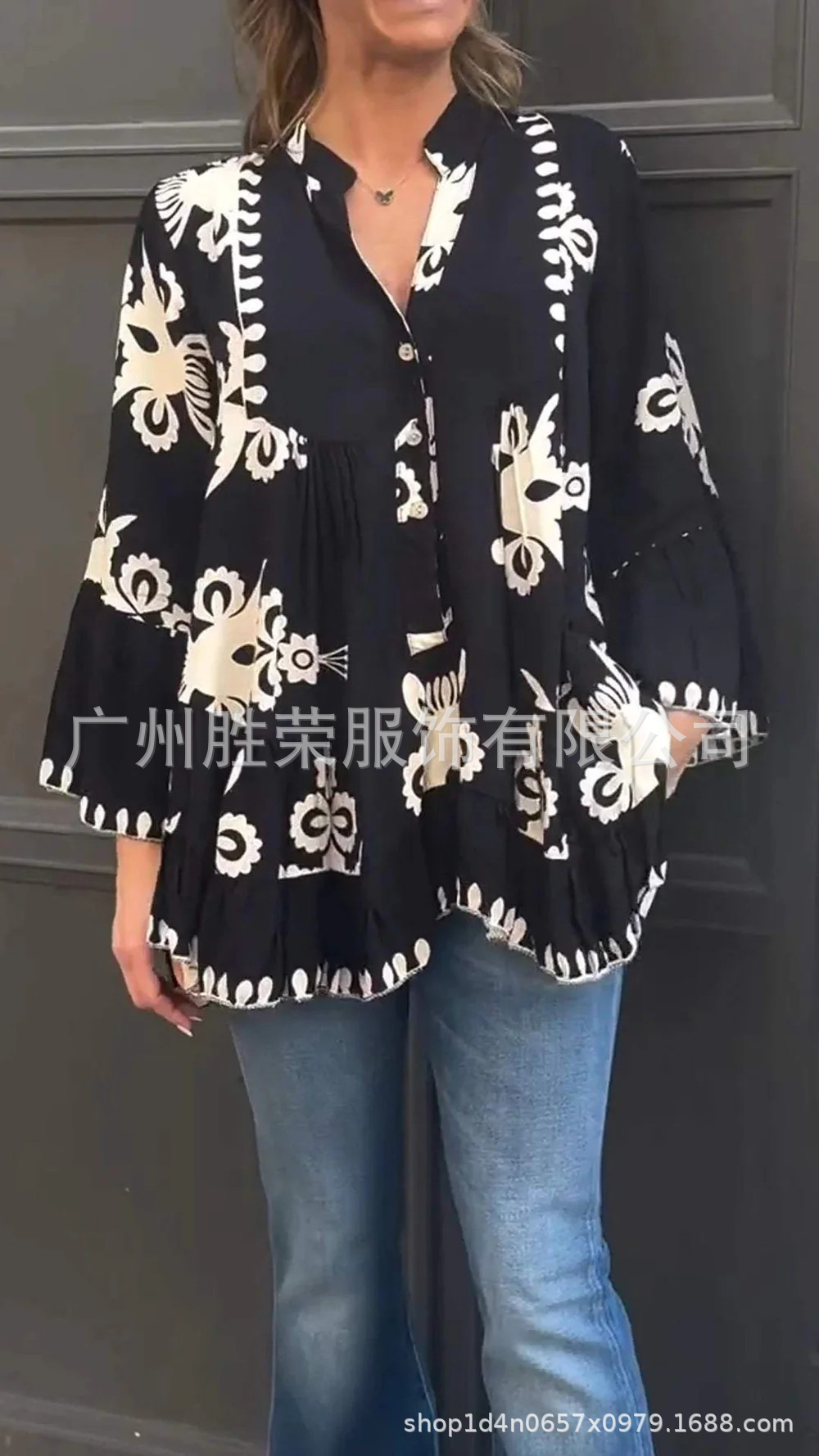 2024 새로운 국경 대외 무역 유럽과 미국 여성의 불규칙한 V-목 캐주얼 느슨한 긴 소매 러플 여성 셔츠스토어 가기