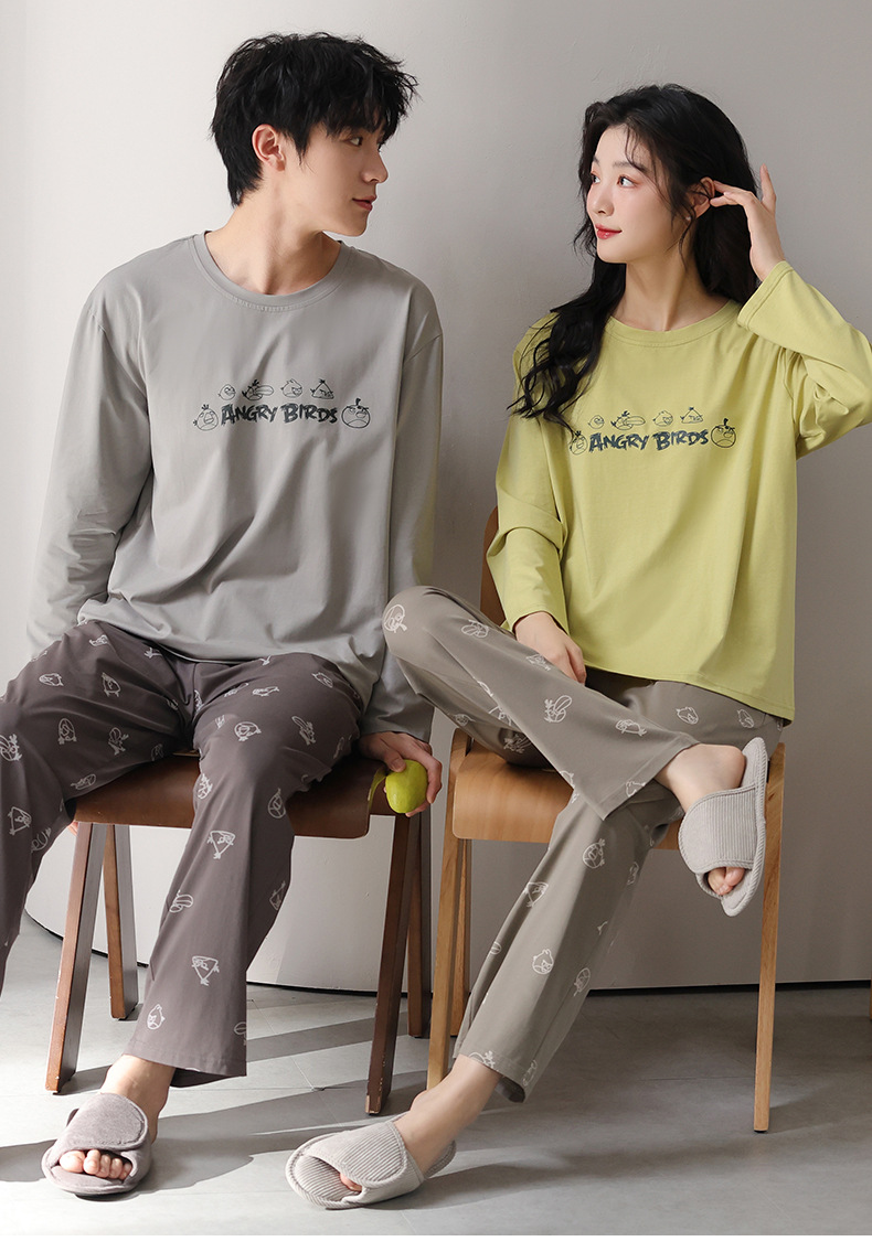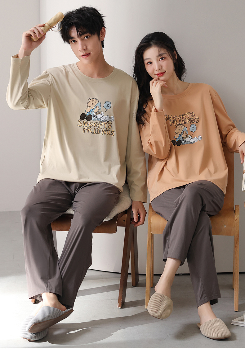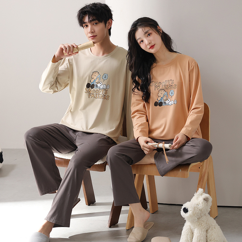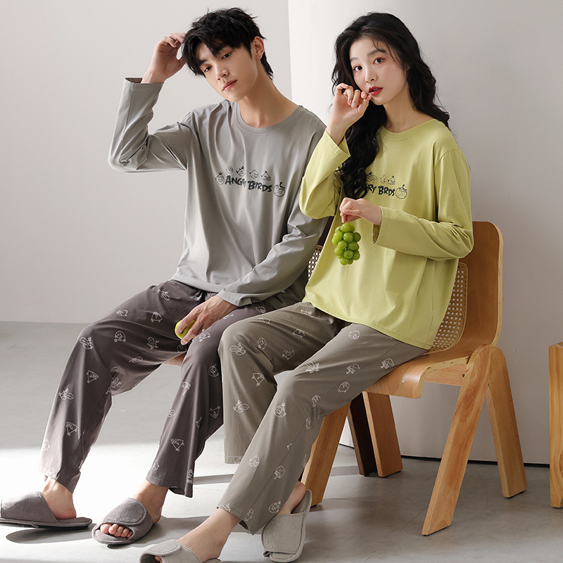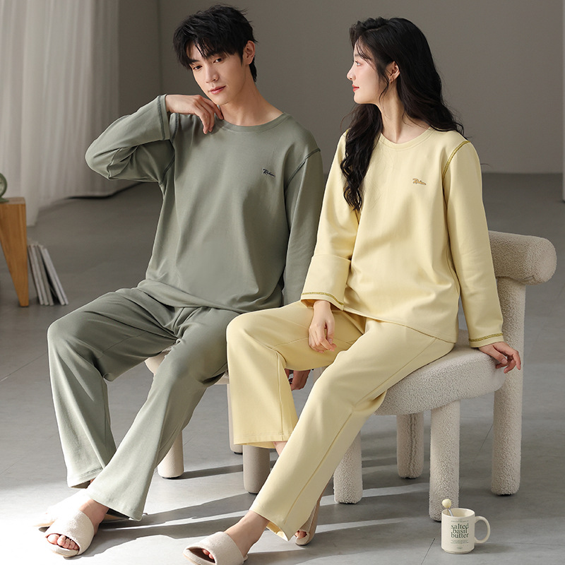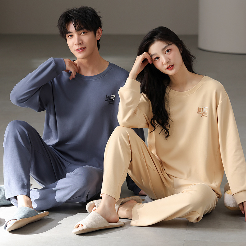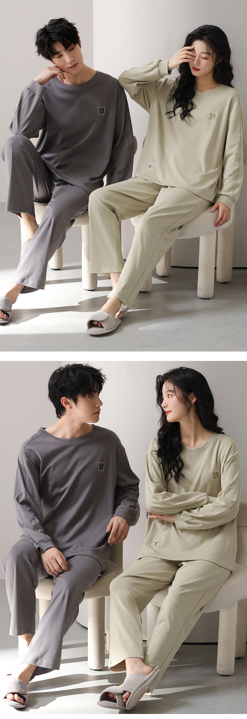 [가슴 패드 포함] 커플 잠옷 가을 겨울 신상 순면 여성 긴팔 루즈핏 남성 라이크라 면 홈웨어 세트
