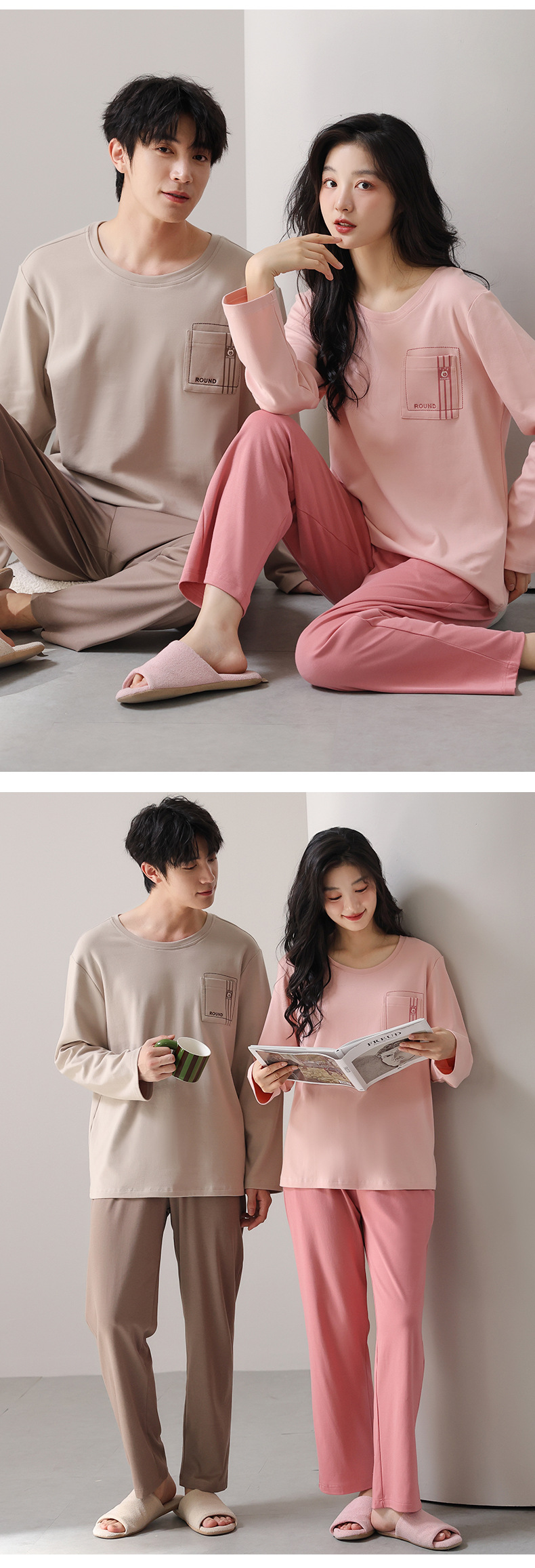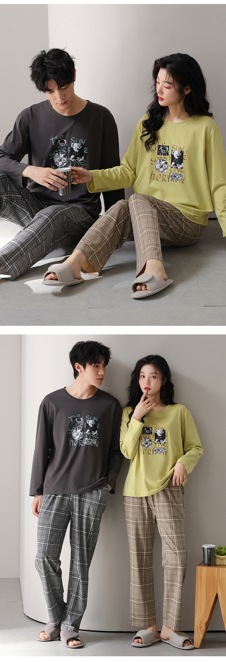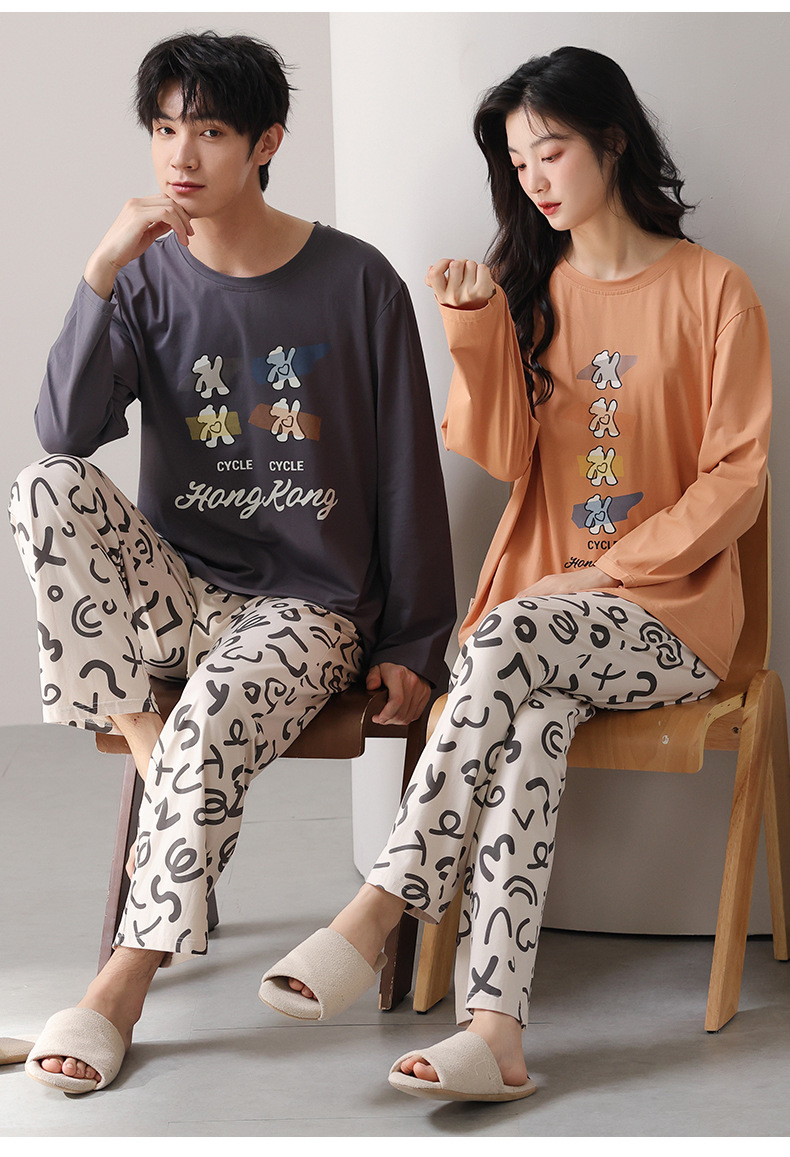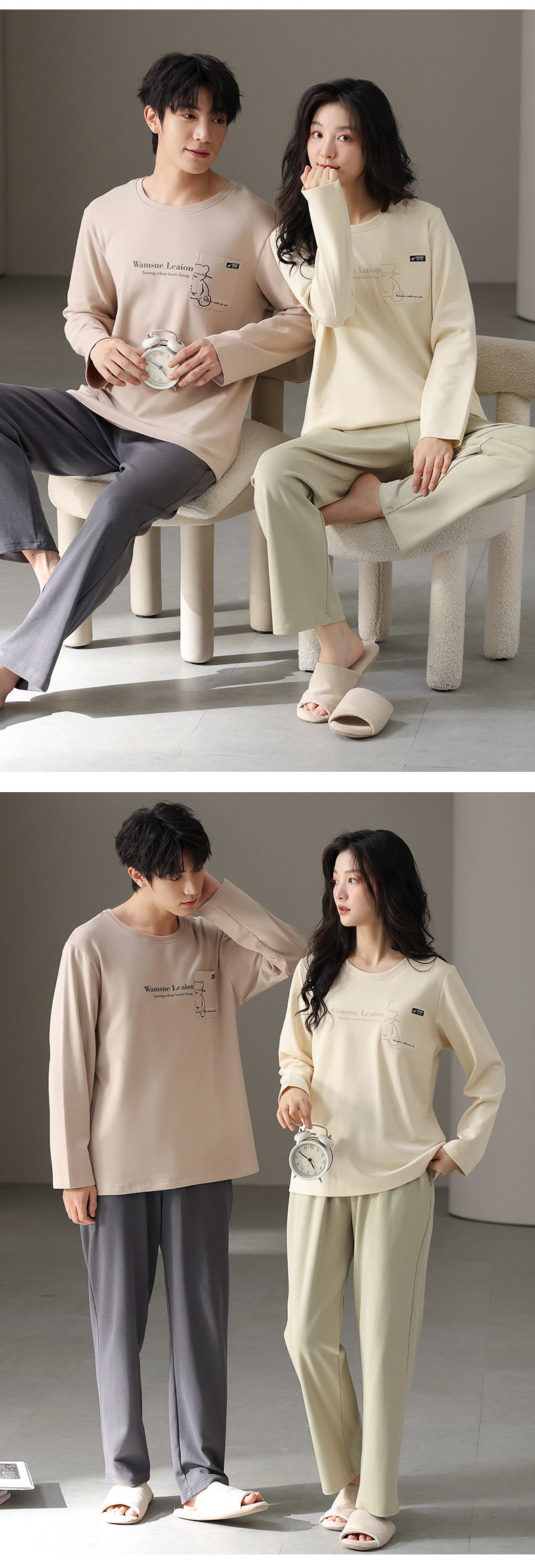 [가슴 패드 포함] 커플 잠옷 가을 겨울 신상 순면 여성 긴팔 루즈핏 남성 라이크라 면 홈웨어 세트스토어 가기