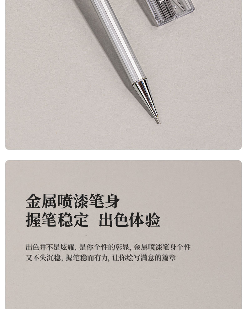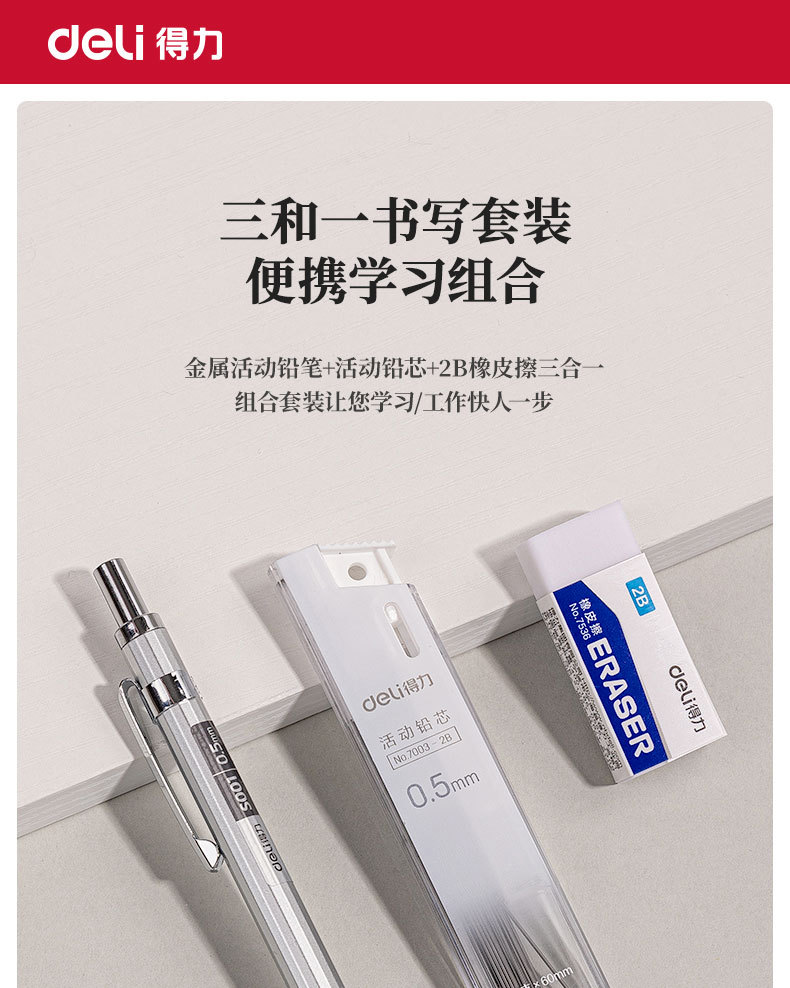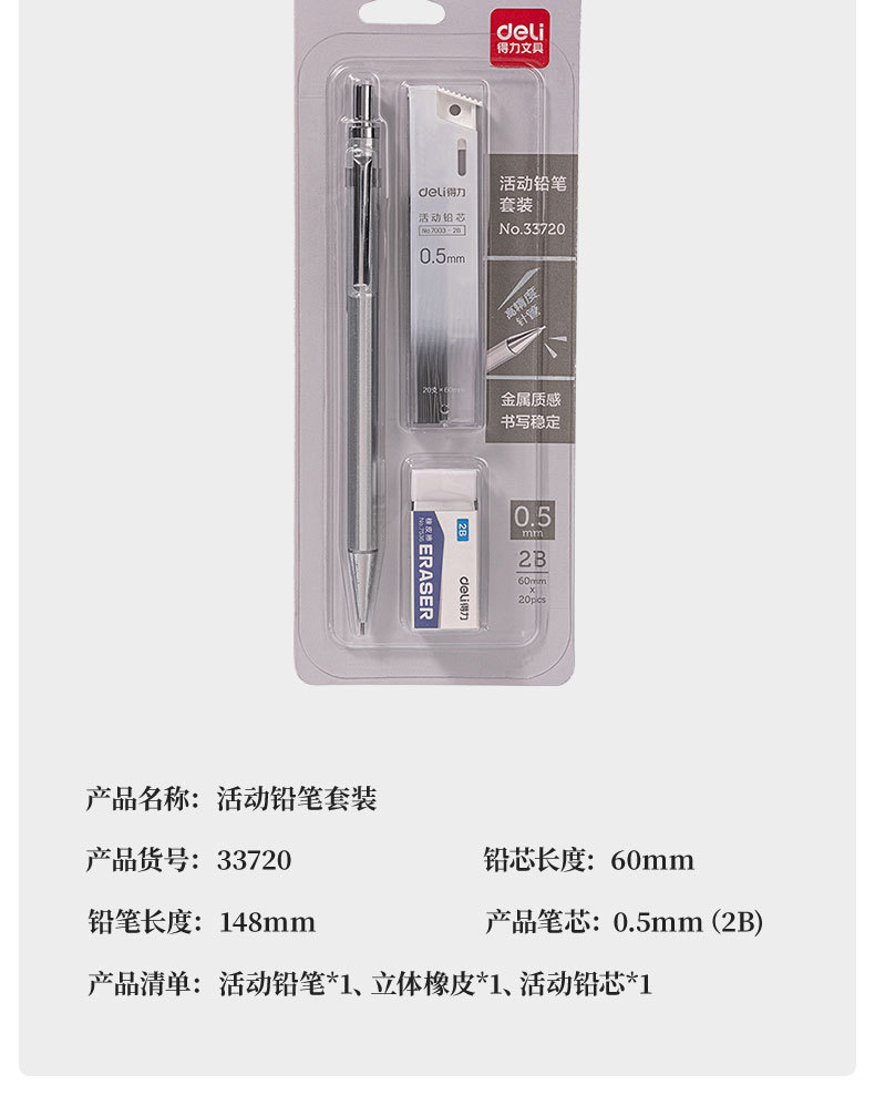 델리 33720 금속 기계 연필 3 피스 세트 2B 낮은 무게 중심은 핵심 문구 학생 시험 드로잉 펜을 깨기 쉽지 않습니다.