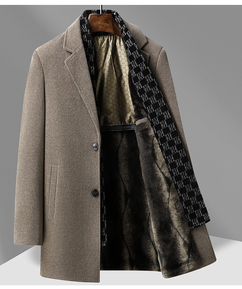국경 간 남성용 솔리드 컬러 모직 코트 비즈니스 슬림 핏 스카프 서양식 칼라 솔리드 컬러 기모 남성용 중간 길이의 코트