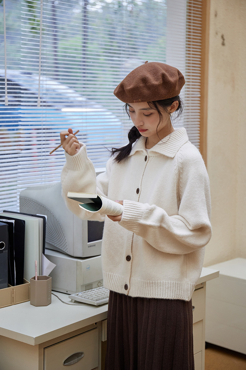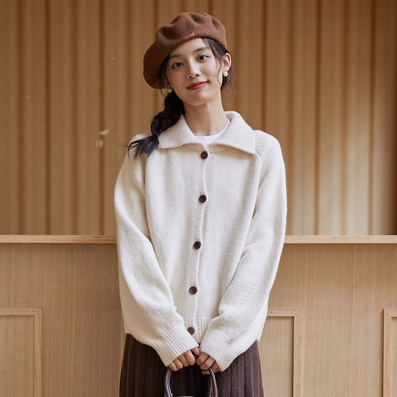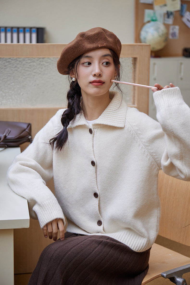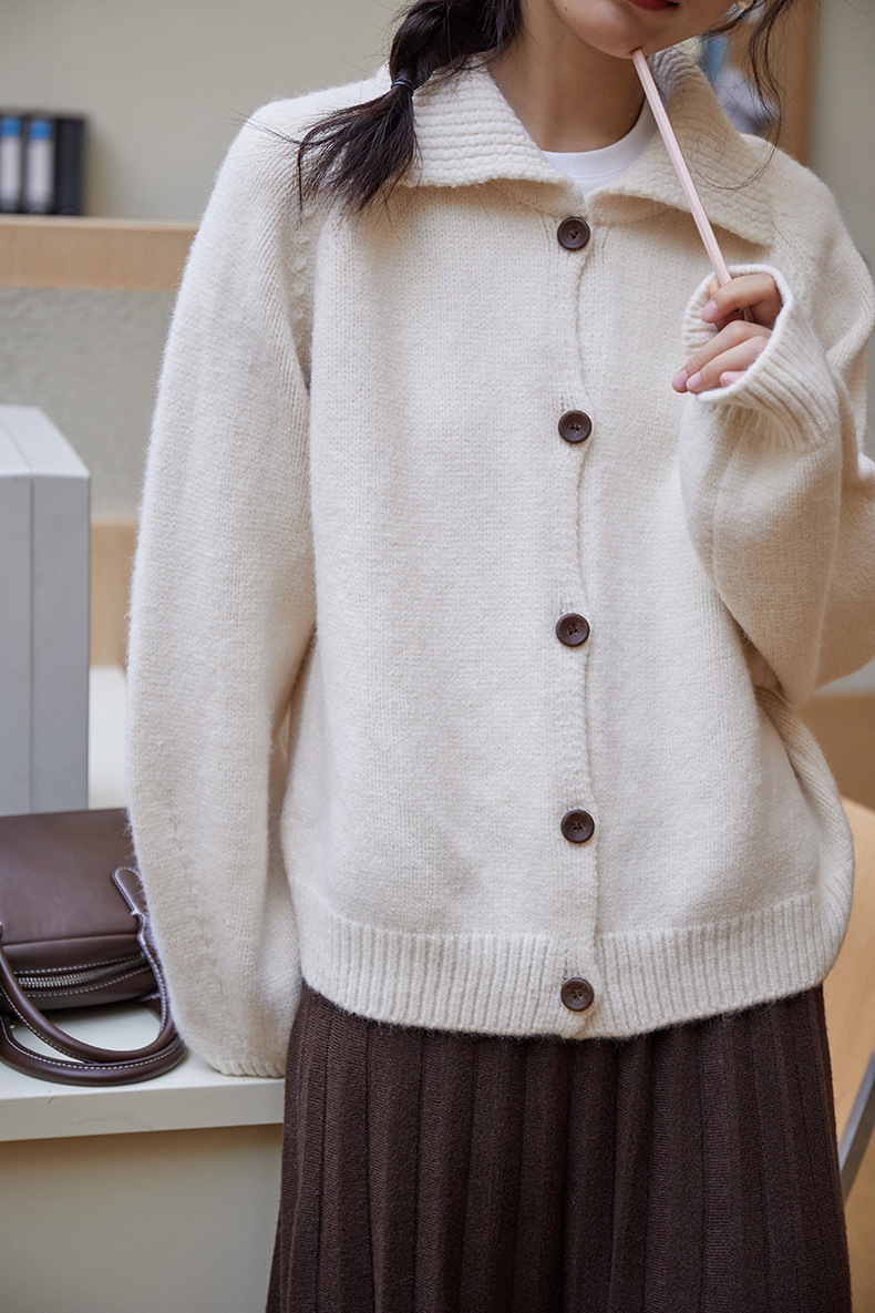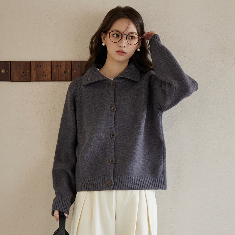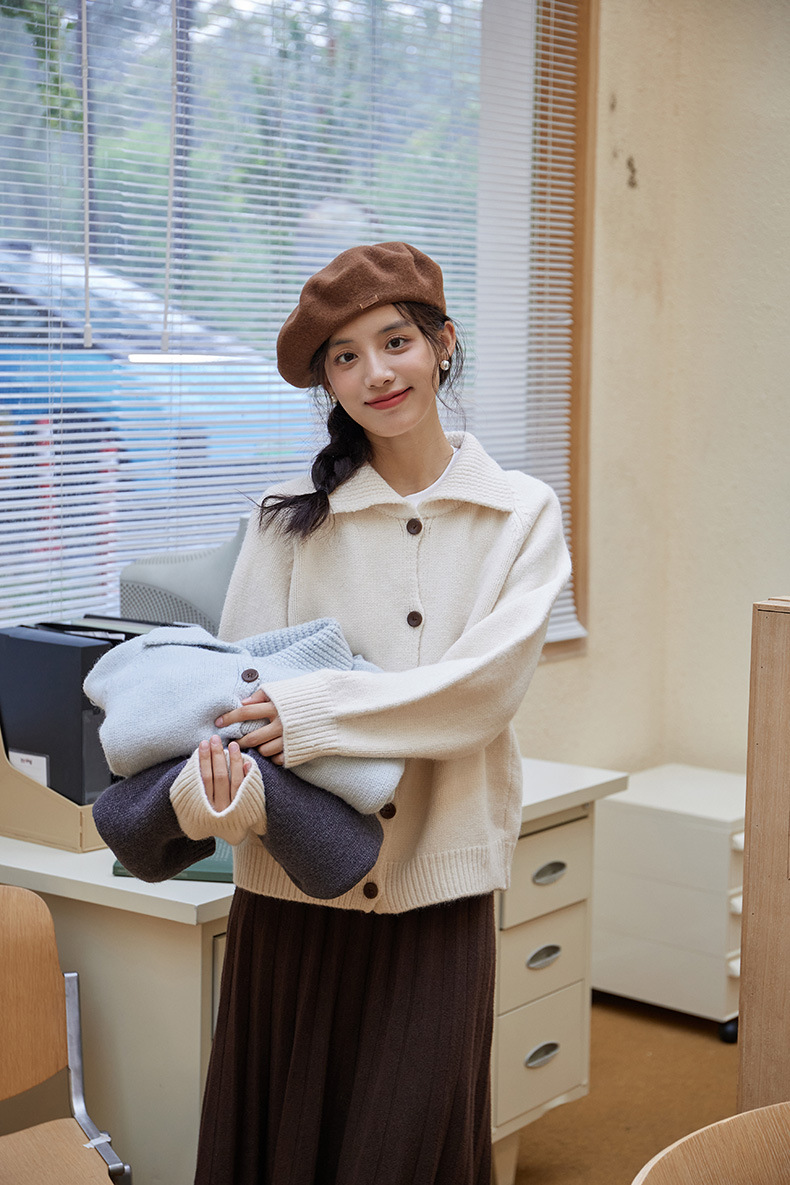 2024 가을과 겨울 새로운 일본 간단한 단색 옷깃 스웨터 코트 여성용 게으른 인형 칼라 니트 카디건 탑스토어 가기