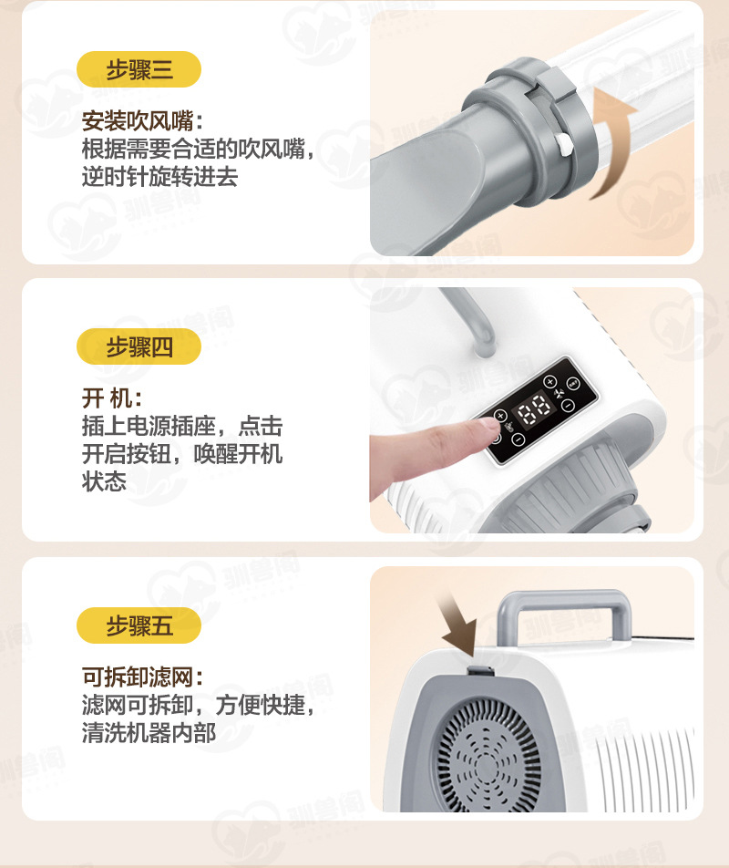 注意:请勿将吹水机放置在有水的地面,以免机器进水烧坏电机