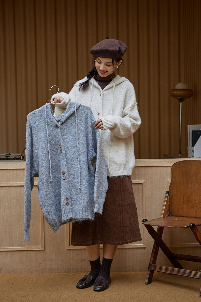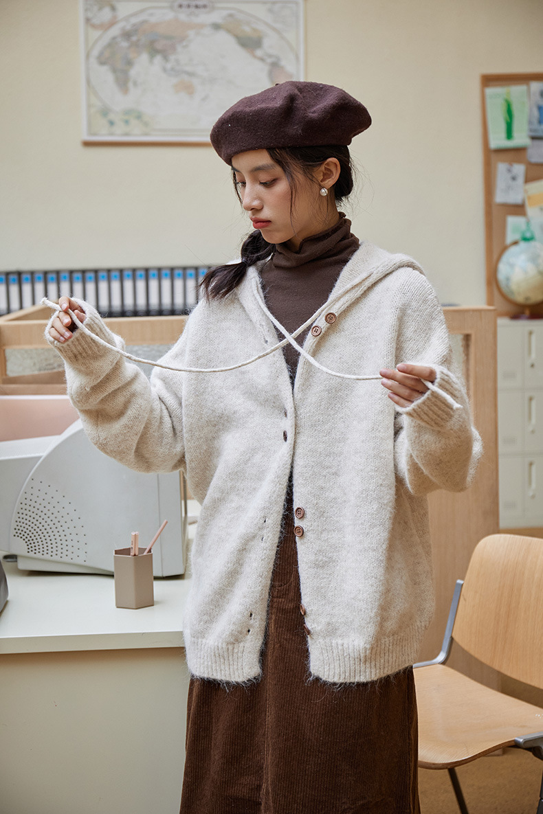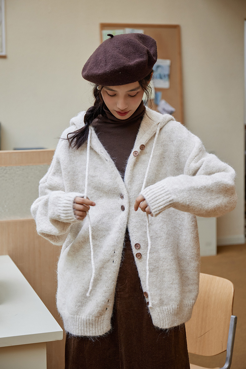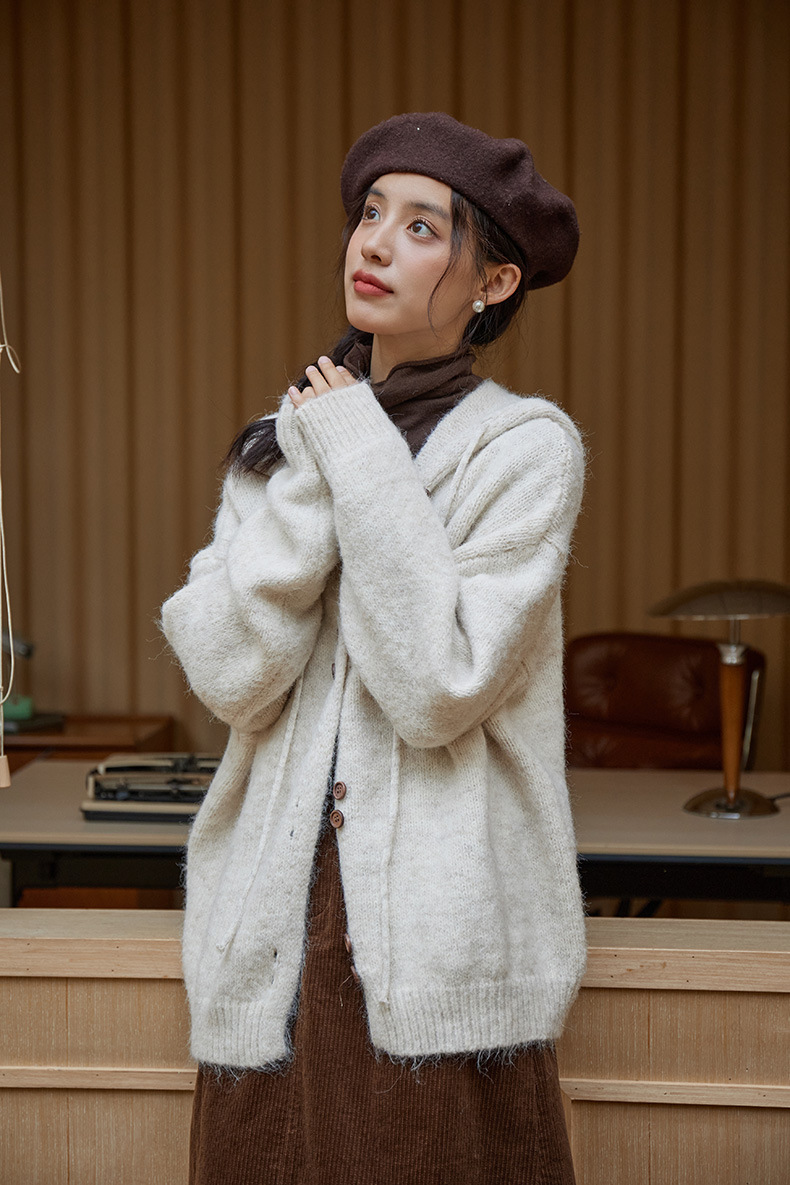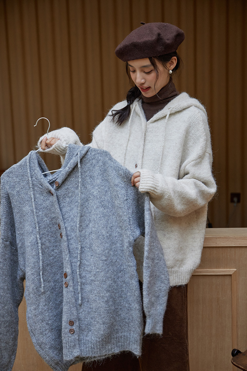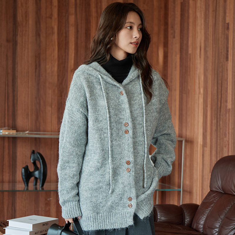2024 가을과 겨울 새로운 한국 스타일 게으른 스타일 후드 드로우 스트링 카디건 스웨터 여성 일본 스타일 루즈 소프트 왁스 니트 재킷스토어 가기