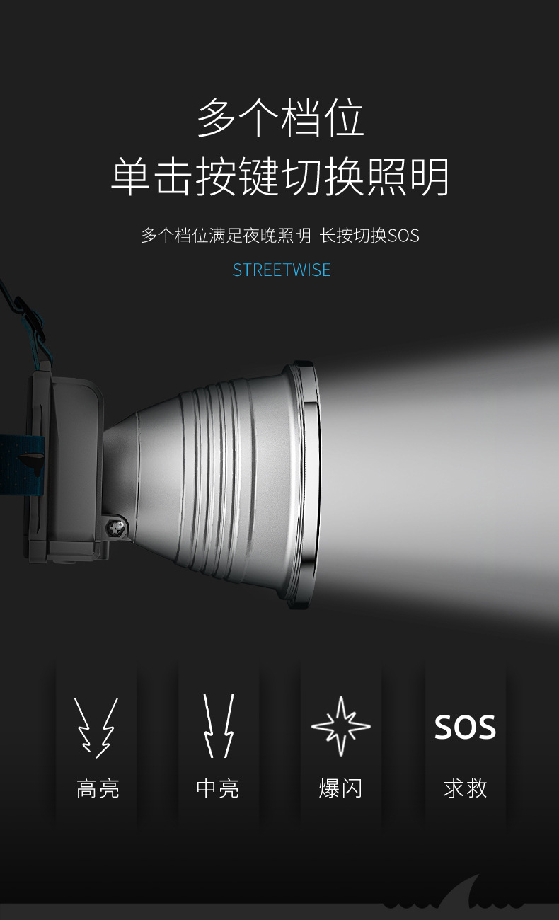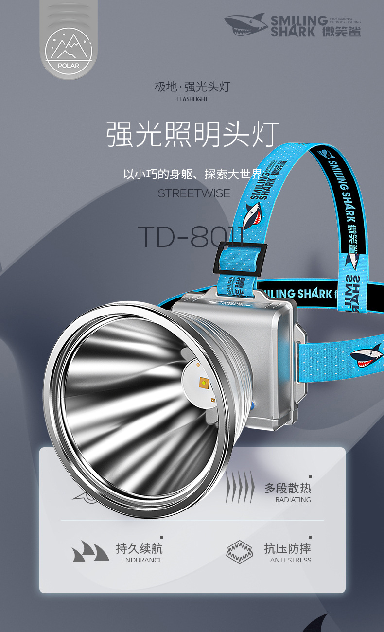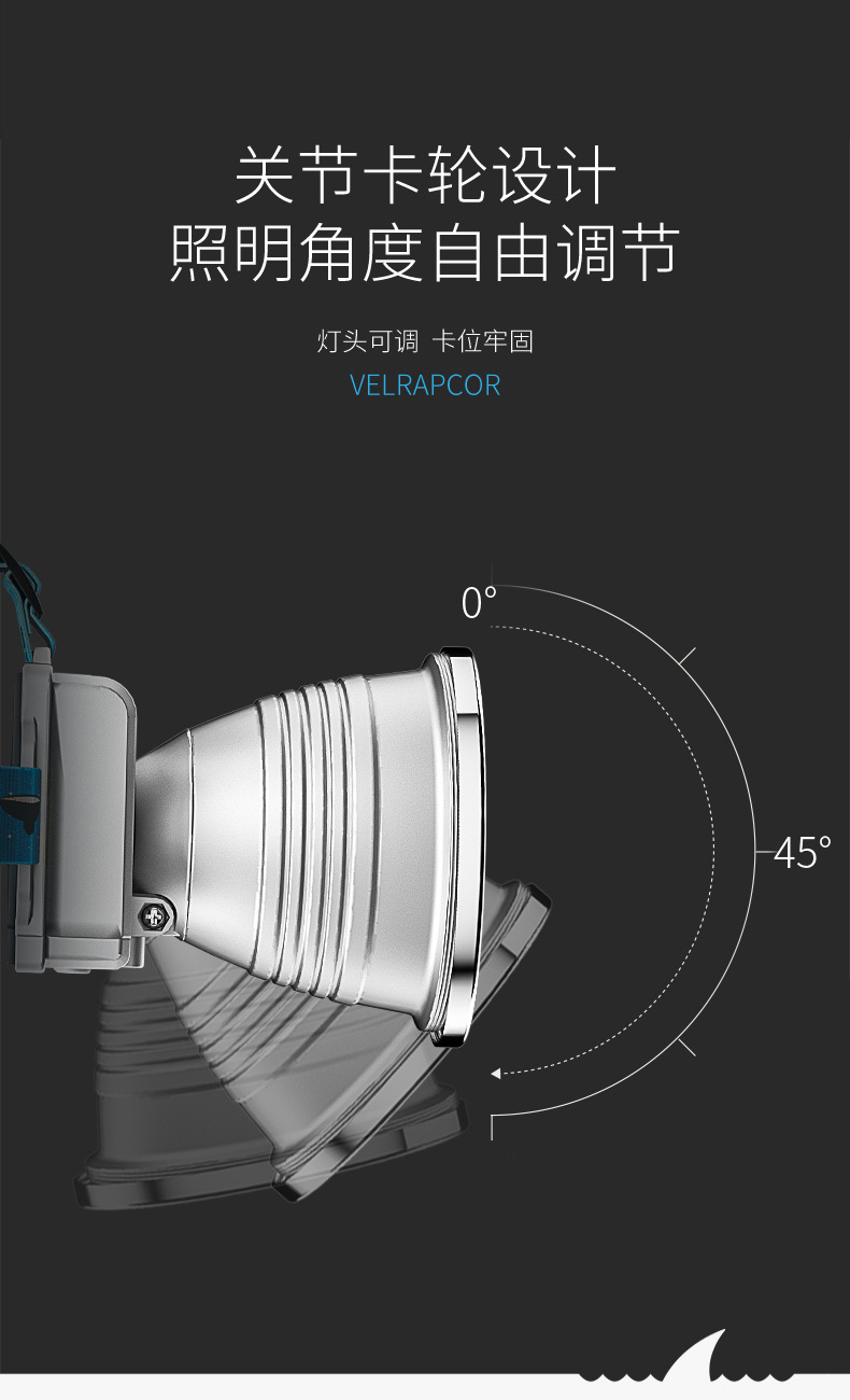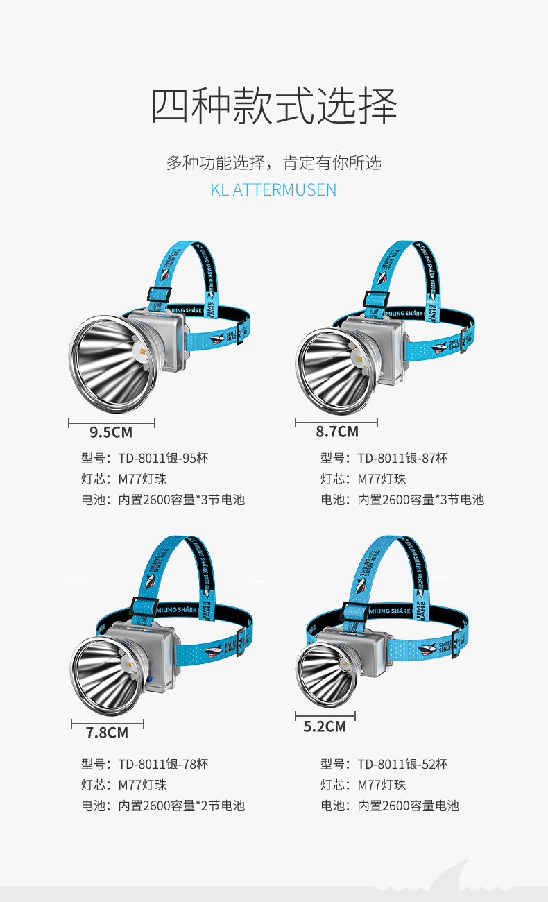 웃는 상어 강한 빛 조명 휴대용 헤드 램프 야외 높은 밝기 알루미늄 라이트 컵 충전 긴 내구성 헤드 램프
