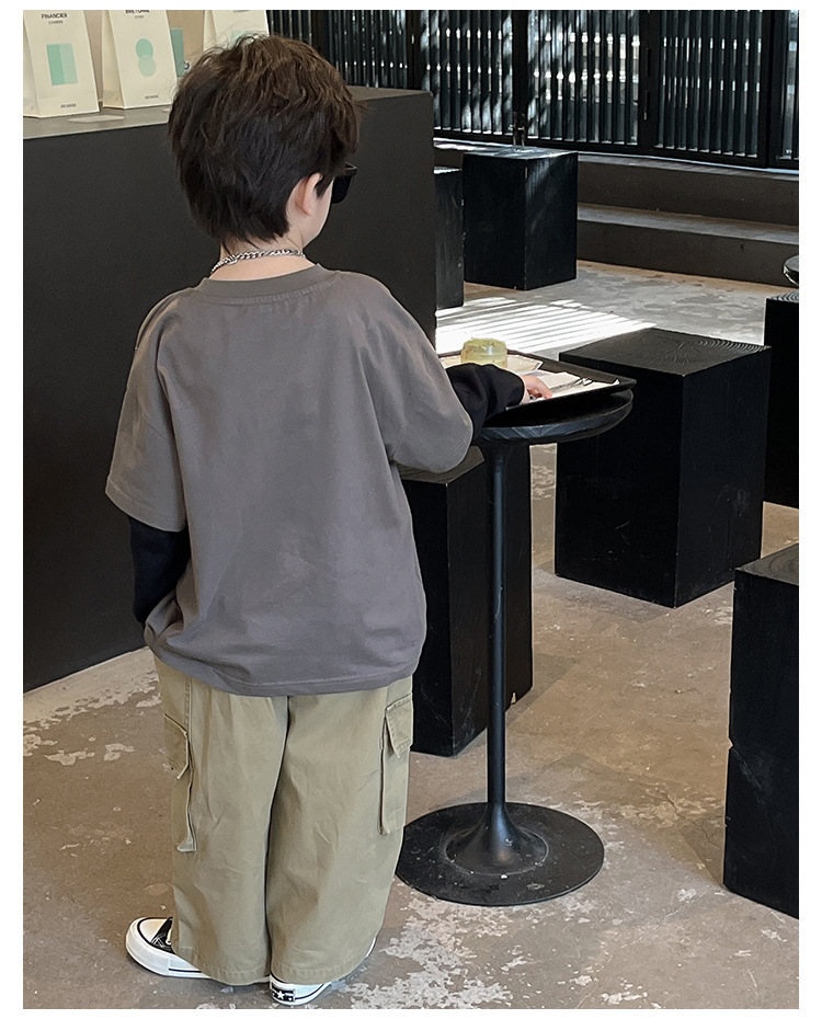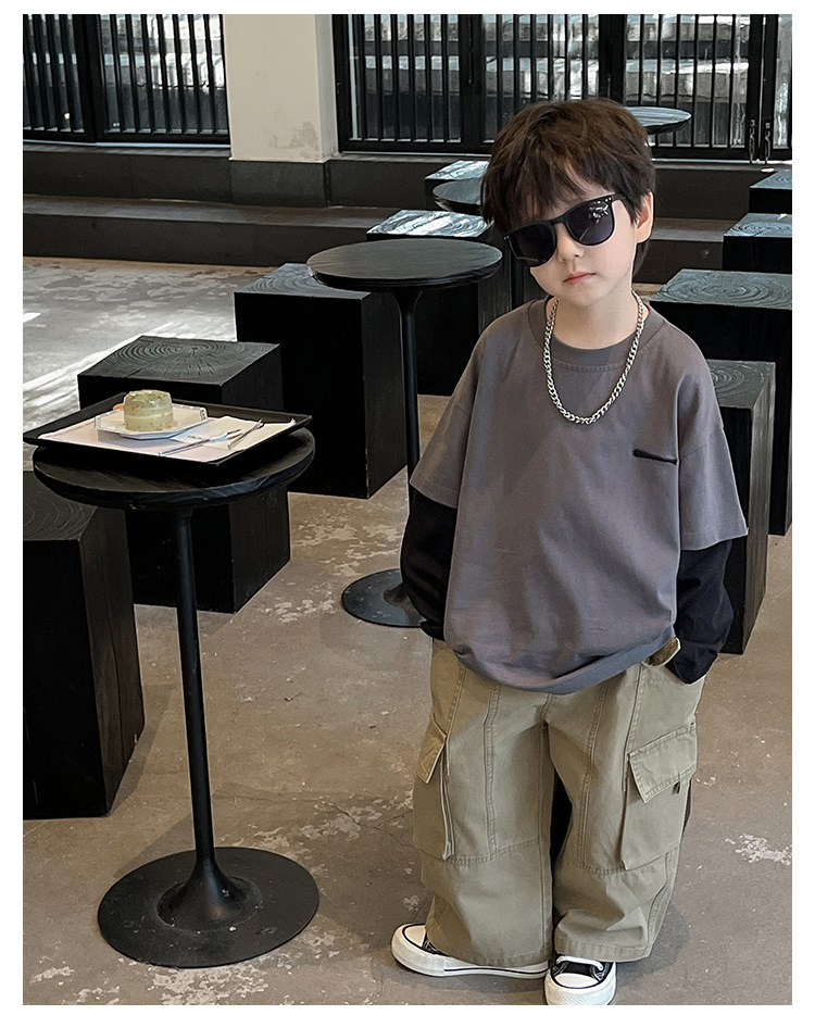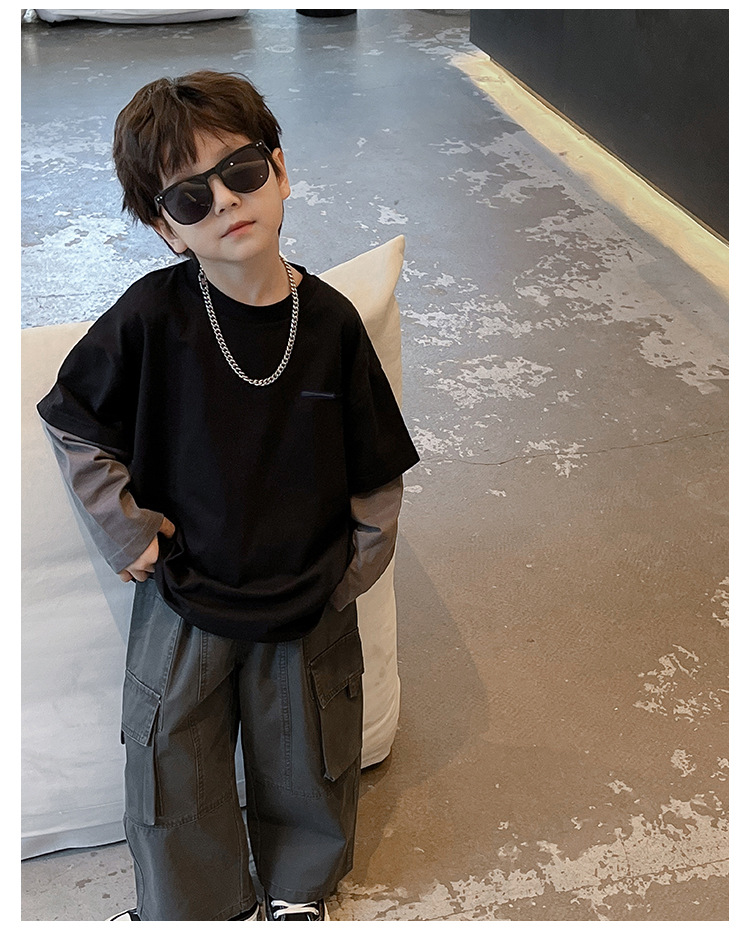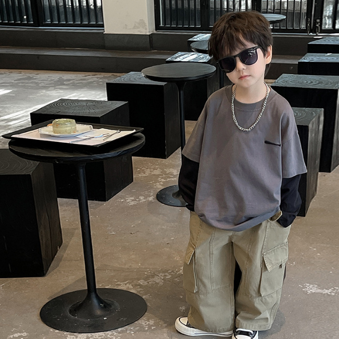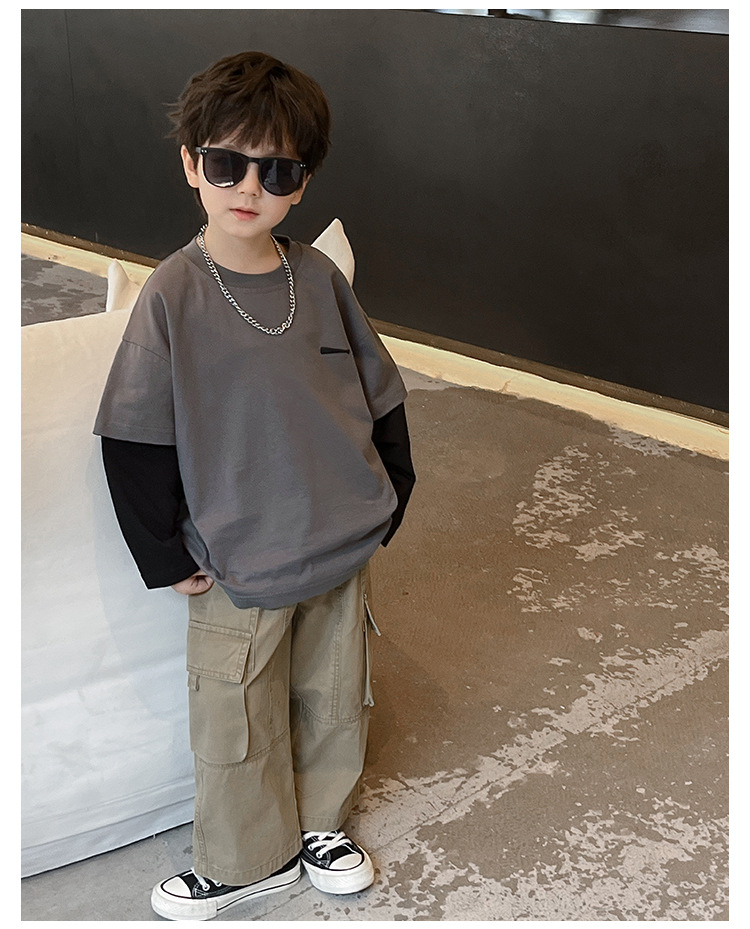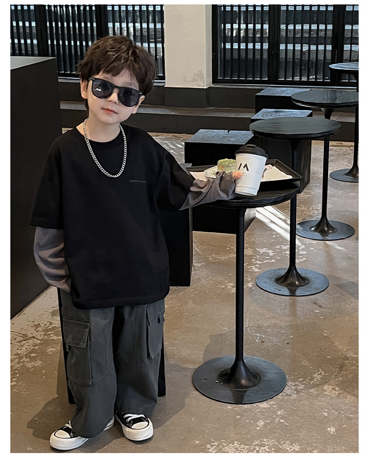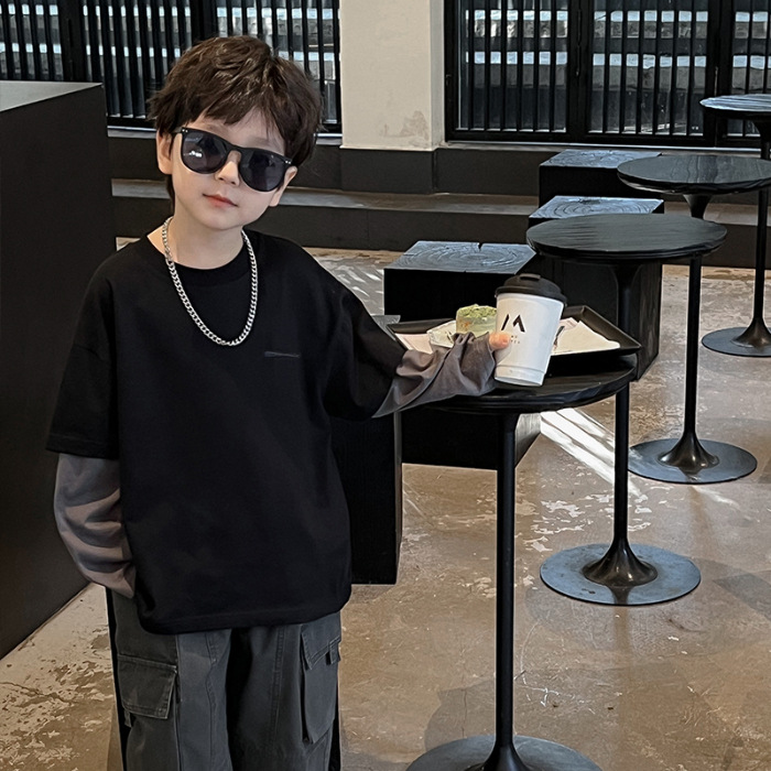남학생 '2024 새 봄과 가을 긴팔 티셔츠 빅보이 트렌디 브랜드 올매치 느슨한 봄 원피스 어린이 가짜 투피스 탑