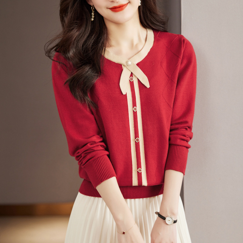 2024 가을과 겨울 새로운 한국 스타일 둥근 목 우아한 느슨한 캐주얼 스웨터 대비 컬러 니트 스웨터 긴 소매 최고 여성의 우아한