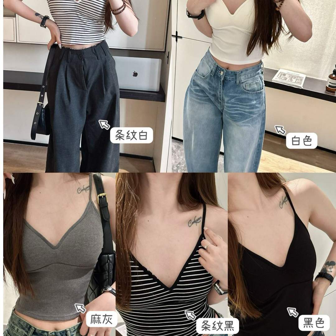 Feiziji 6879 줄무늬 V-Neck Camisole Vest 여성용 슬림 핏 착용 프리 브라, 가슴 패드스토어 가기