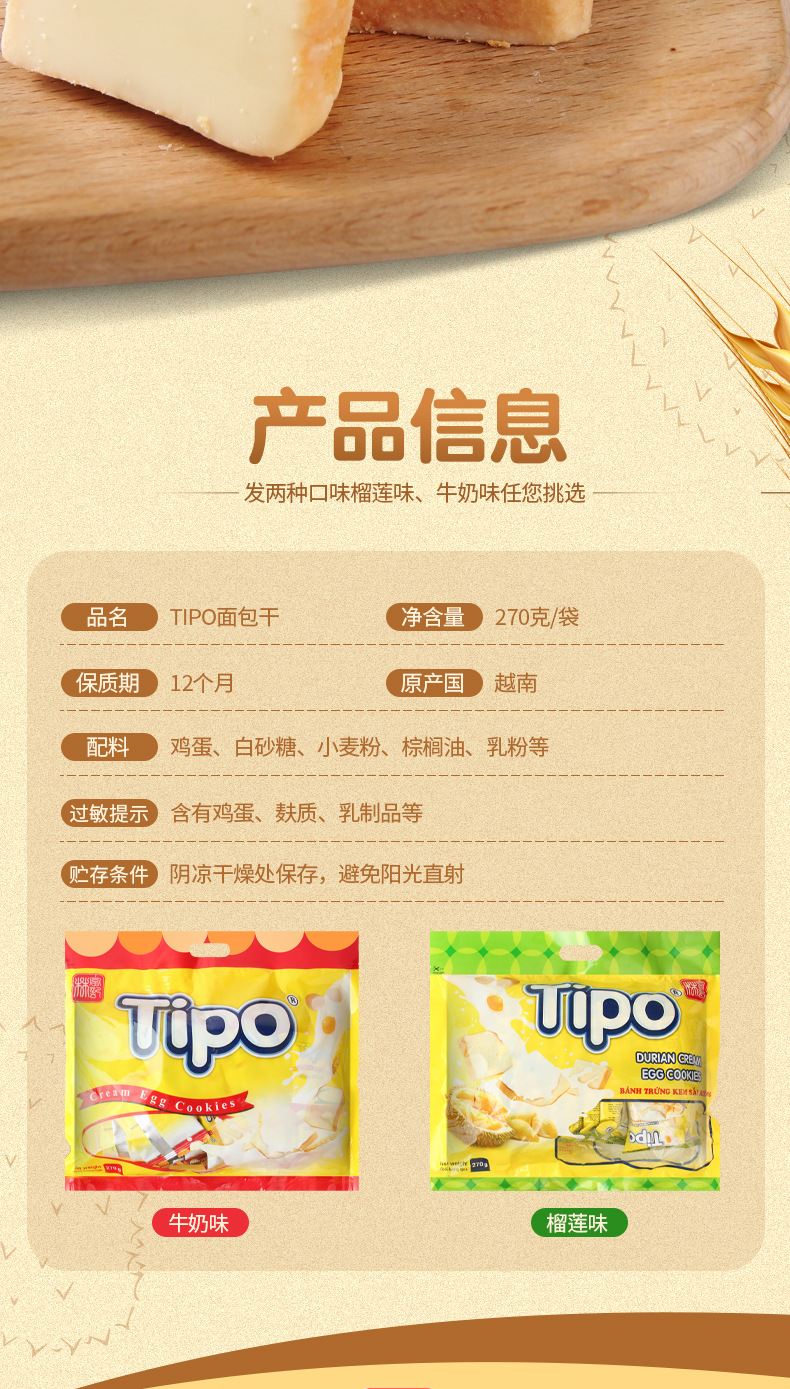 베트남 수입 티포 말린 빵 270g 원래 두리안 맛 계란 우유 빵 비스킷 스낵