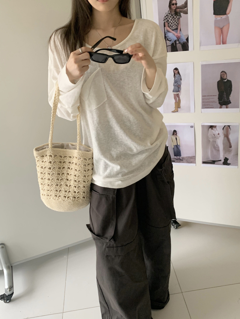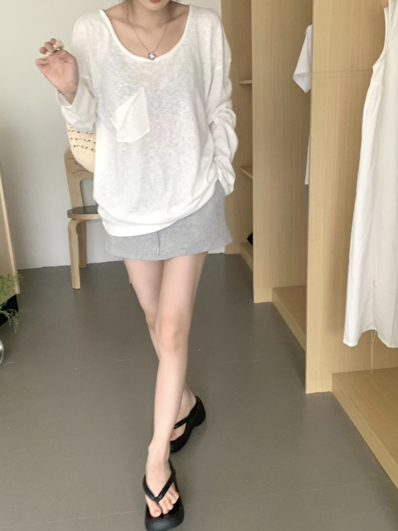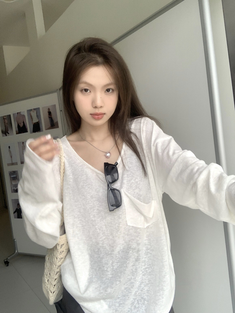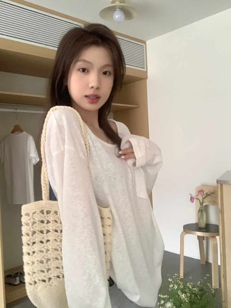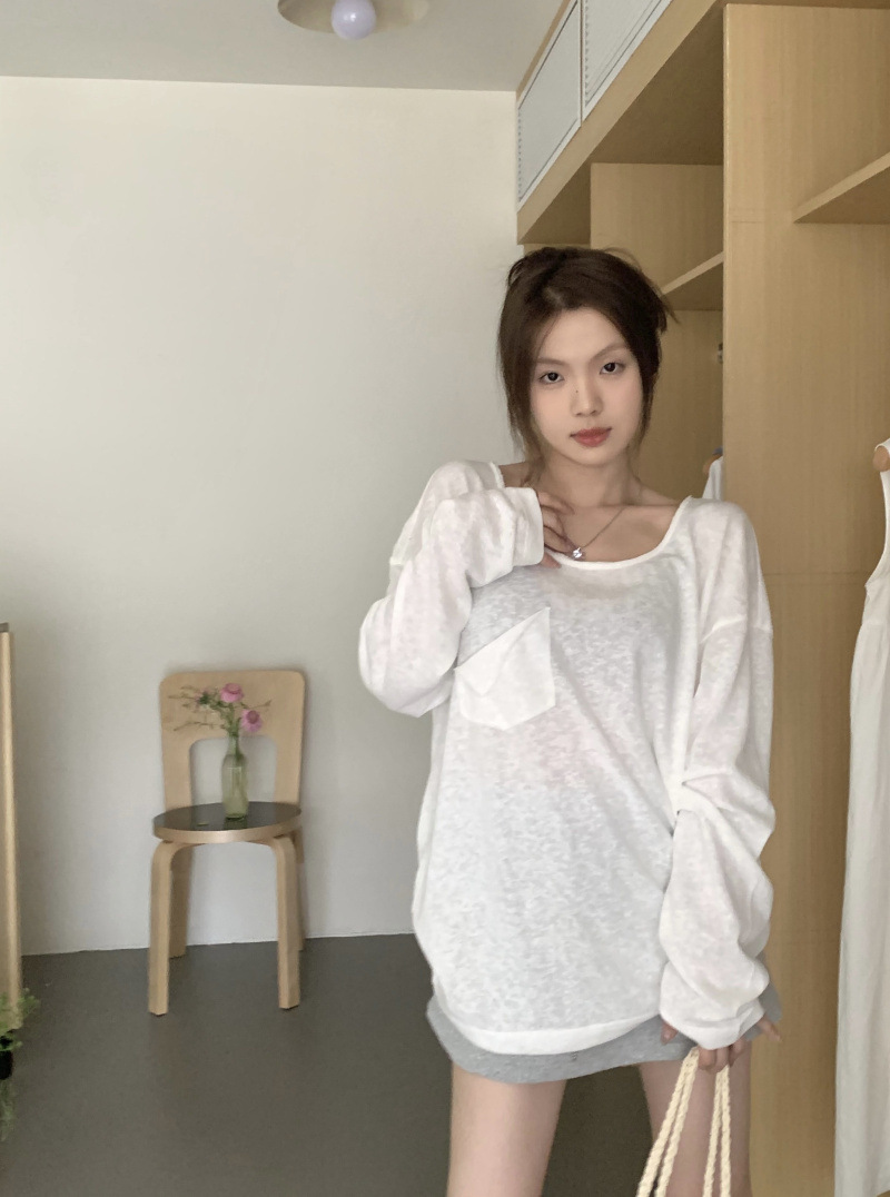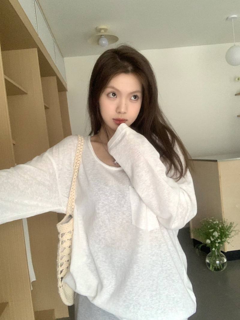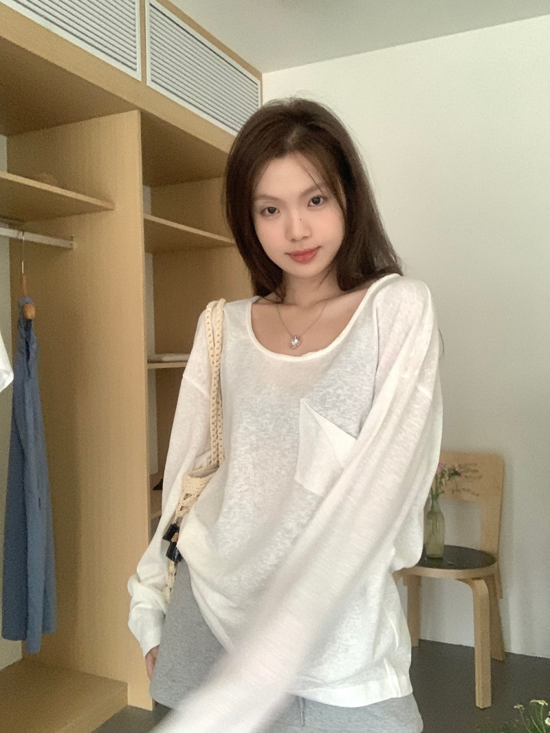 흰색 얇은 긴팔 선 스크린 블라우스 티셔츠 여성용 가을 게으른 스타일 느슨한 슬리밍 캐주얼 올 매치 젠틀 탑