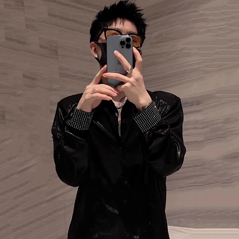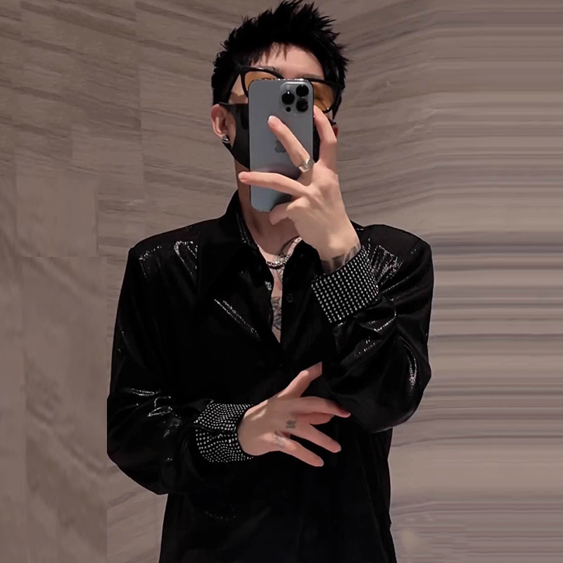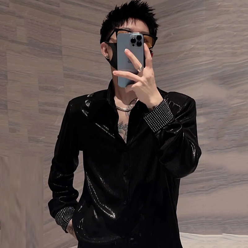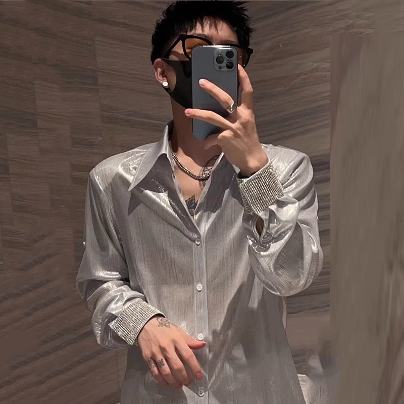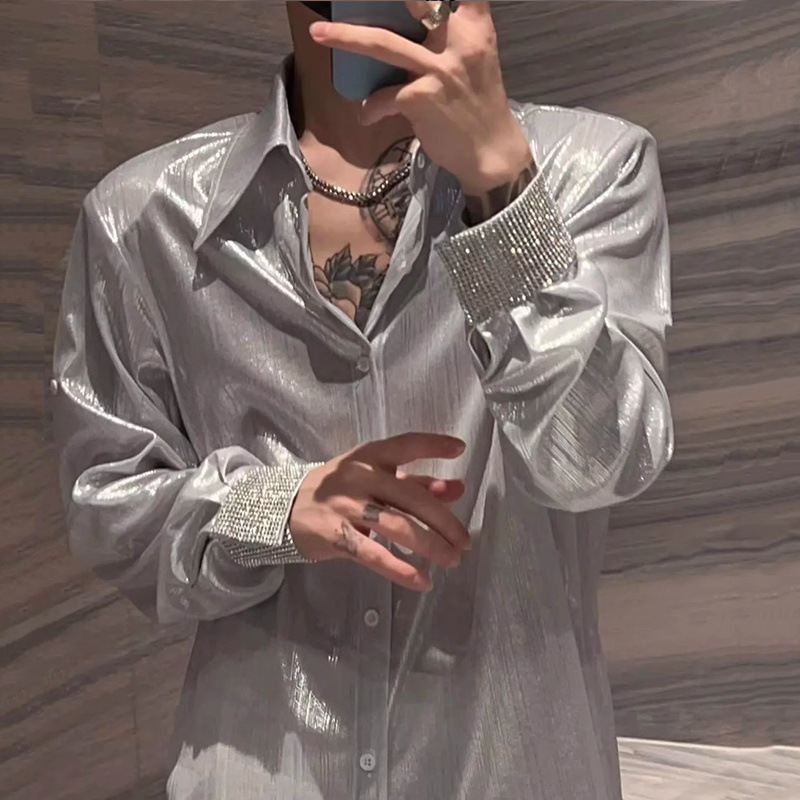유럽 잘 생긴 셔츠 남자의 틈새 컬러 밝은 표면 뜨거운 드릴링 카디건 액체 유리 원사 긴 소매 셔츠