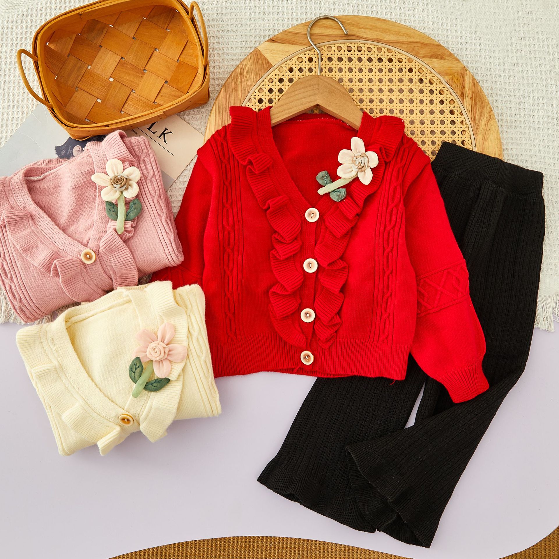 여자 스웨터 세트 2024 가을과 겨울 꽃 니트 카디건 니트 바지 어린이 공주 헤어 세트스토어 가기