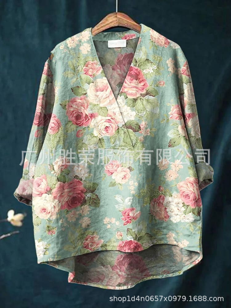 2024 새로운 국경 대외 무역 유럽과 미국의 봄과 가을 여성의 신선한 빈티지 꽃 인쇄 캐주얼 V 넥 여성용 셔츠