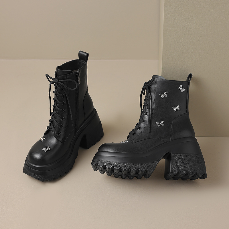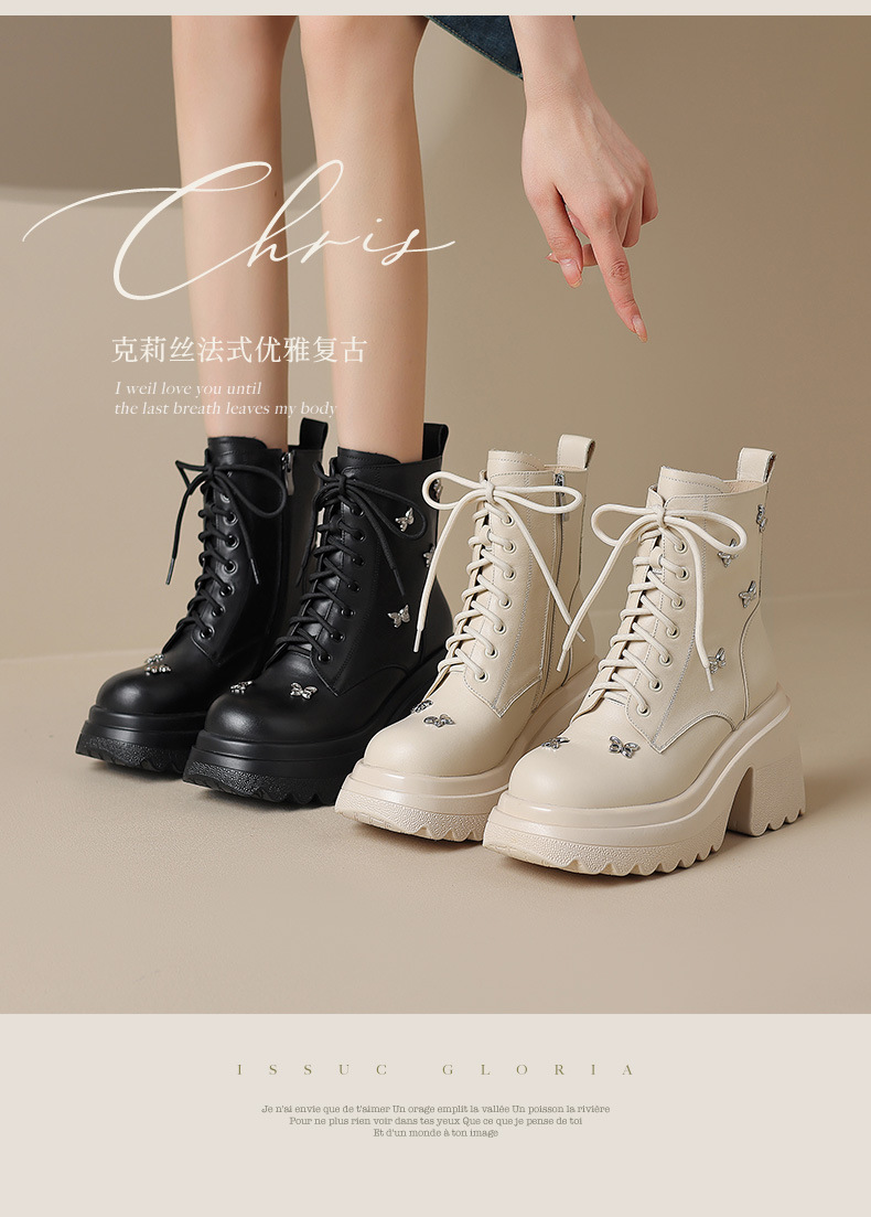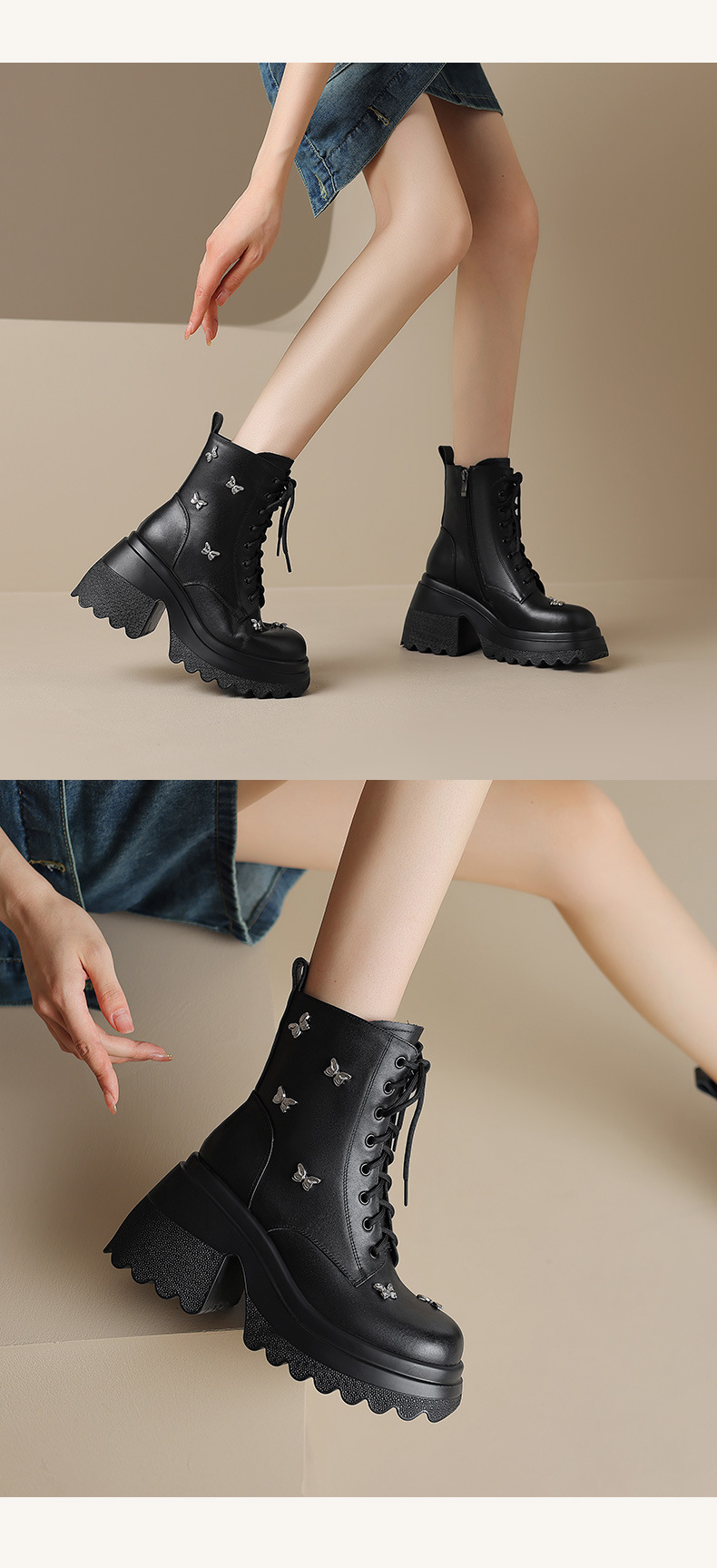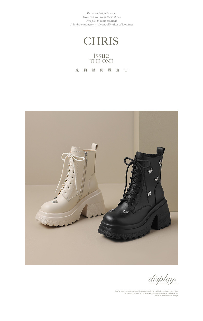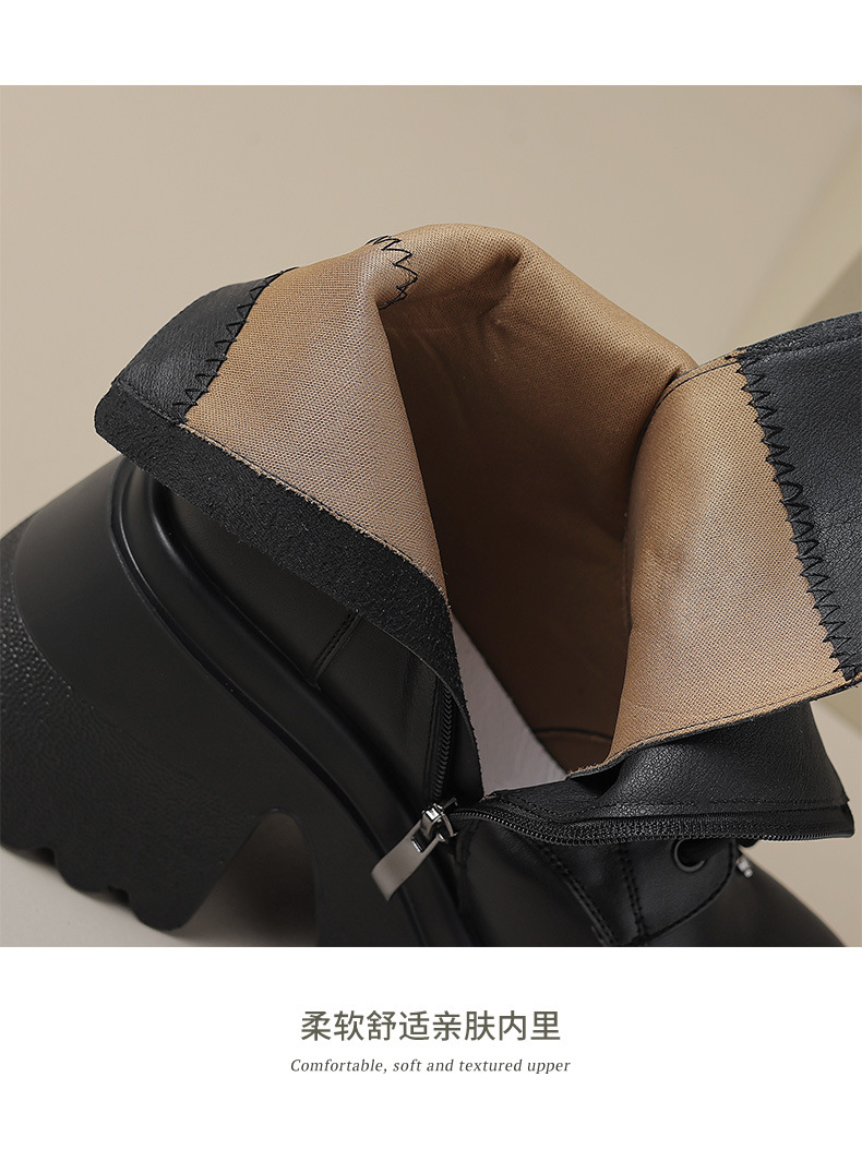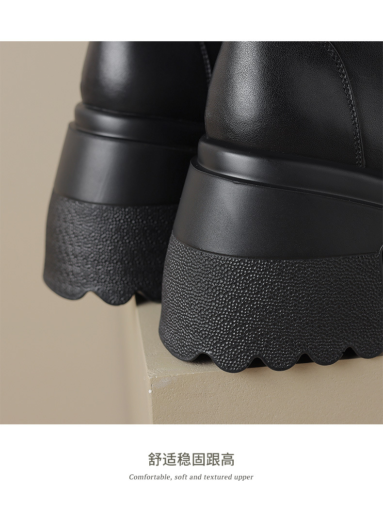 마틴 부츠 숏 가죽 부츠 여성용 10cm 짧은 키에도 잘 어울리는 두꺼운 굽 천연 가죽 라운드 토 두꺼운 밑창 영국 스타일 블랙 패션 부츠