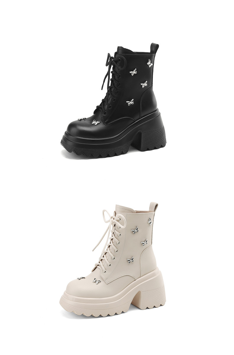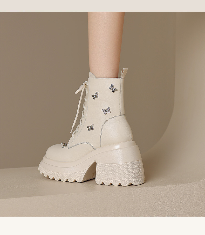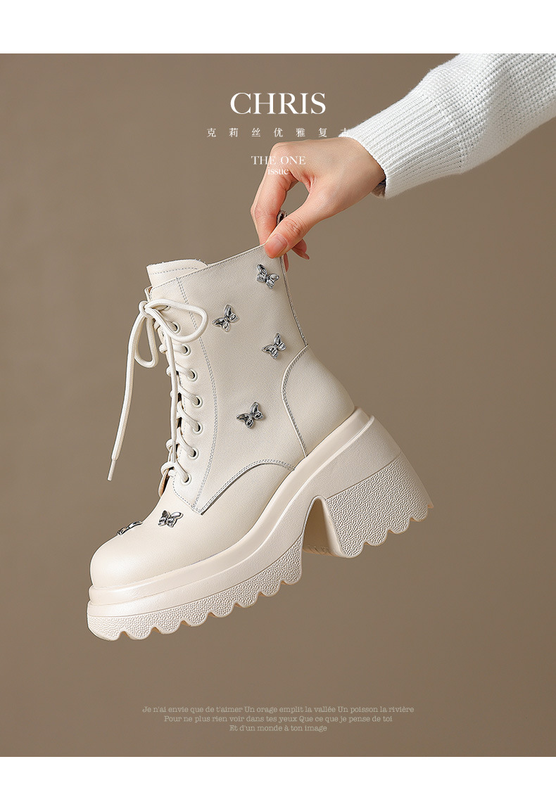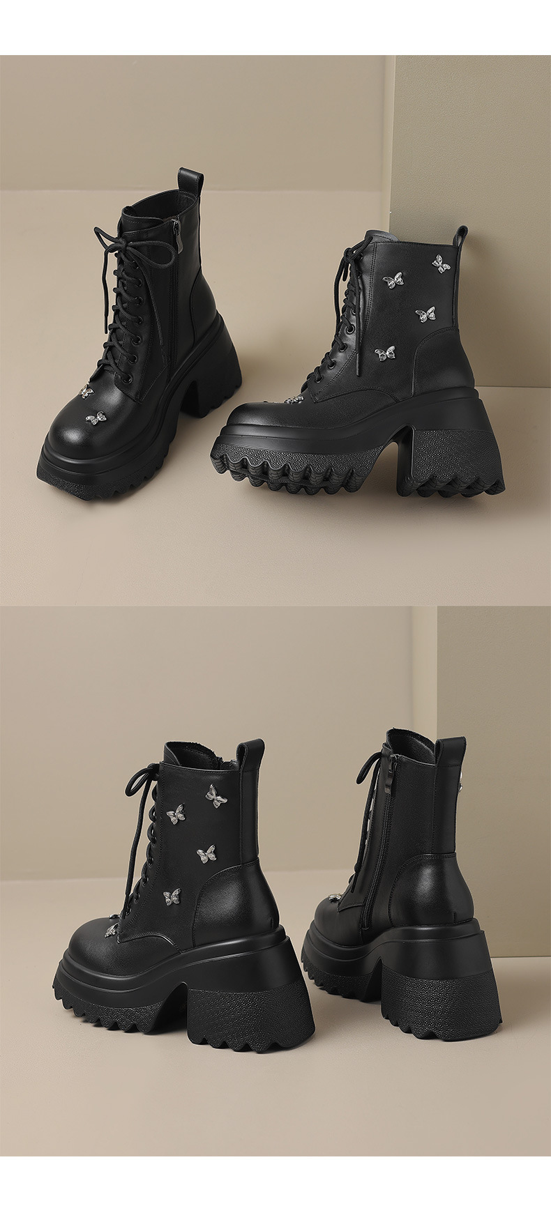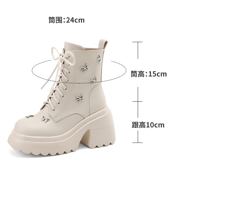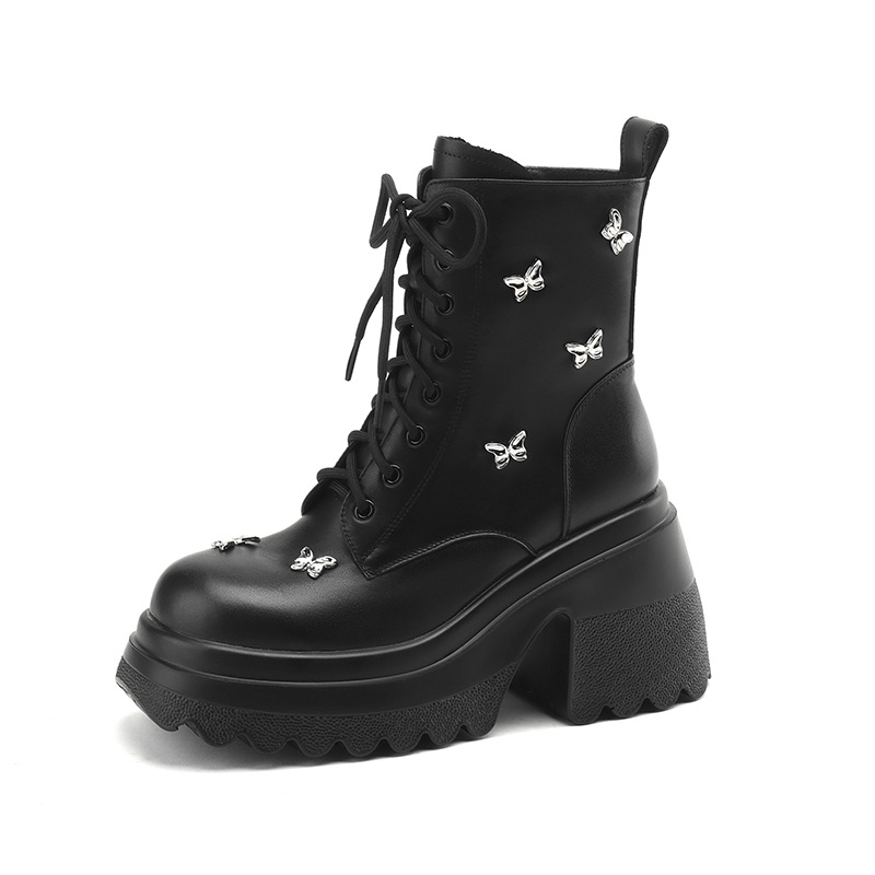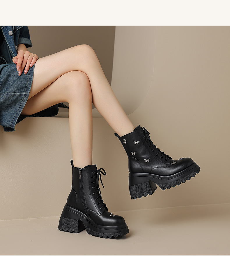 마틴 부츠 숏 가죽 부츠 여성용 10cm 짧은 키에도 잘 어울리는 두꺼운 굽 천연 가죽 라운드 토 두꺼운 밑창 영국 스타일 블랙 패션 부츠