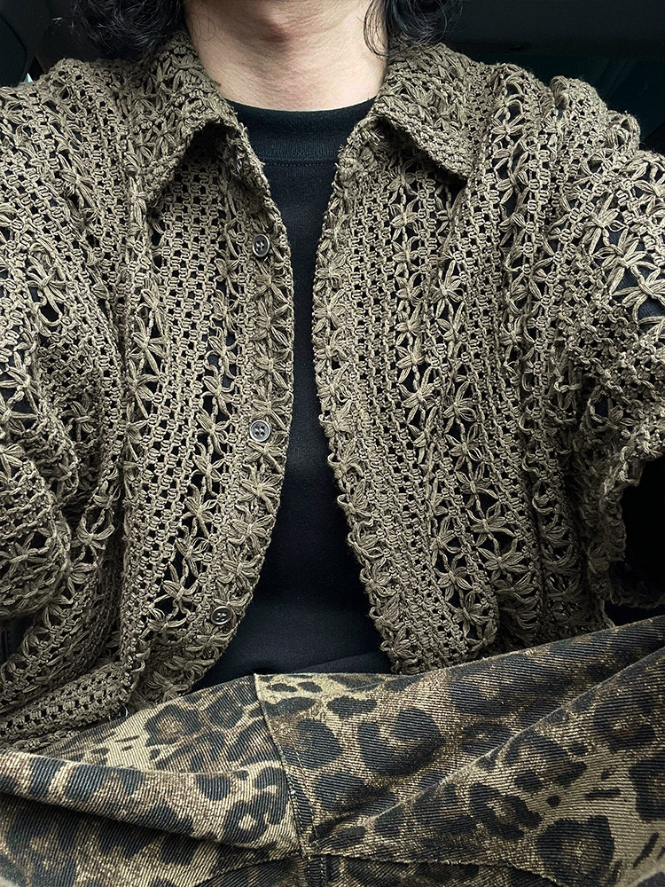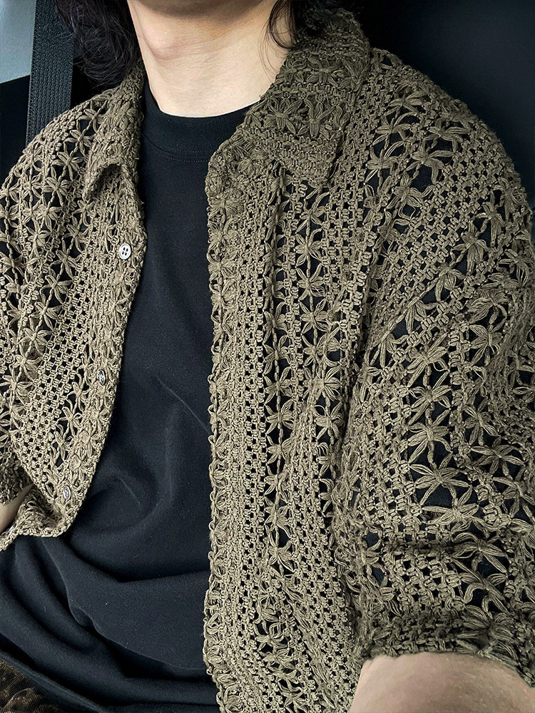 클린 핏 카키 할로우 니트 셔츠 남성 반팔 여름 새로운 미국 스타일 복고풍 휴가 스타일 Lel 하프 슬리브스토어 가기