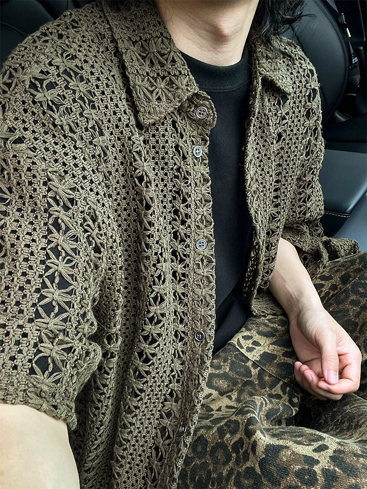 클린 핏 카키 할로우 니트 셔츠 남성 반팔 여름 새로운 미국 스타일 복고풍 휴가 스타일 Lel 하프 슬리브