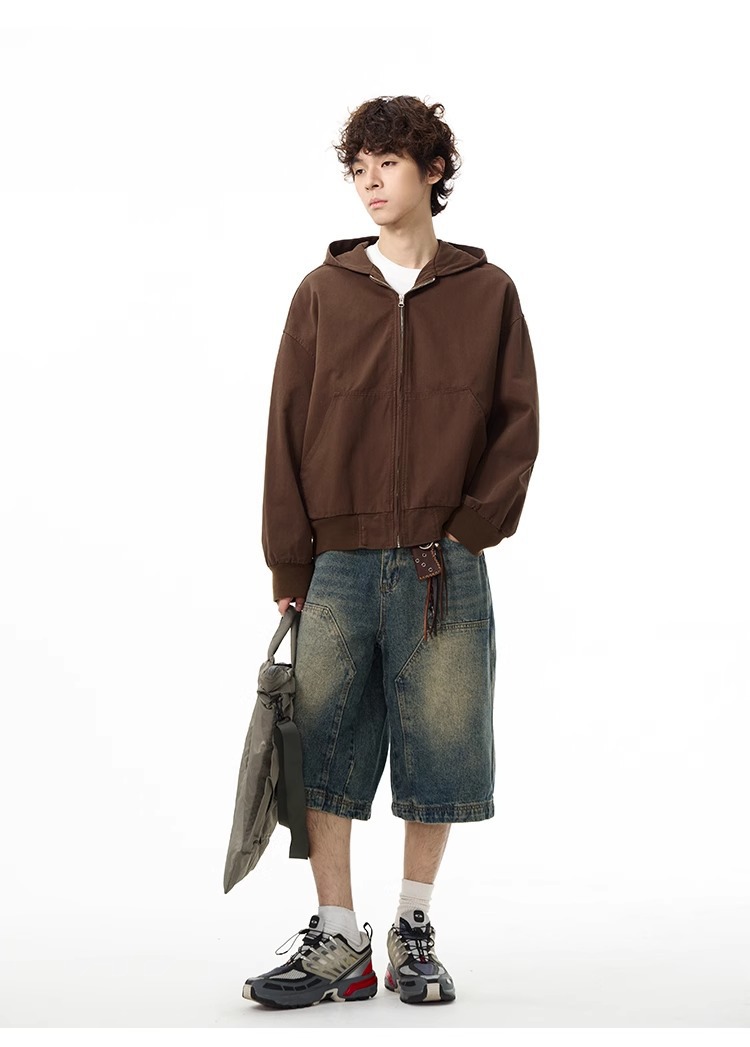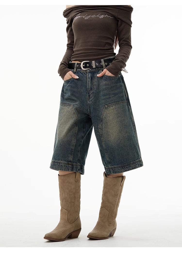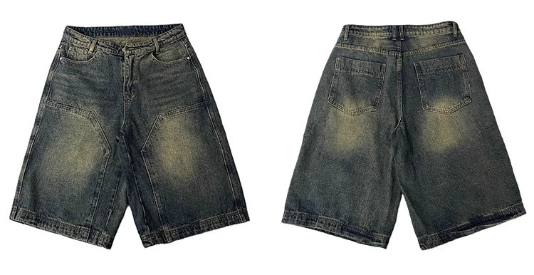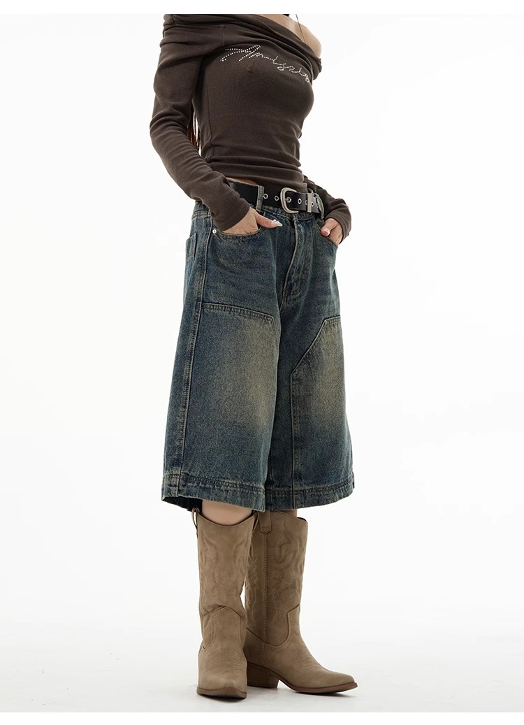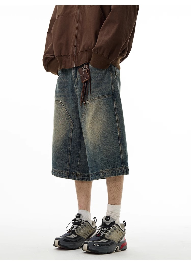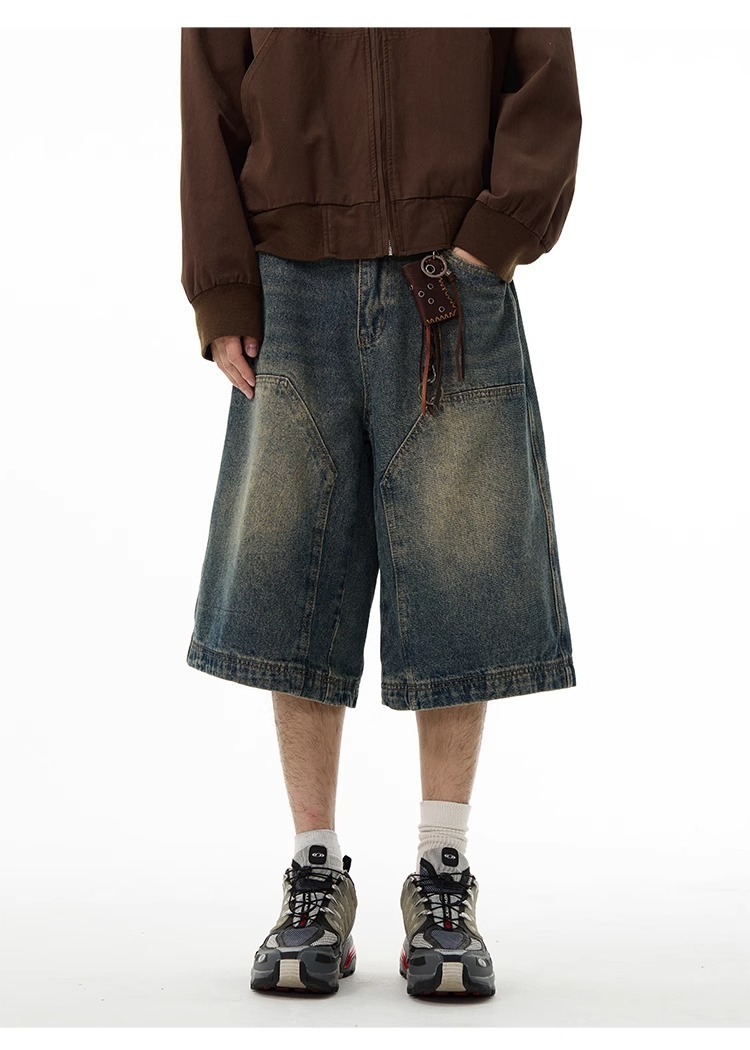 미국 하이 엔드 센스 데님 반바지 남자 레트로 바지 유럽과 미국의 로깅 와이드 레그 반바지 6 발 바지 커플 여름스토어 가기