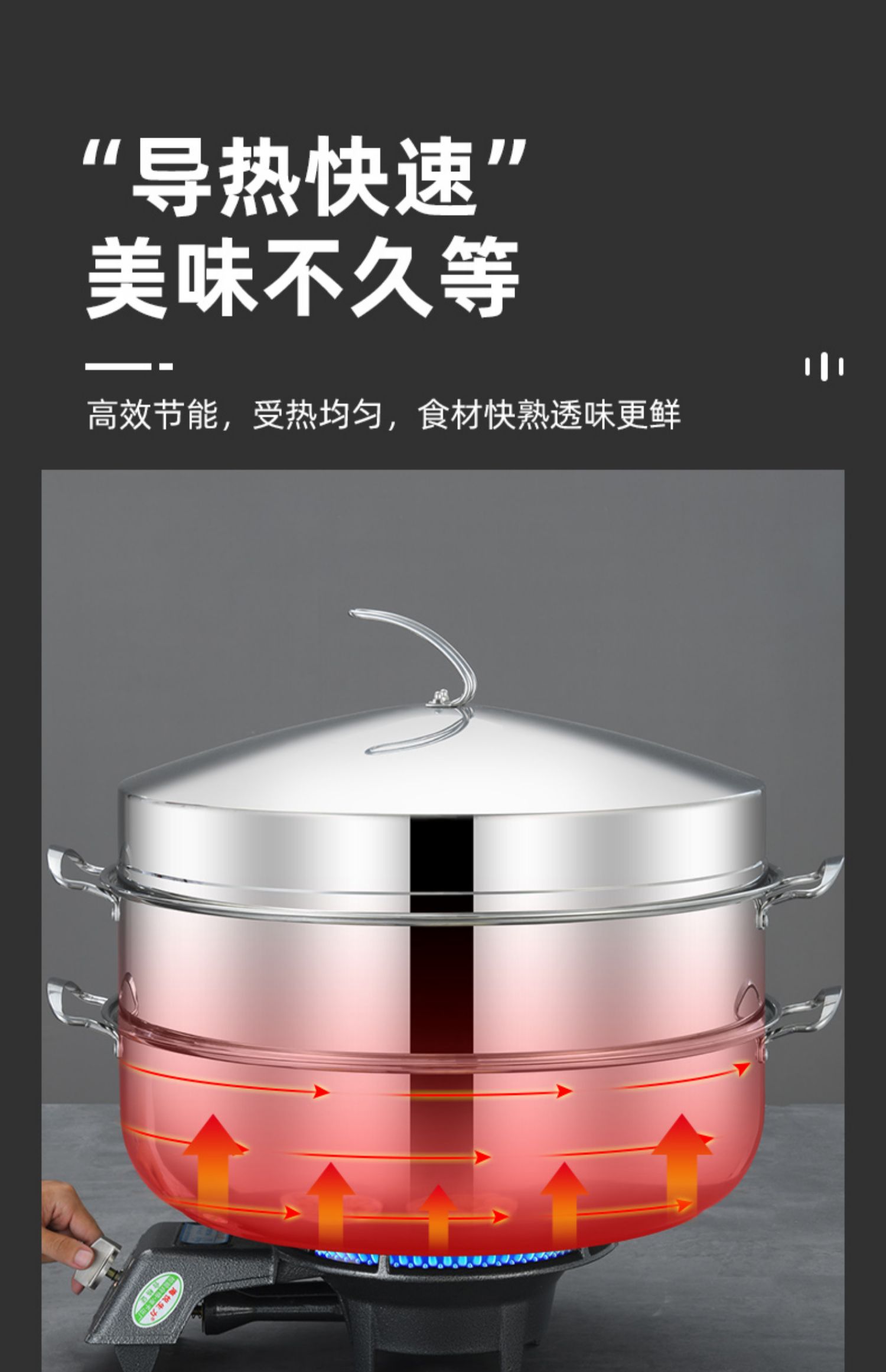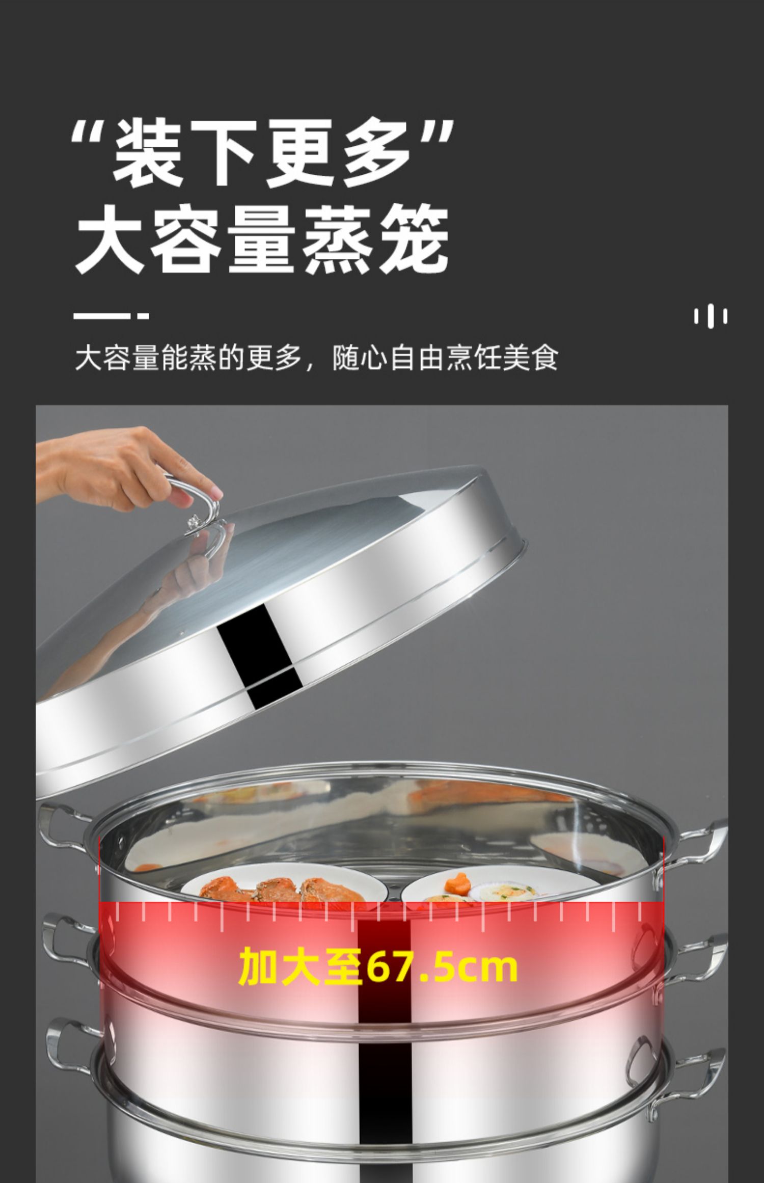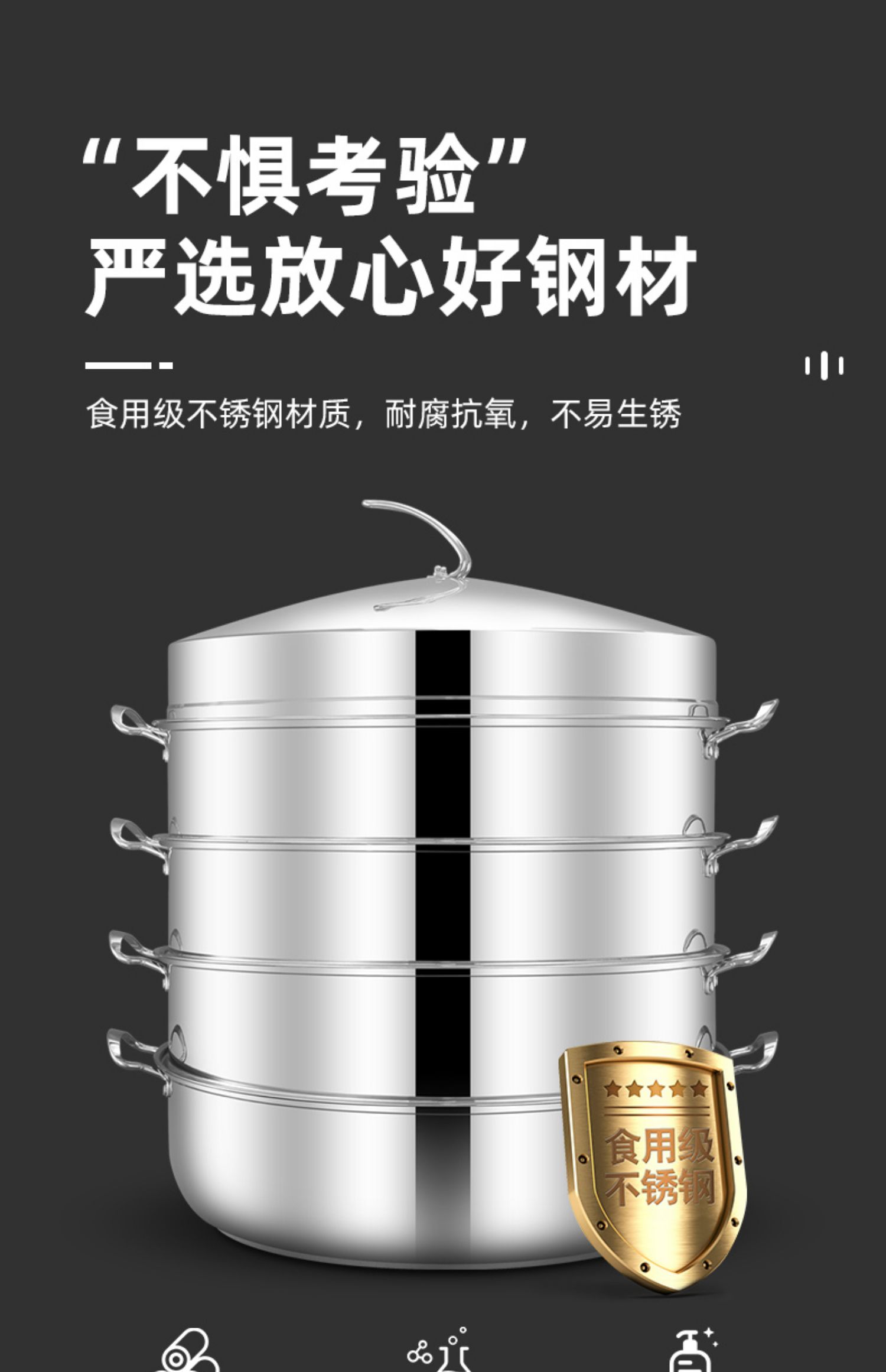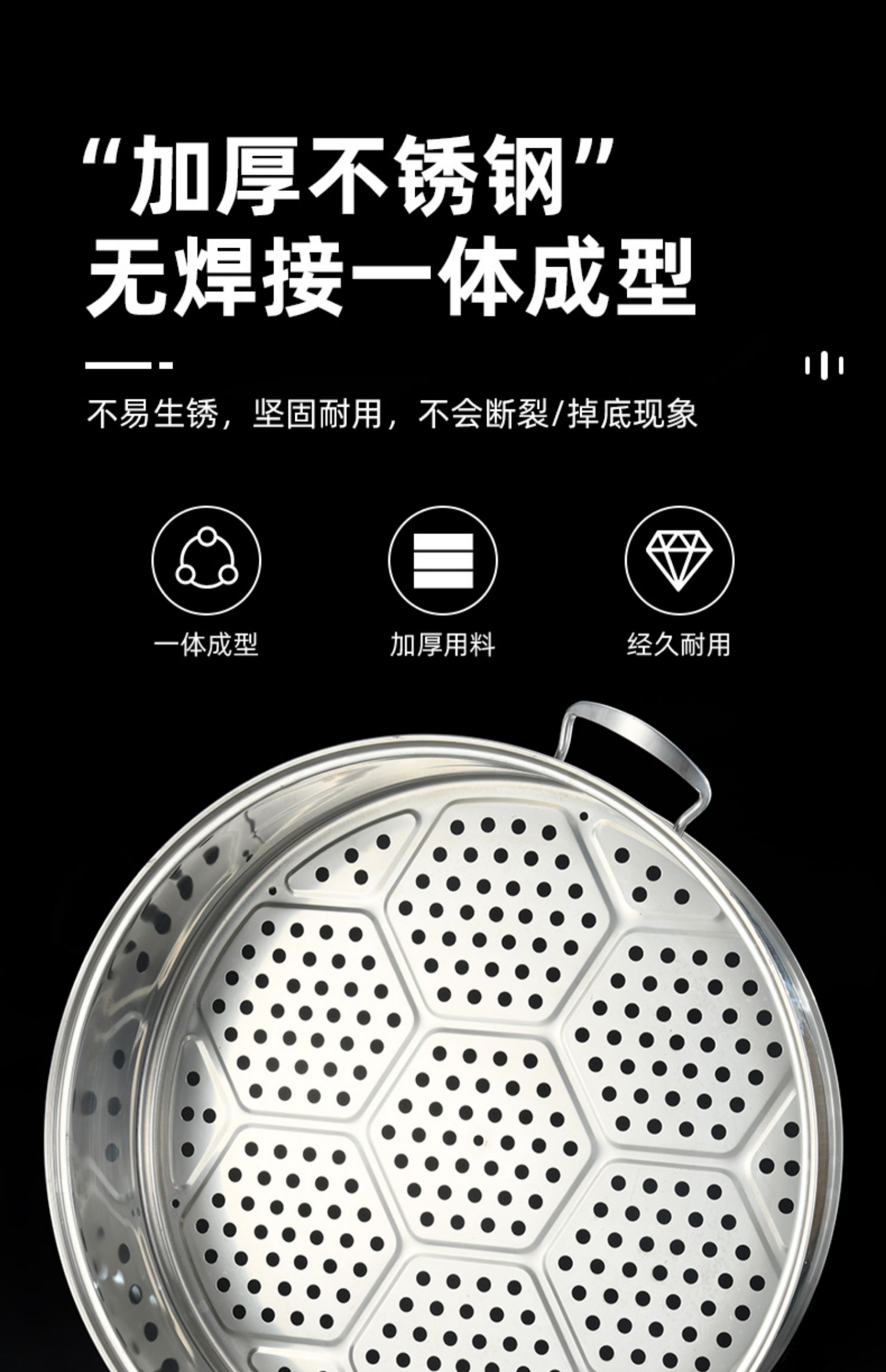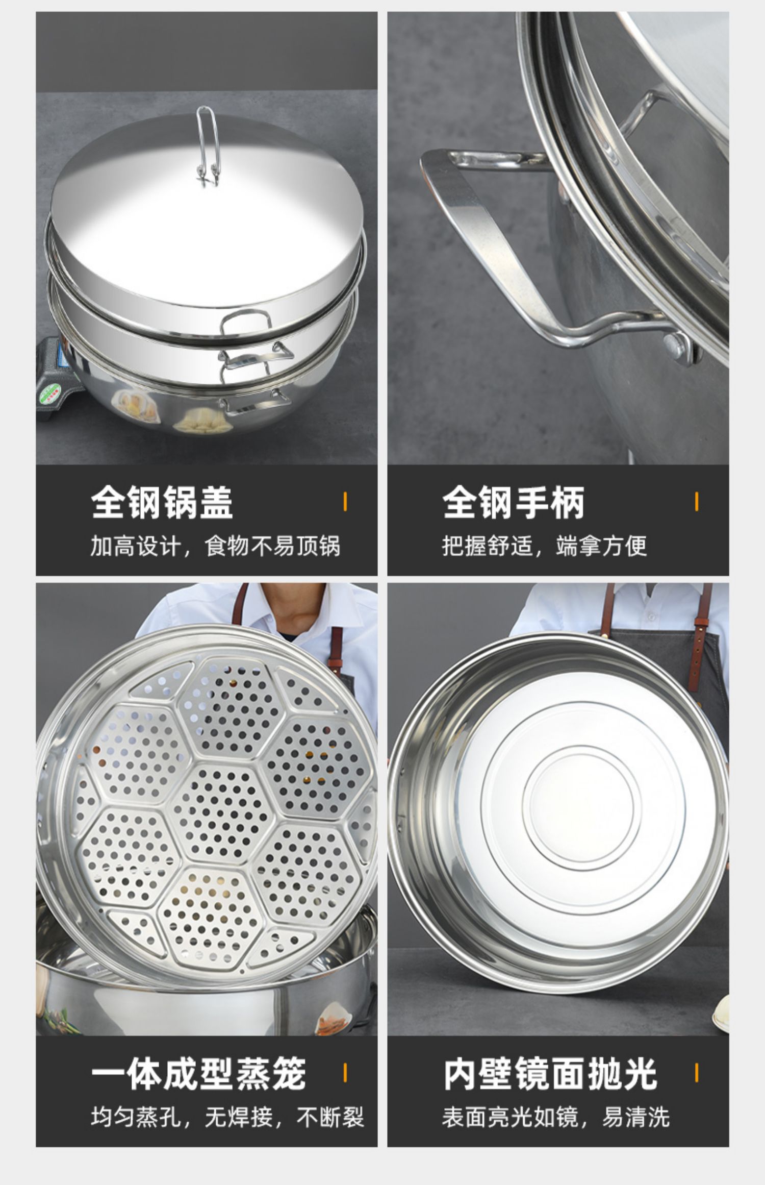 • 3단 냄비 포함(하단 냄비 1개 + 찜기 2개 + 찜 시트 1개 + 뚜껑)_용접 없이 일체형 성형