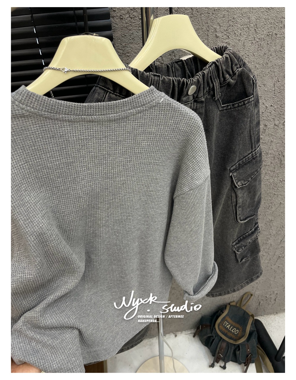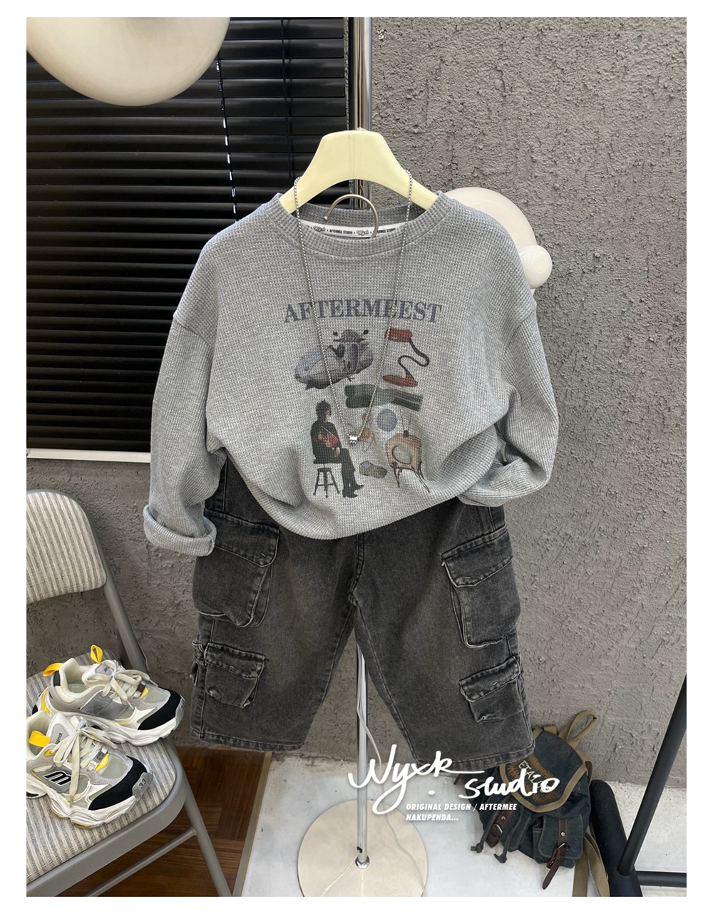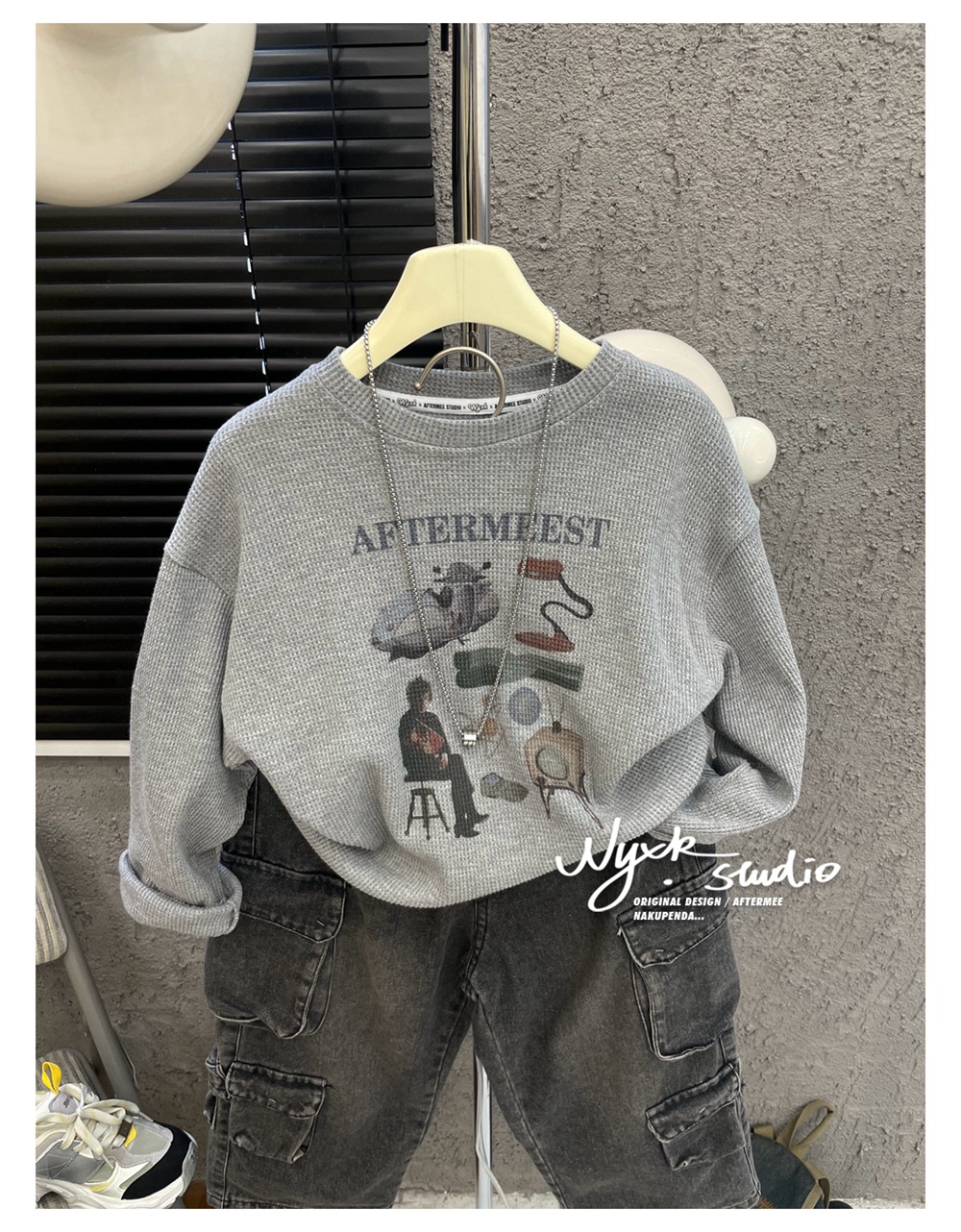 어린이 두꺼운 디지털 인쇄 긴 소매 티셔츠 와플베이스 셔츠 2024 가을 새 소년의 느슨한 탑