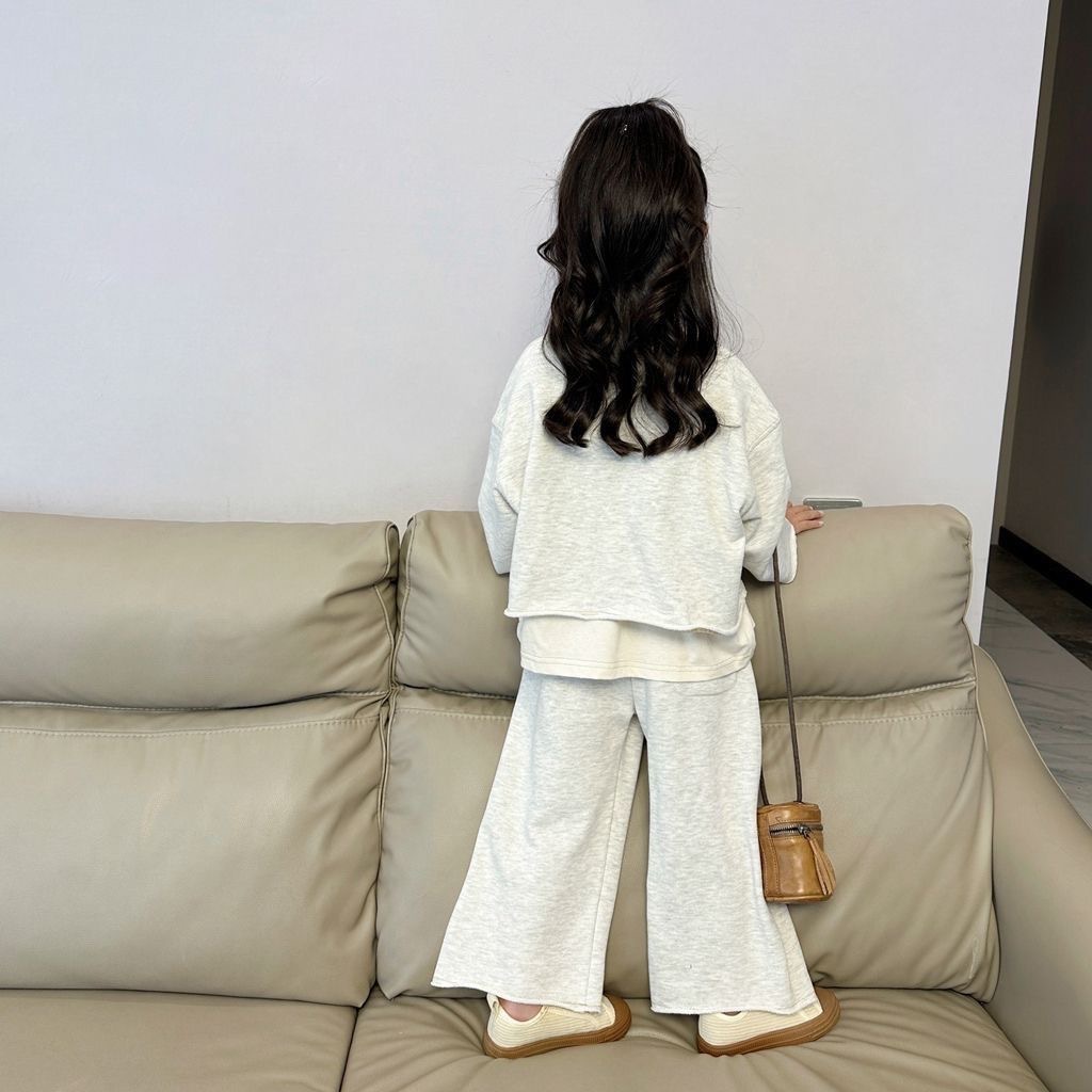 여자 스웨터 세트 가을 새로운 한국 캐주얼 어린이 느슨한 가짜 투피스 탑 와이드 다리 바지 여성의 가을