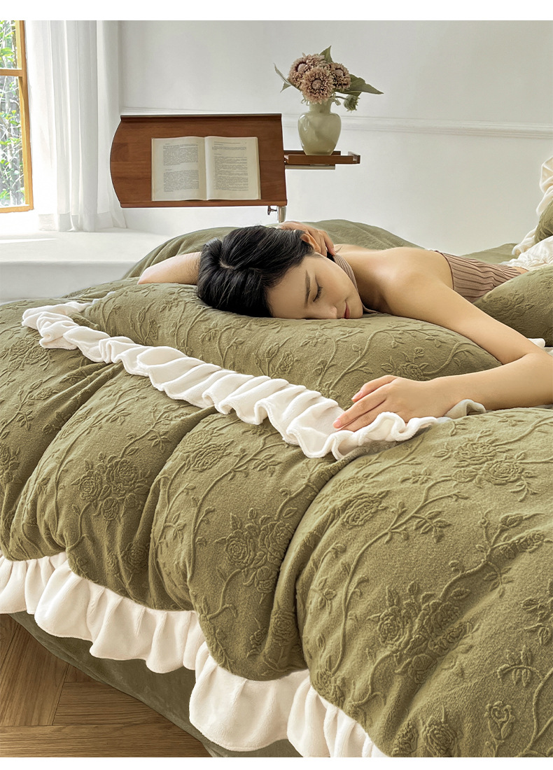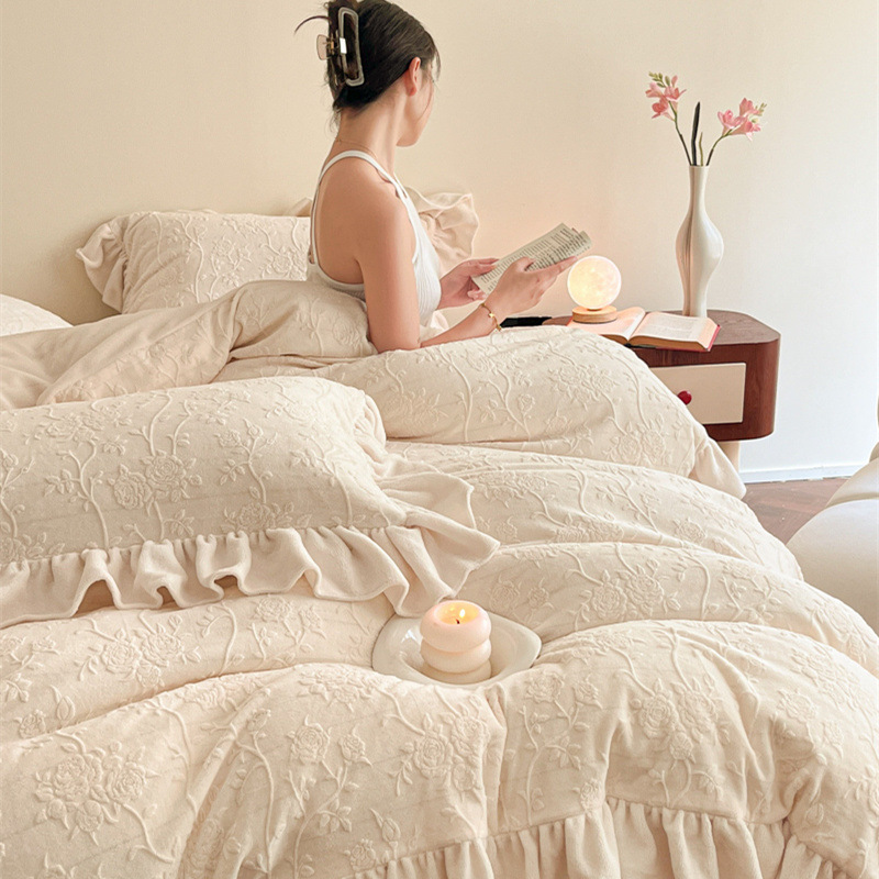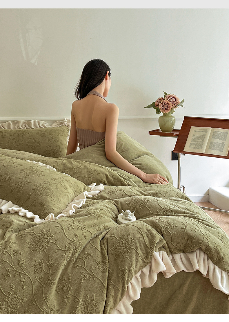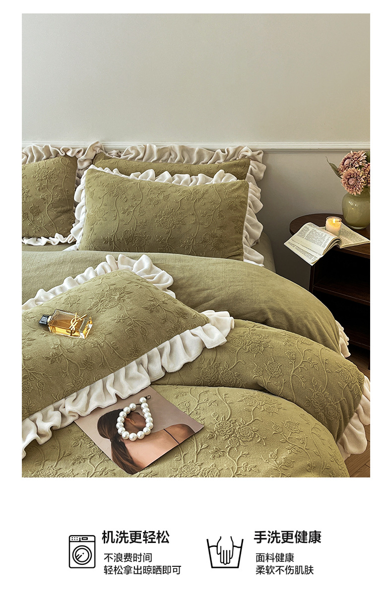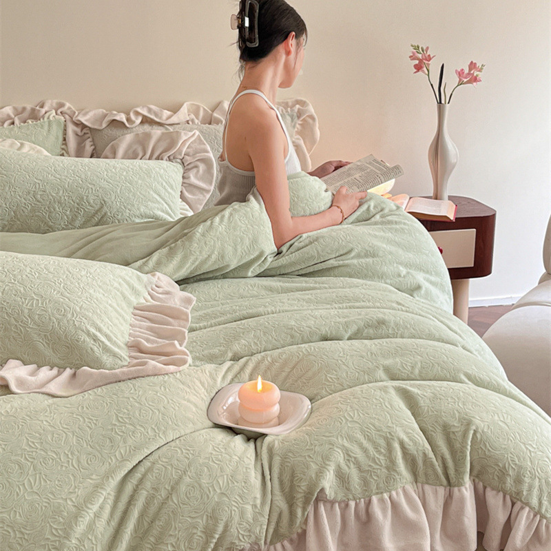 가벼운 고급 모성 및 유아 학년 밀크 벨벳 4 피스 세트 가을과 겨울 두꺼운 따뜻한 조각 3 피스 세트 세척 가능한 정전기 방지 퀼트 커버
