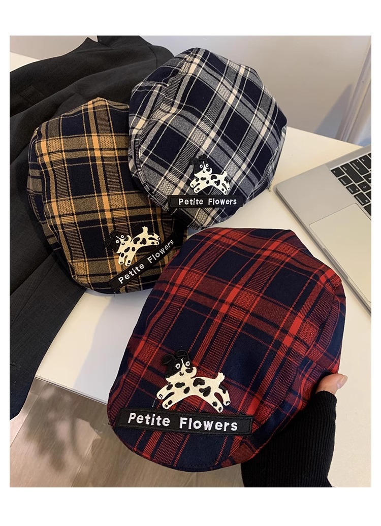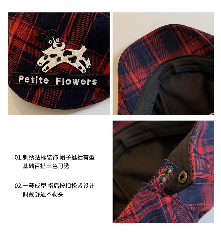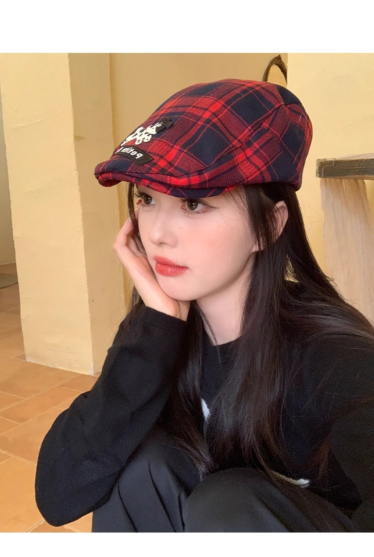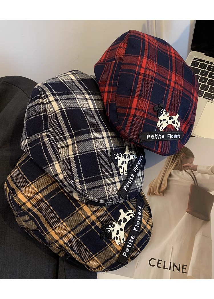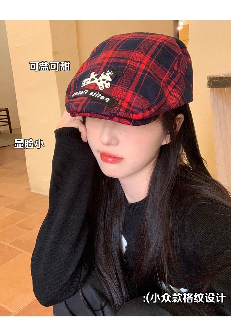 한국식 붉은 격자 무늬 강아지 앞으로 모자 여성 봄과 가을 올 매치 틈새 베레모 큰 머리 둘레 얼굴 작은 모자