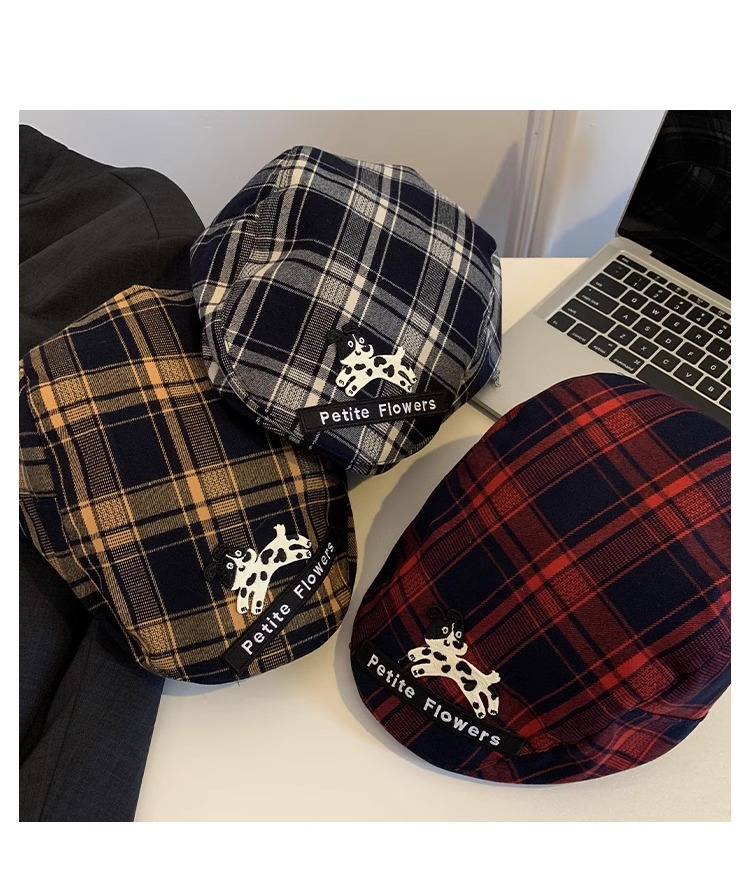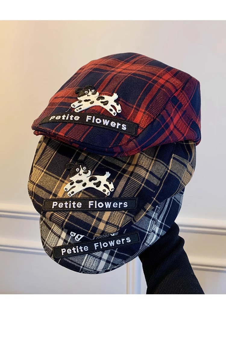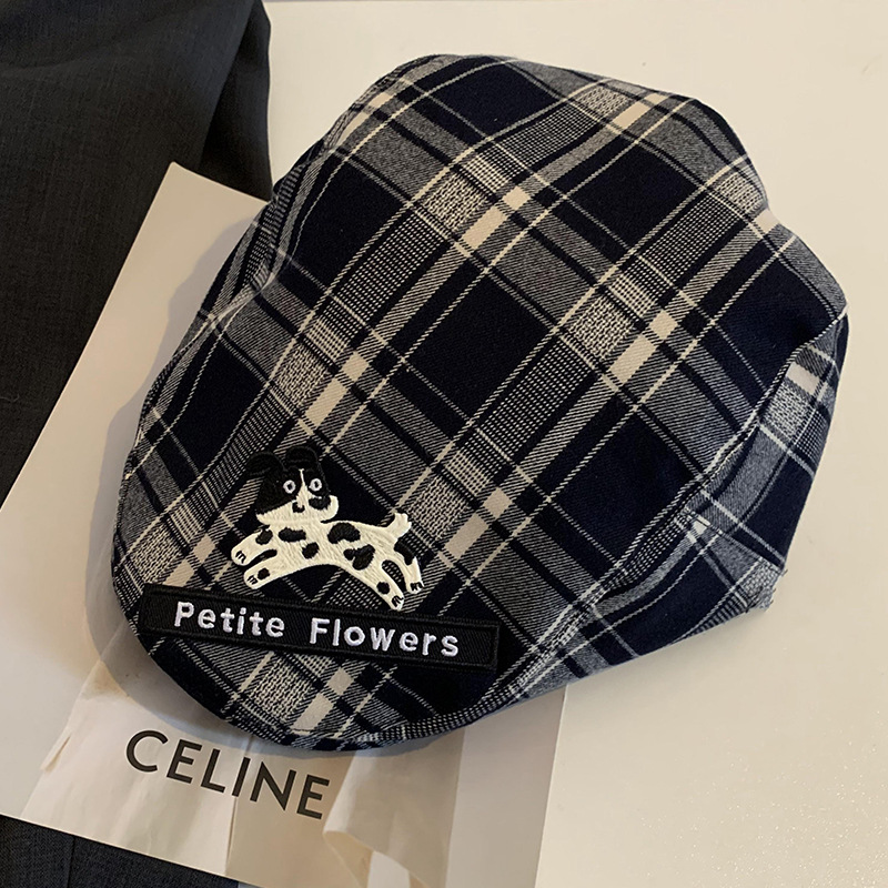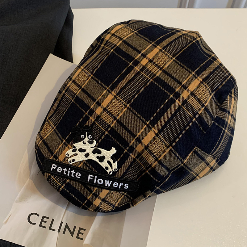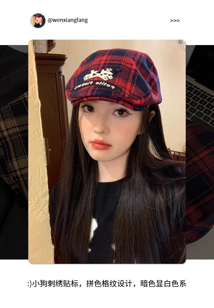 한국식 붉은 격자 무늬 강아지 앞으로 모자 여성 봄과 가을 올 매치 틈새 베레모 큰 머리 둘레 얼굴 작은 모자