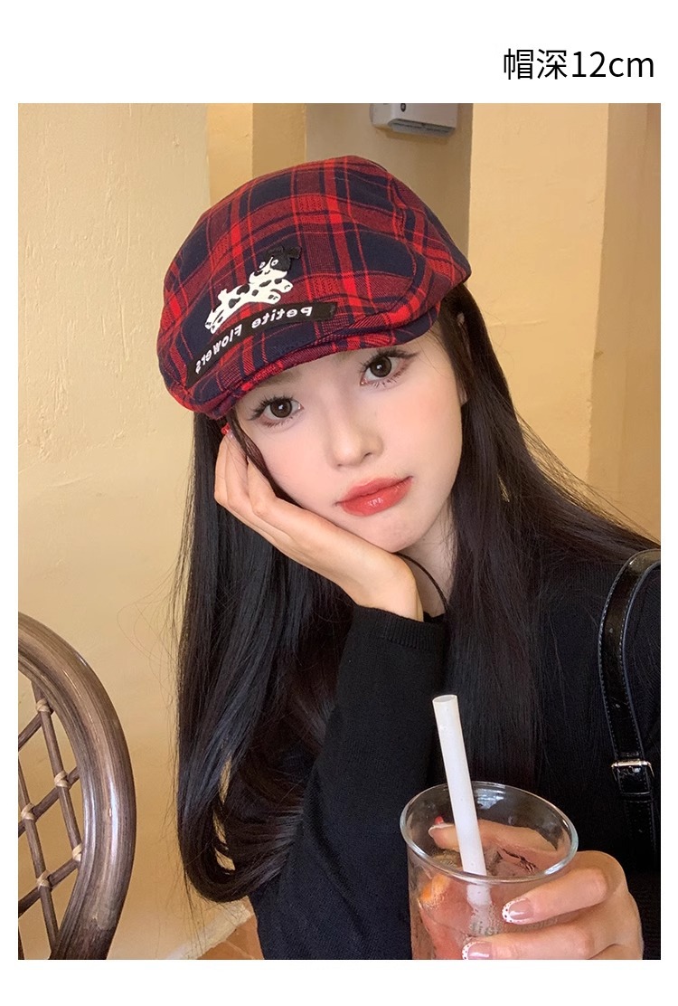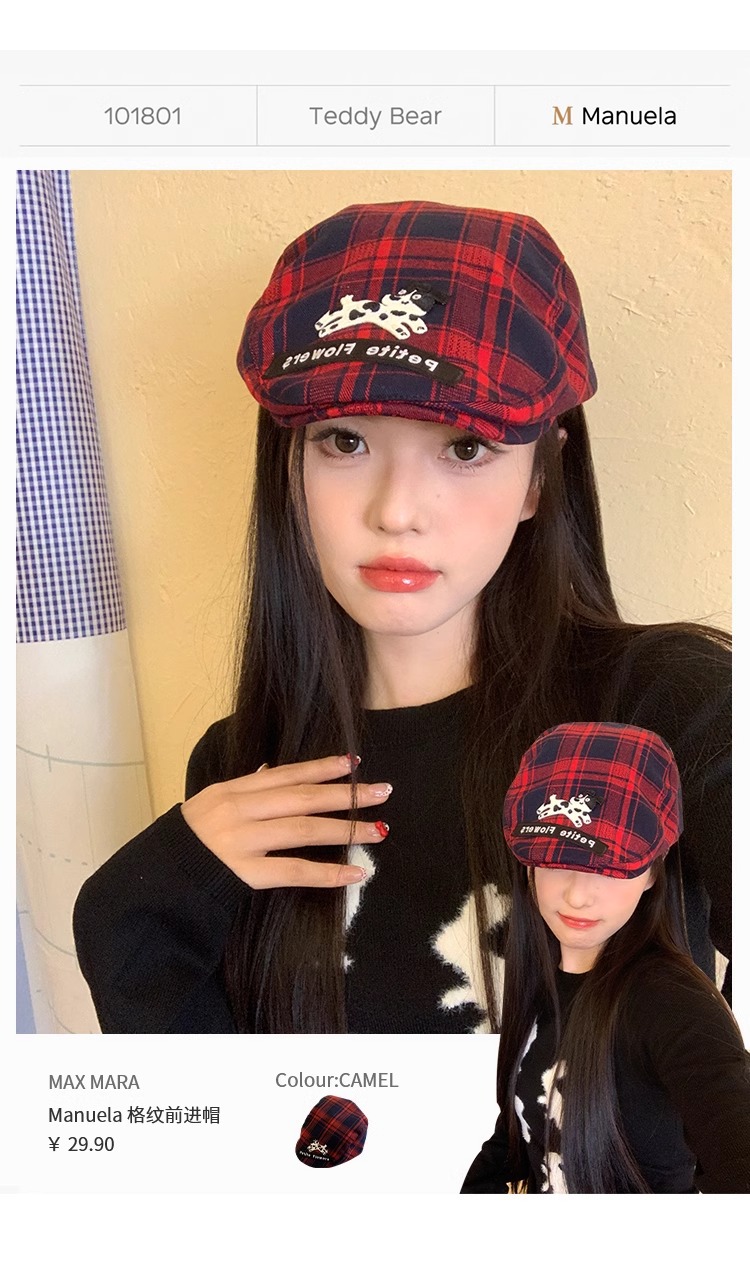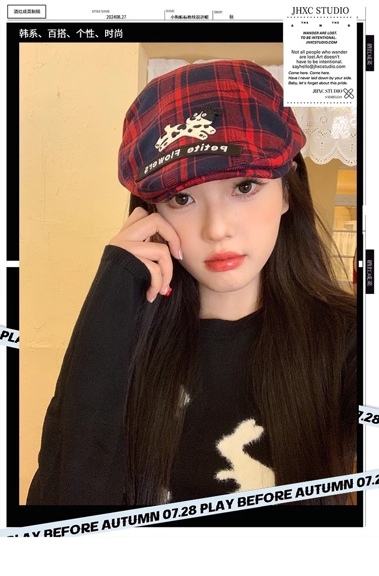 한국식 붉은 격자 무늬 강아지 앞으로 모자 여성 봄과 가을 올 매치 틈새 베레모 큰 머리 둘레 얼굴 작은 모자스토어 가기