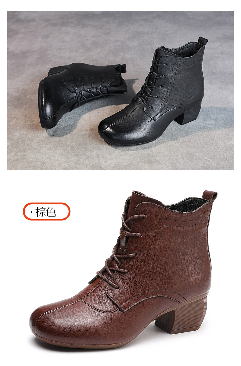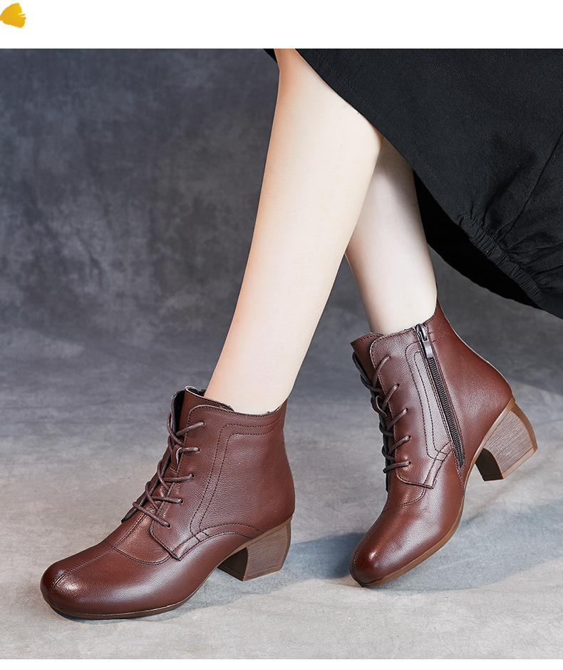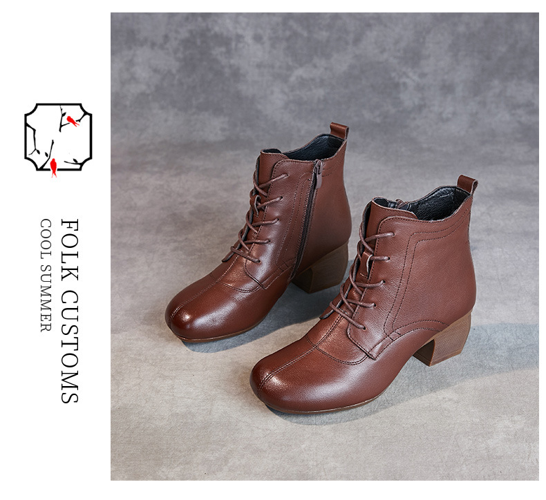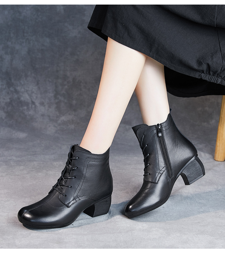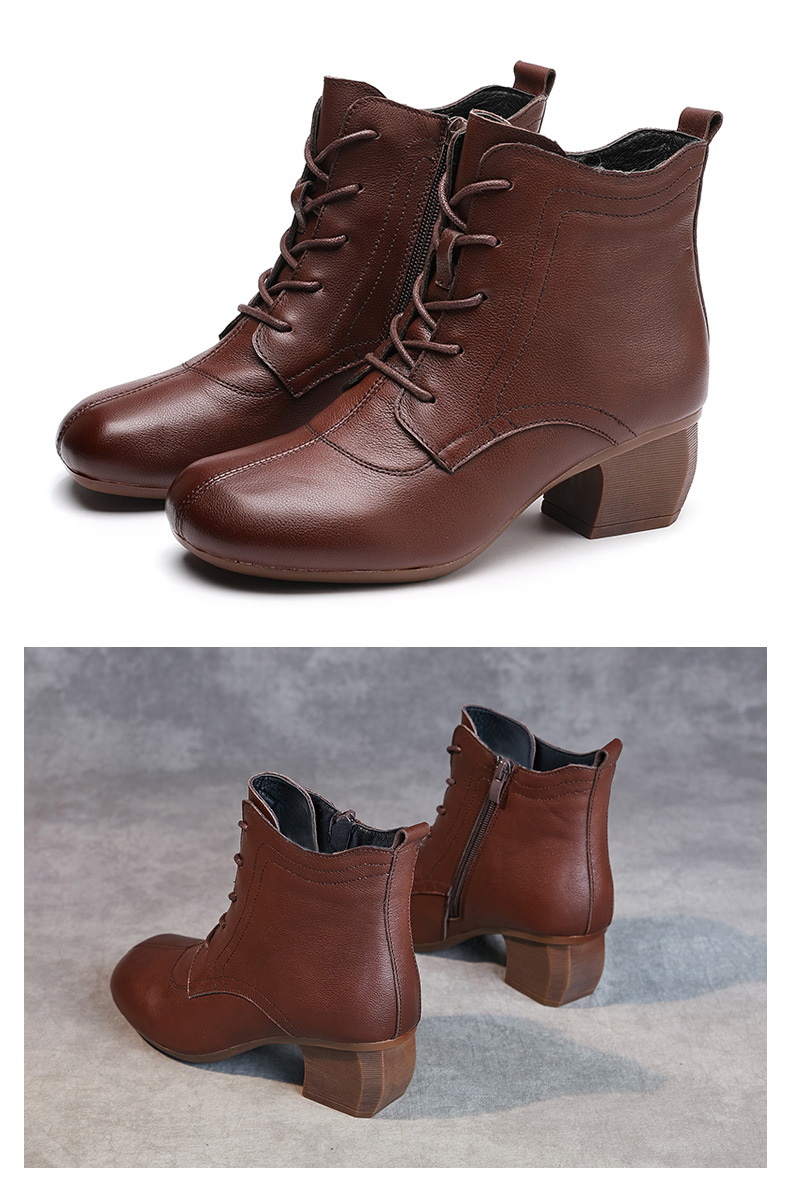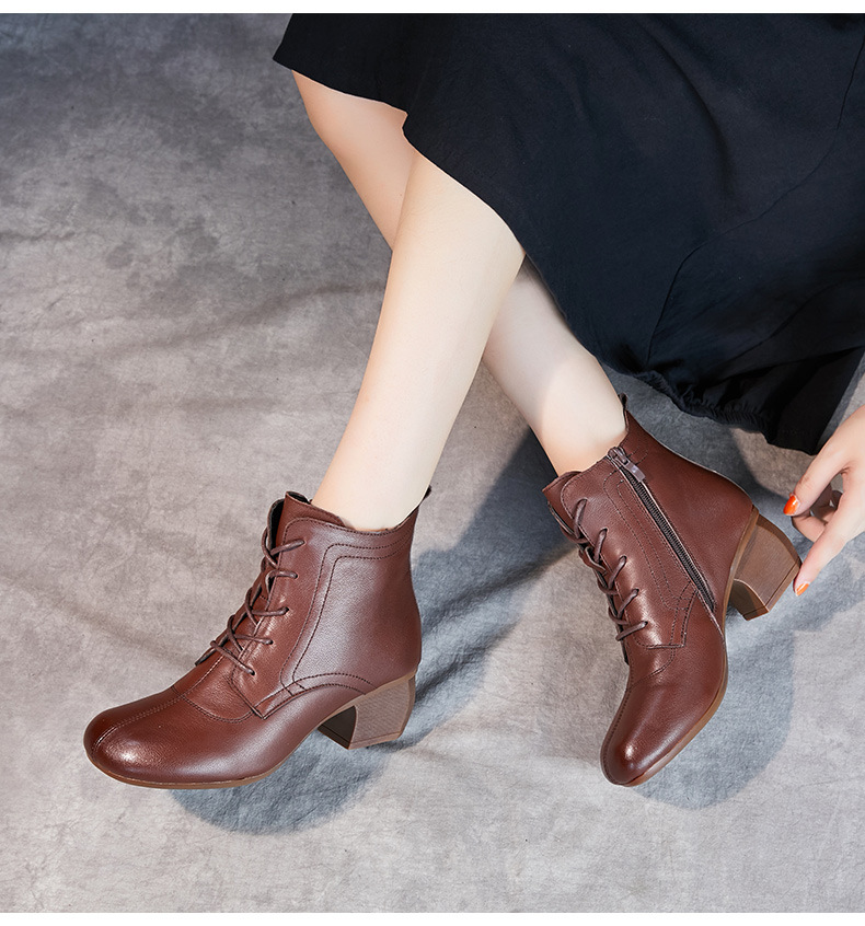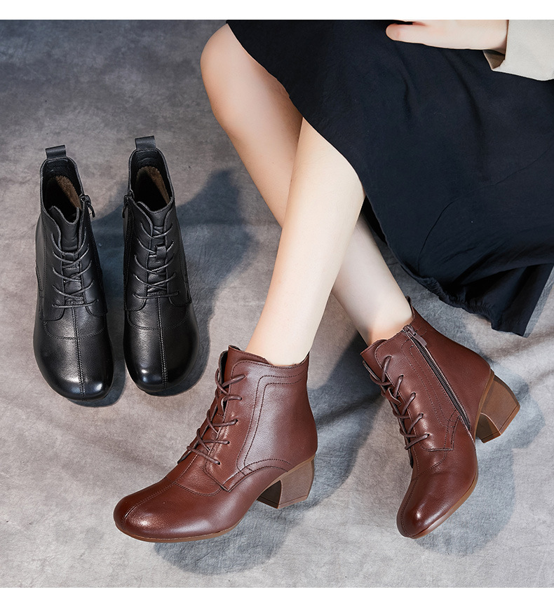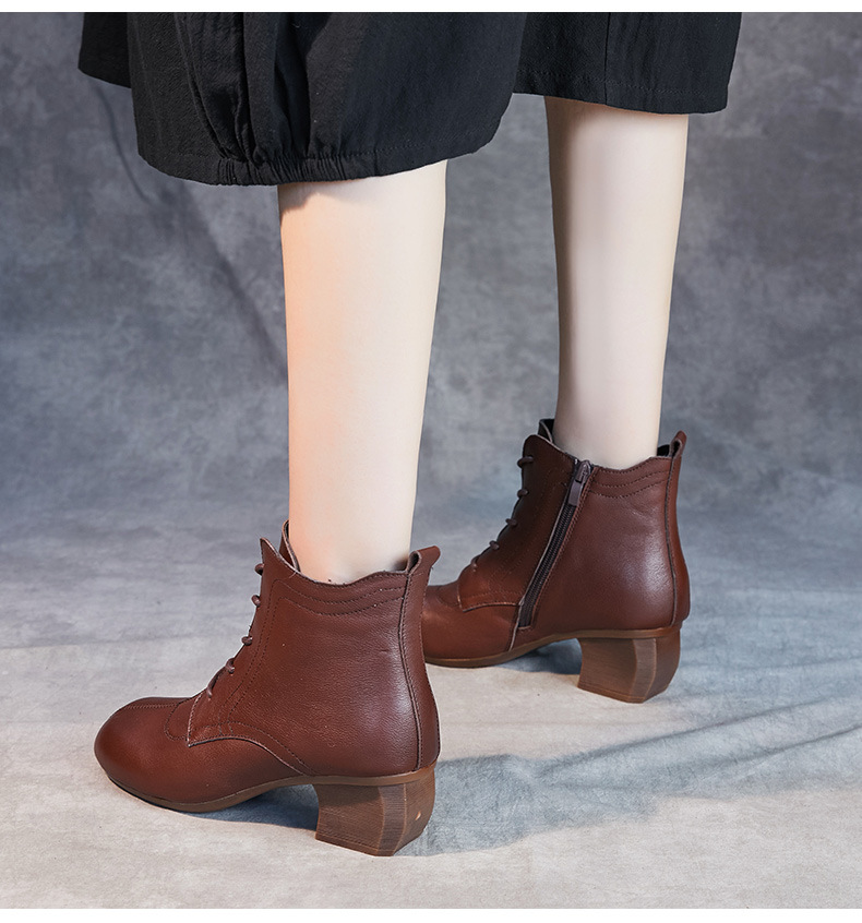 영국 스타일 빈티지 쇼트 부츠 여성용 청키 힐 미드 힐 라운드 발가락 마틴스 부츠 Cowhide 하이힐 사이드 지퍼 레이스 업 마더 부츠