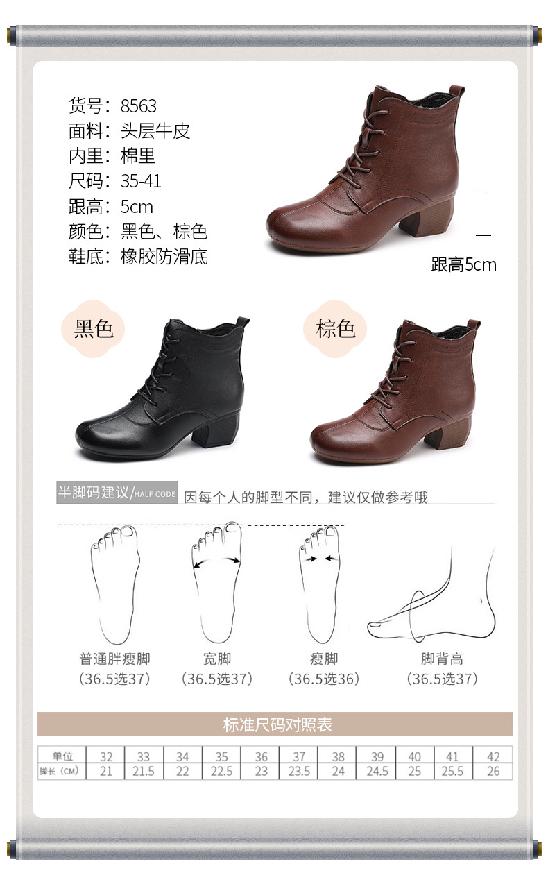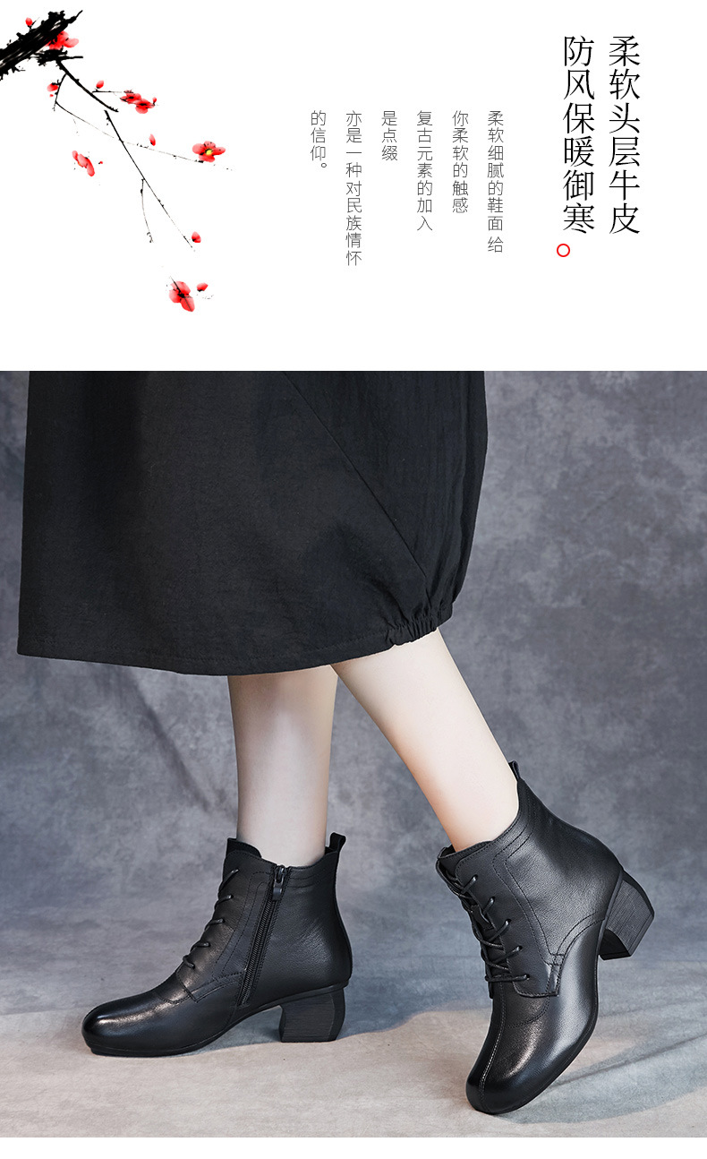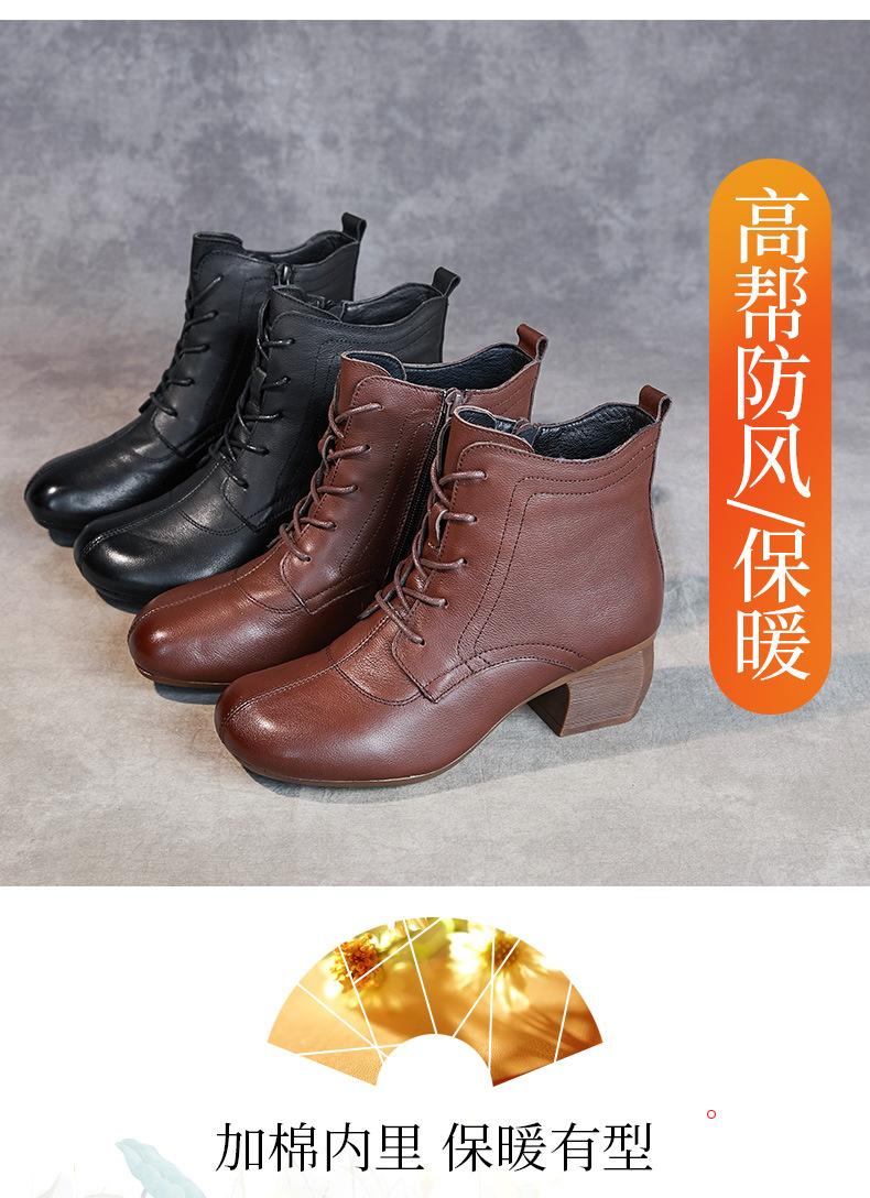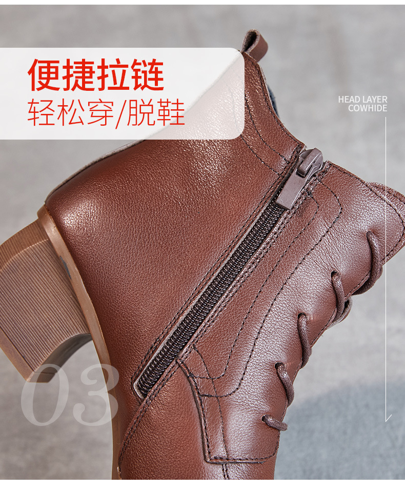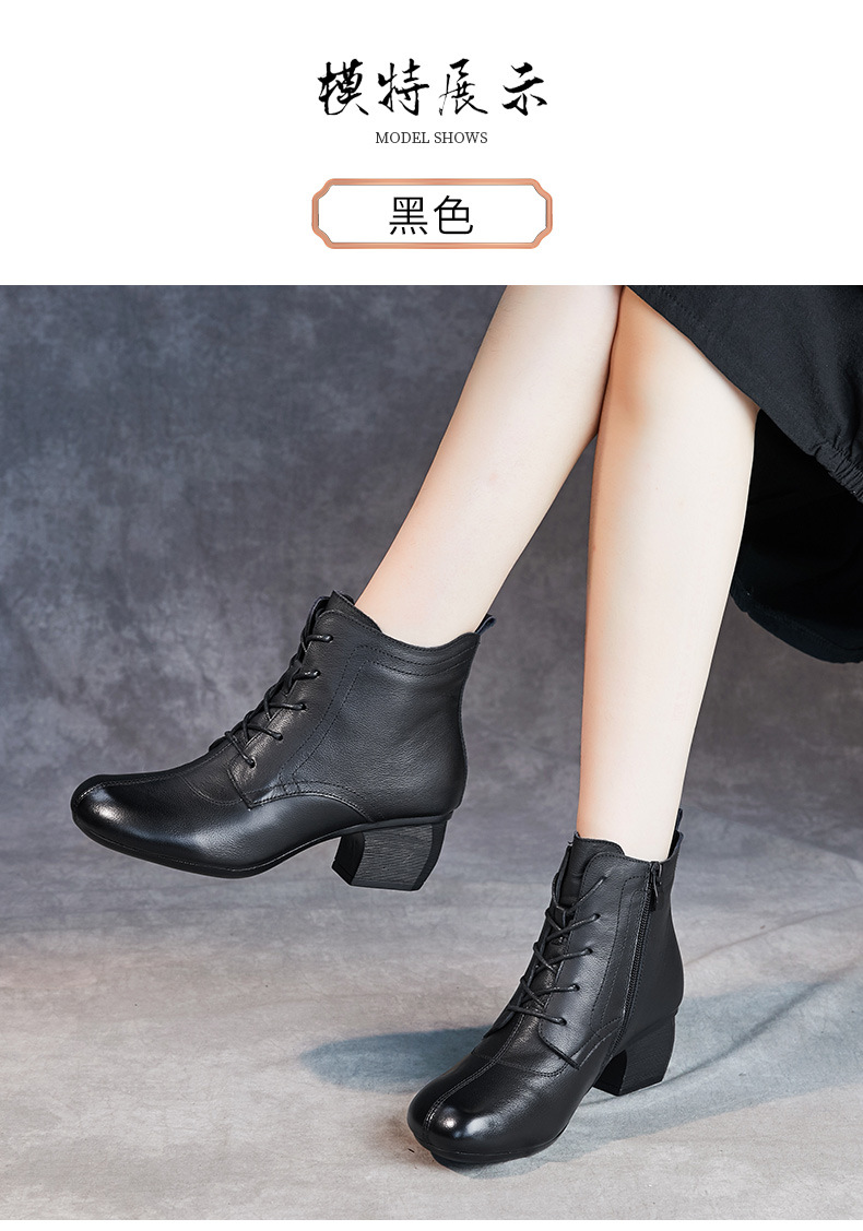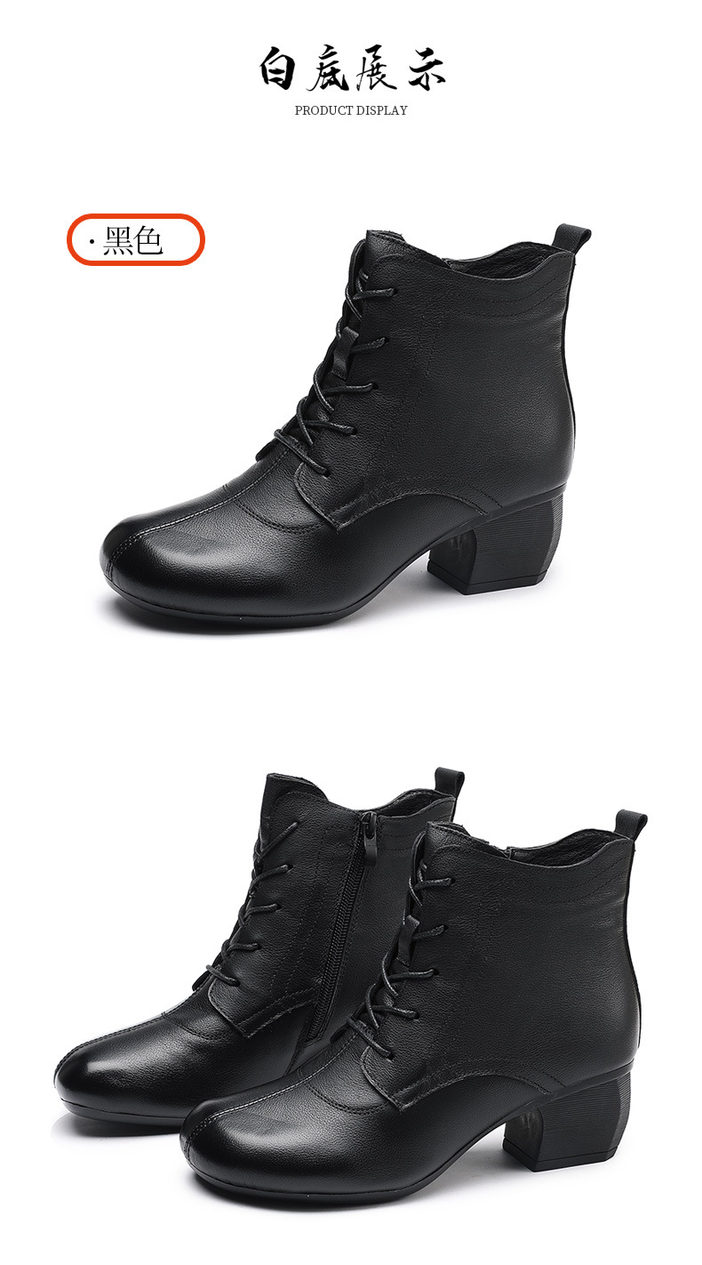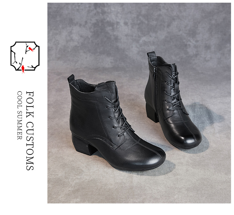 영국 스타일 빈티지 쇼트 부츠 여성용 청키 힐 미드 힐 라운드 발가락 마틴스 부츠 Cowhide 하이힐 사이드 지퍼 레이스 업 마더 부츠