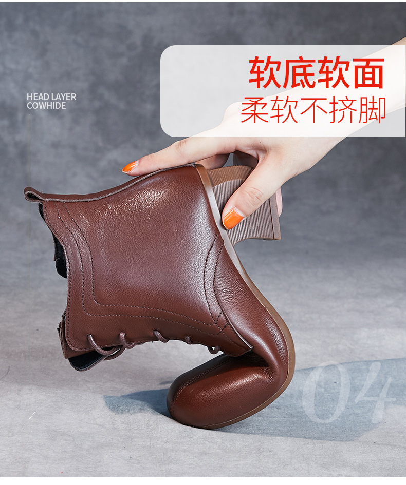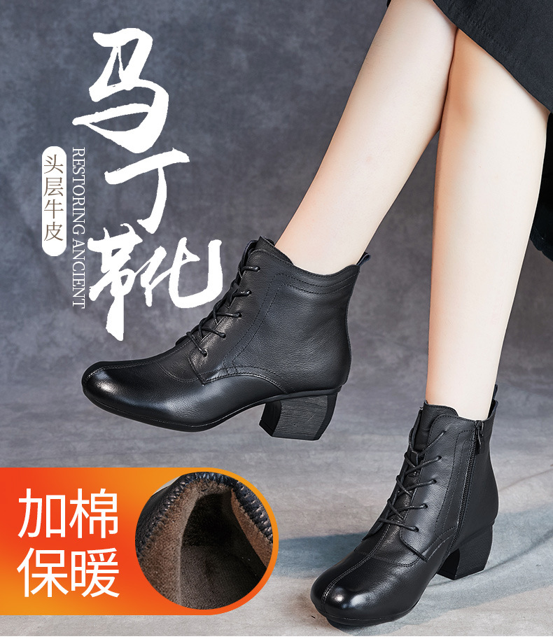 영국 스타일 빈티지 쇼트 부츠 여성용 청키 힐 미드 힐 라운드 발가락 마틴스 부츠 Cowhide 하이힐 사이드 지퍼 레이스 업 마더 부츠스토어 가기
