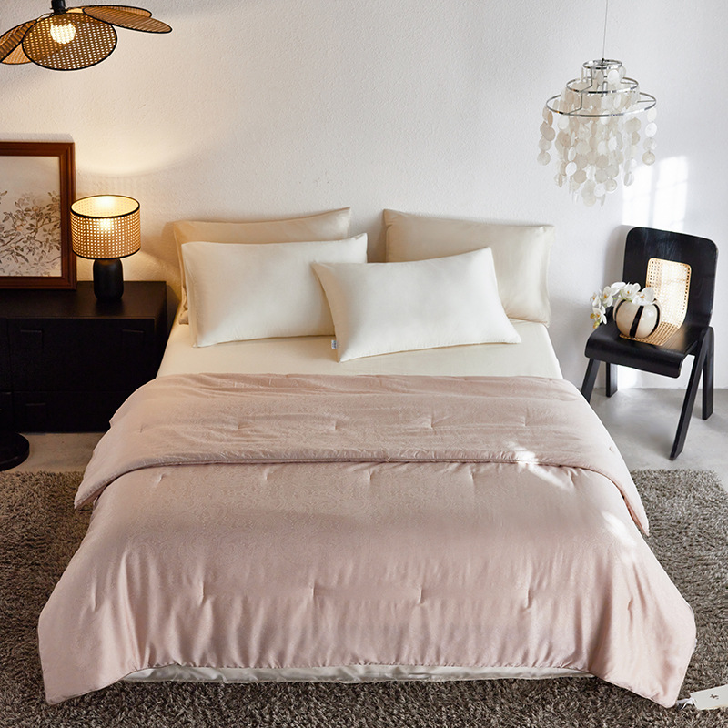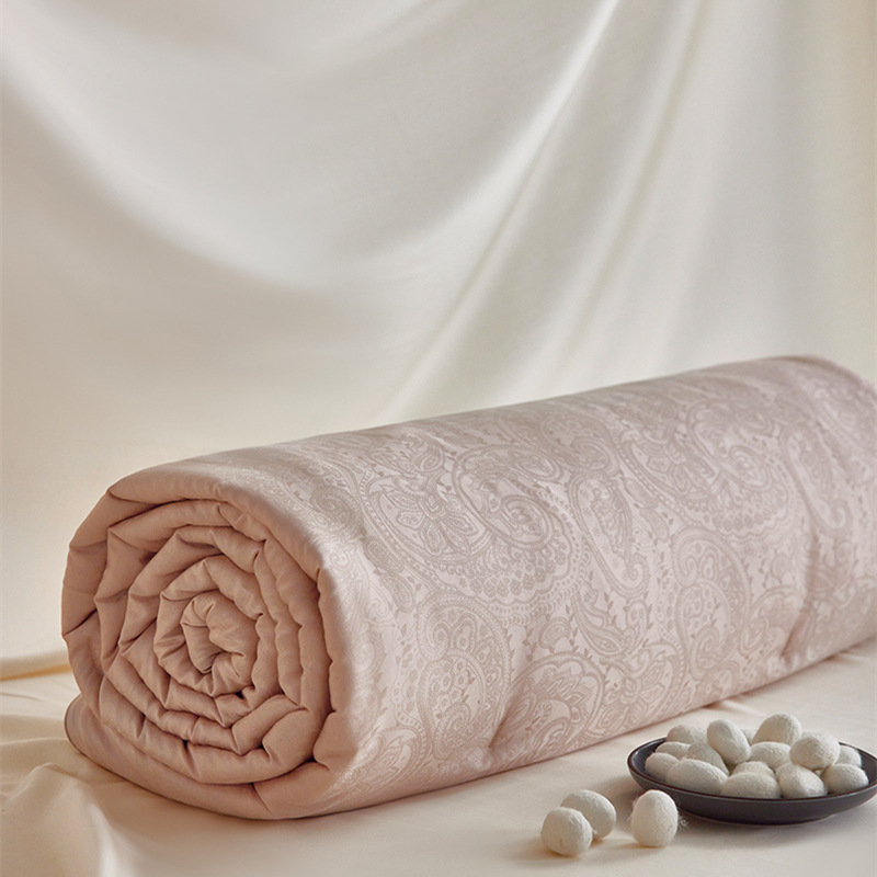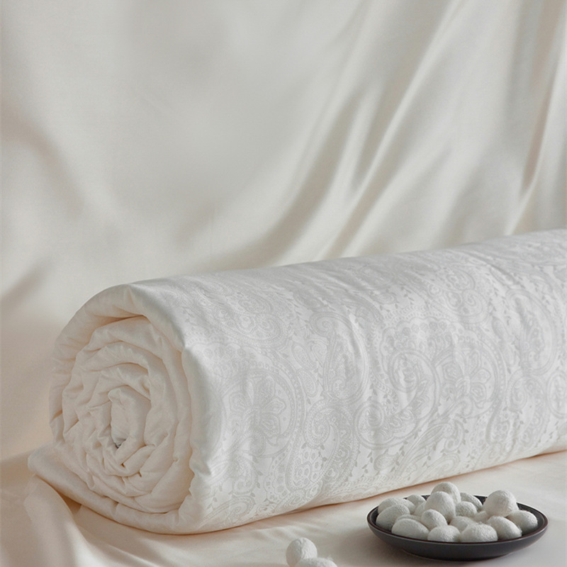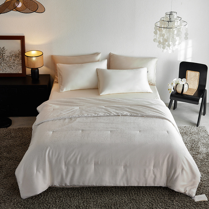 【柞蚕丝】为纯野生蚕丝,纤维粗、蓬松、挺括、纤维内部组织多孔隙,又产自北方寒带,保暖性和弹性好,是制作蚕丝被产品的优质原料。由于柞蚕丝的纤维略粗于桑蚕丝,它的耐用性更好,也不易钻出被面。柞蚕丝作为天然蚕丝的一种,富含各种蛋白质和氨基酸,有淡淡蚕丝清香,适用于儿童老人,易过敏人群。