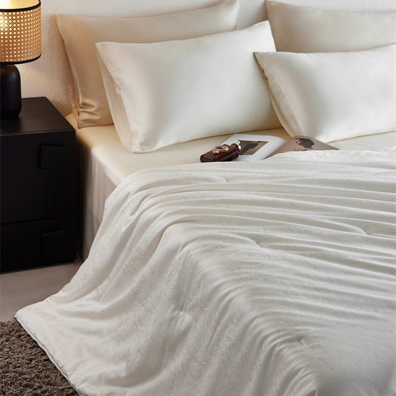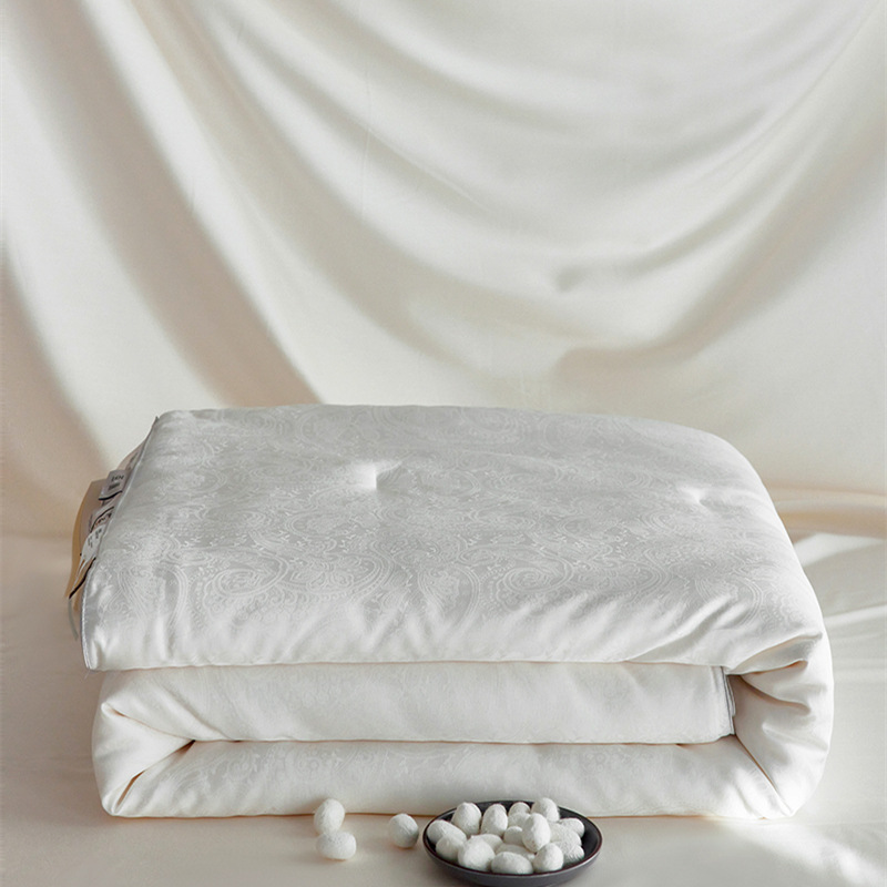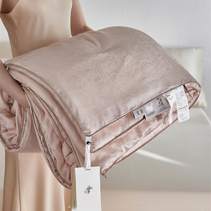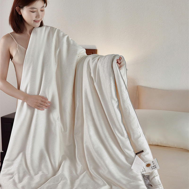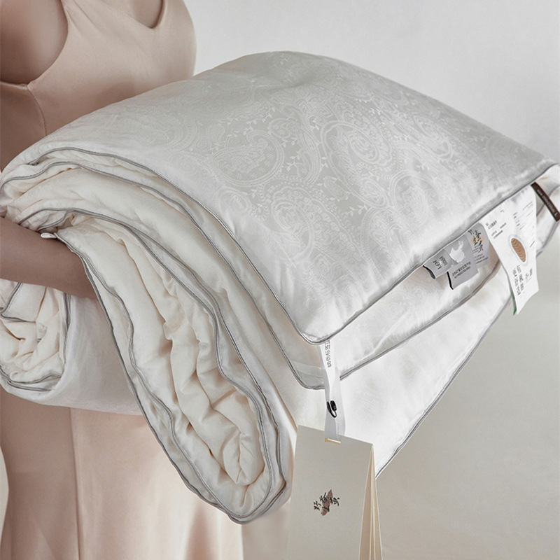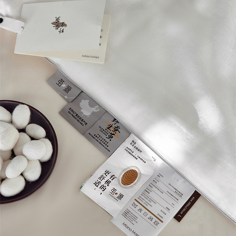 每条蚕丝被都配有精美包装,成套吊牌,质检报告,吊牌末页有机码可扫码查询编号及填充重量。