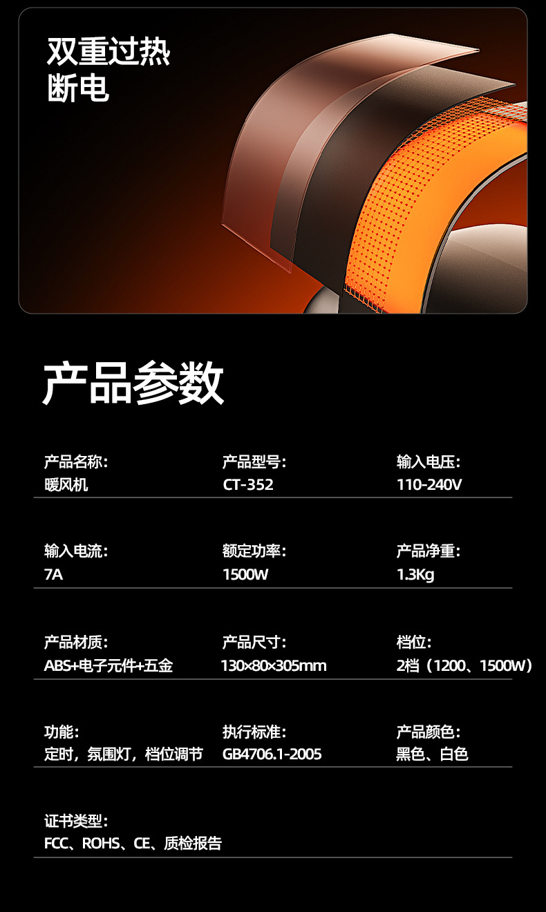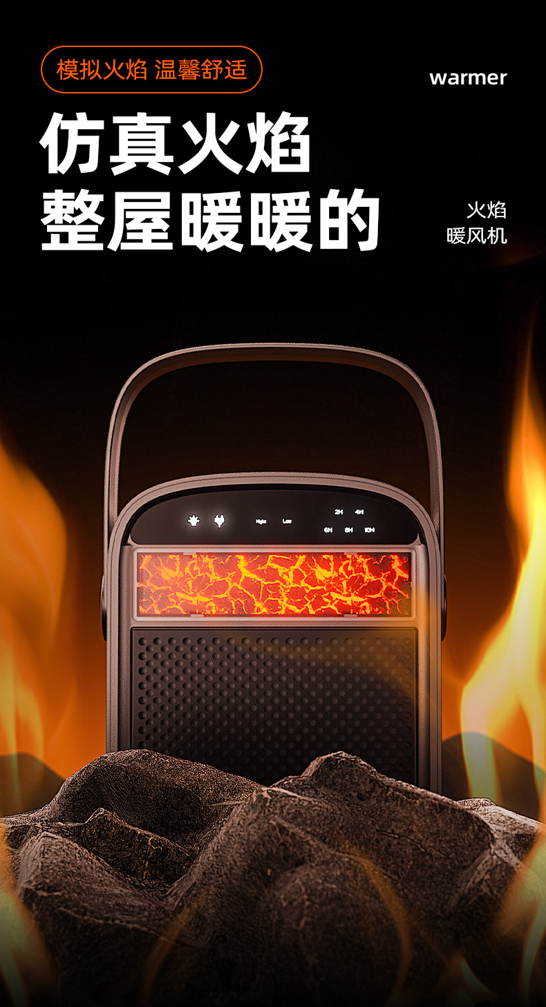 2025年新款1500W暧风机,产品宽电压输入:110V-240V,功能:两档调节,火焰氛围灯,定时功能,遥控器操作,倾倒断电,过温保护,可根据客户定制不同的地区规格安规电源线。产品采用陶瓷PTC发热原理,安全稳定。